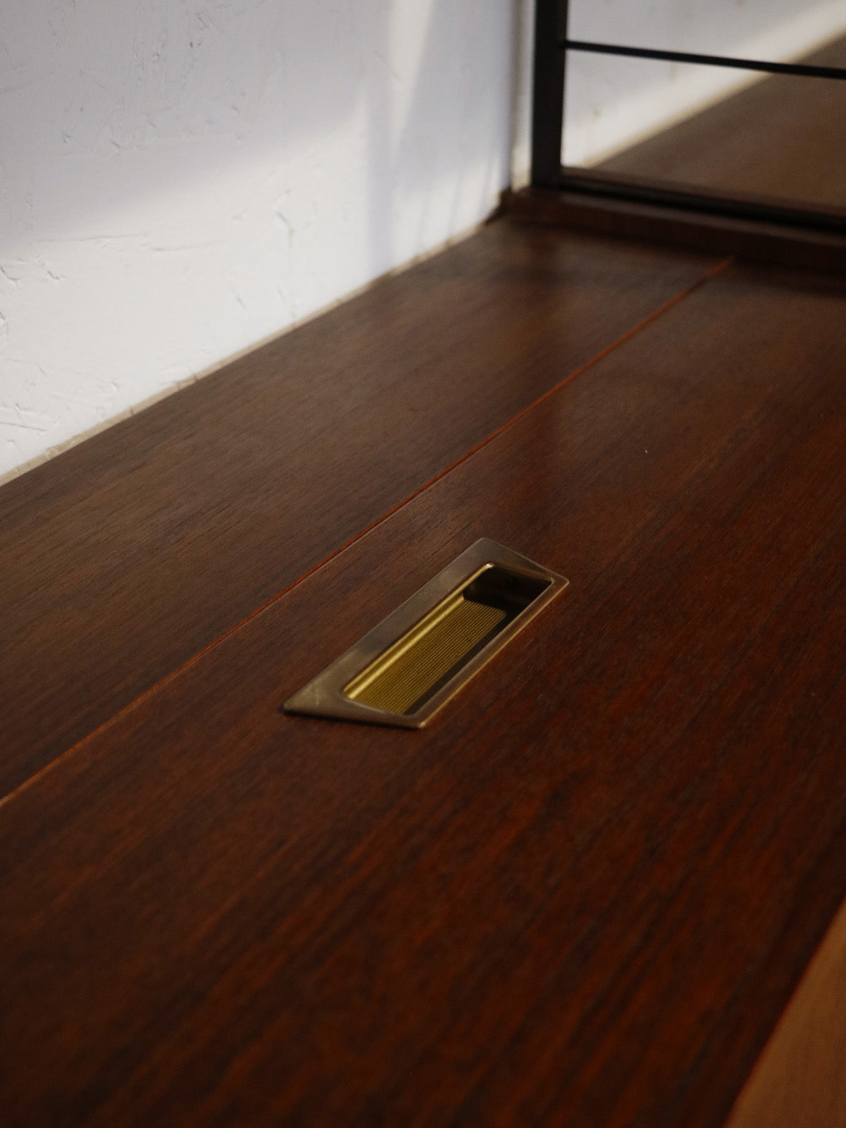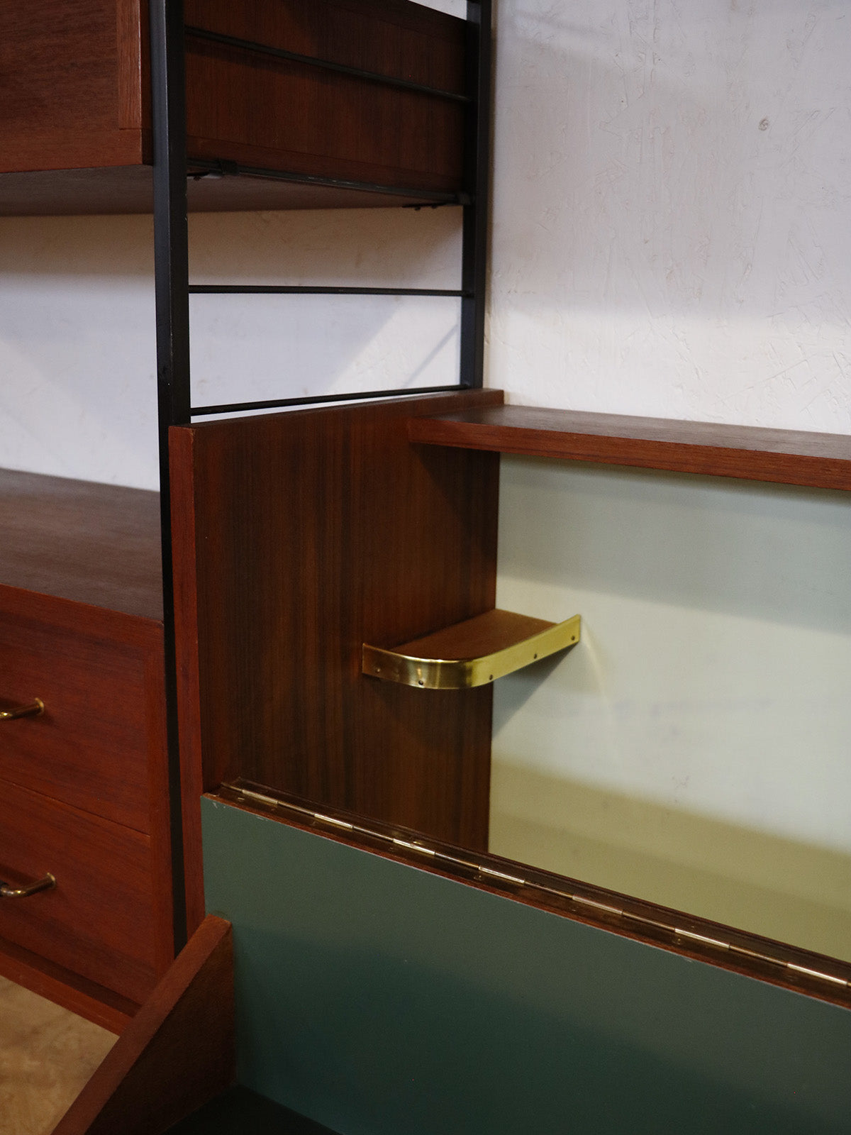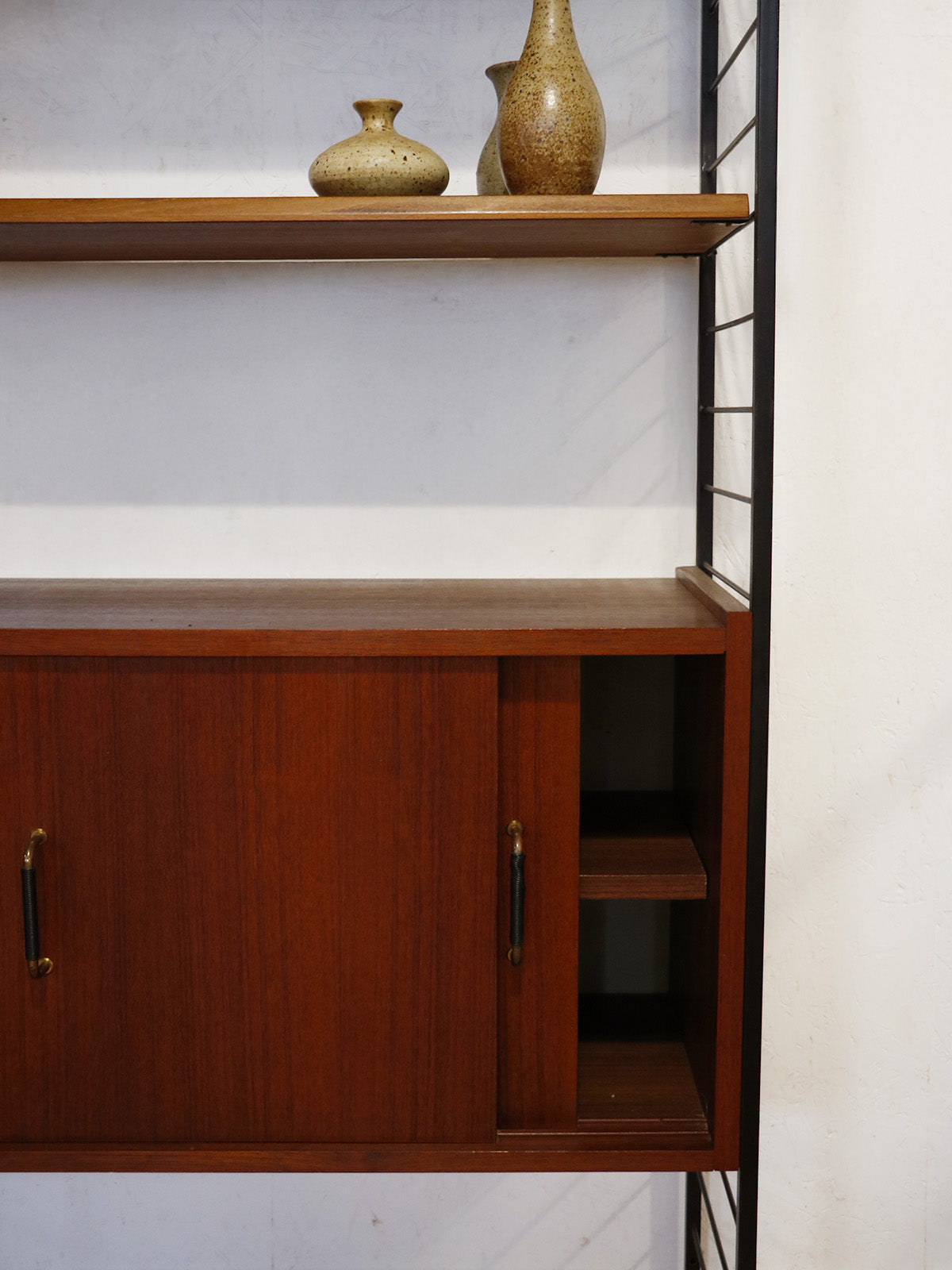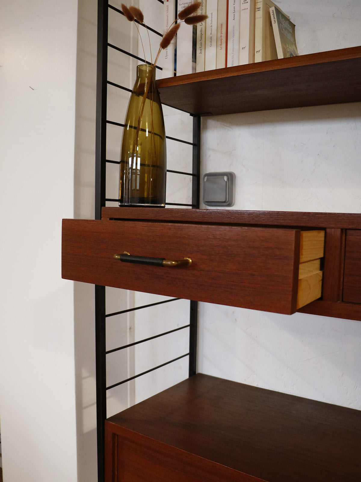 Discover this 1960s teak wall unit, punctuated by four black metal ladders and featuring retro modular lines. Comprising seven shelves, a chest of drawers, a bar, sliding doors, and a glass-fronted cabinet, it offers ample storage and display space for dishes, books, or decorative objects. Its shallow depth and elongated proportions integrate elegantly into a living room or dining room, creating a warm and organized atmosphere.