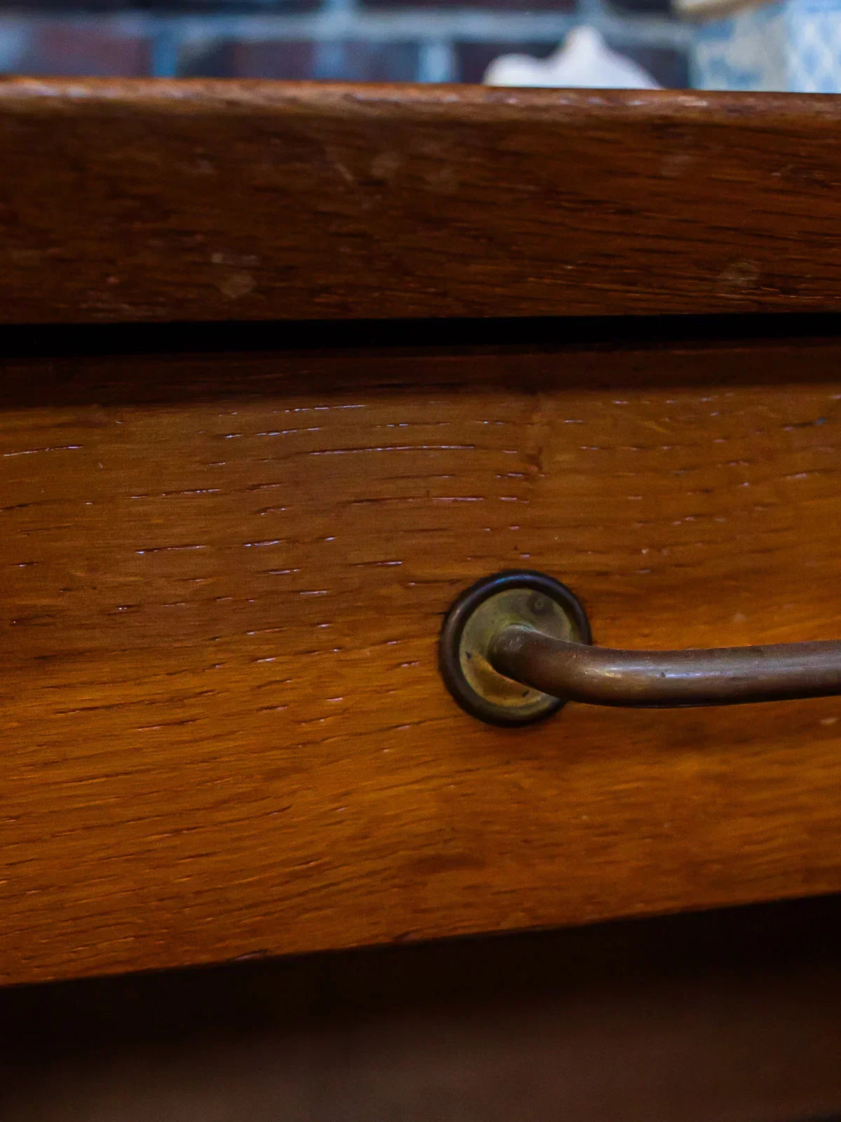 Discover this charming little bedside table from the 50s and 60s, which combines elegance and functionality. Made from oak veneer, it stands out with its iconic compass legs and its practical drawer with a delicate brass handle. Perfect for adding a vintage touch to your bedroom, this table will blend harmoniously into any style of decor while providing subtle storage space.