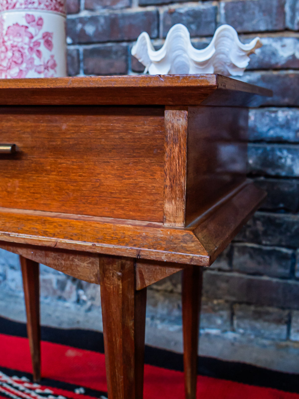 This 1960s mahogany bedside table combines elegance and functionality with its retro design and practical drawer. Its neat finish highlights the natural wood grain, bringing a warm touch to your bedroom. Ideal for complementing your vintage decor, this piece of furniture adapts equally well to modern interiors and more classic settings. Treat yourself to a unique piece that combines old-world charm and contemporary utility. The wood shows some signs of wear.
