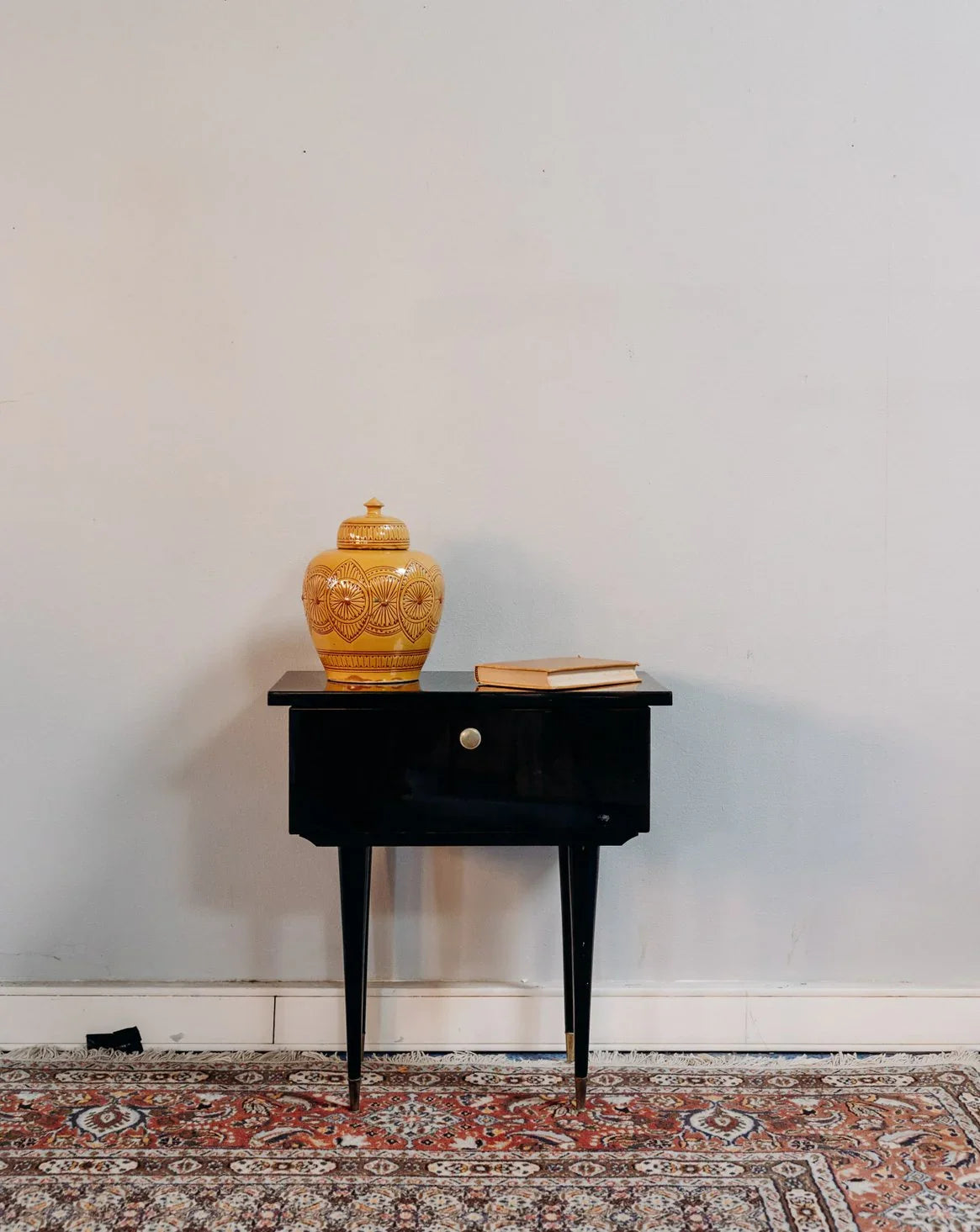 Choose this small bedside table in dark wood with a black finish, enhanced by slender, tapered metal legs that give it a sleek, graphic silhouette. Its drop-down shelf offers discreet storage for your books and bedside essentials, complemented by a small, discreet handle for simple and elegant opening. Compact and well-proportioned, this piece fits easily next to the bed or in a small corner, bringing a warm and refined atmosphere to the bedroom.