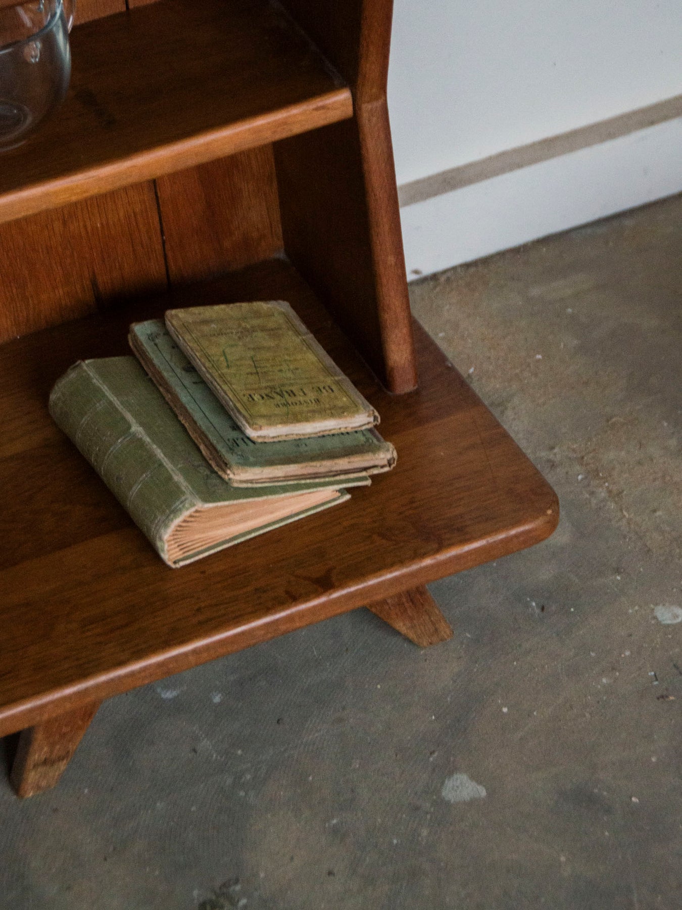 Embrace this small wooden bedside table with its contrasting light and dark tones, featuring a raised top and splayed legs that lend it an elegant, slightly retro silhouette. Its two niches offer convenient storage for lamps, books, and accessories, while its compact size fits easily into bedrooms or small reading nooks. The warmth of the wood brings a soft, authentic feel to both contemporary and vintage décor. Minor marks on the top.
