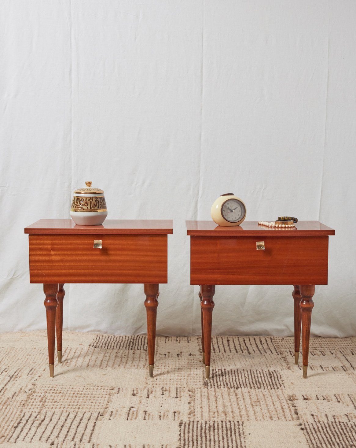Choose a pair of small, 1970s-style bedside tables with a warm varnish and elongated proportions that blend elegantly into a contemporary or retro interior. Each table offers convenient storage for a lamp, book, or bedside essentials, while their discreet size fits easily into a bedroom or small sleeping area. The varnished finish accentuates the wood's natural texture and creates a soft, cozy atmosphere, perfect for relaxing.
