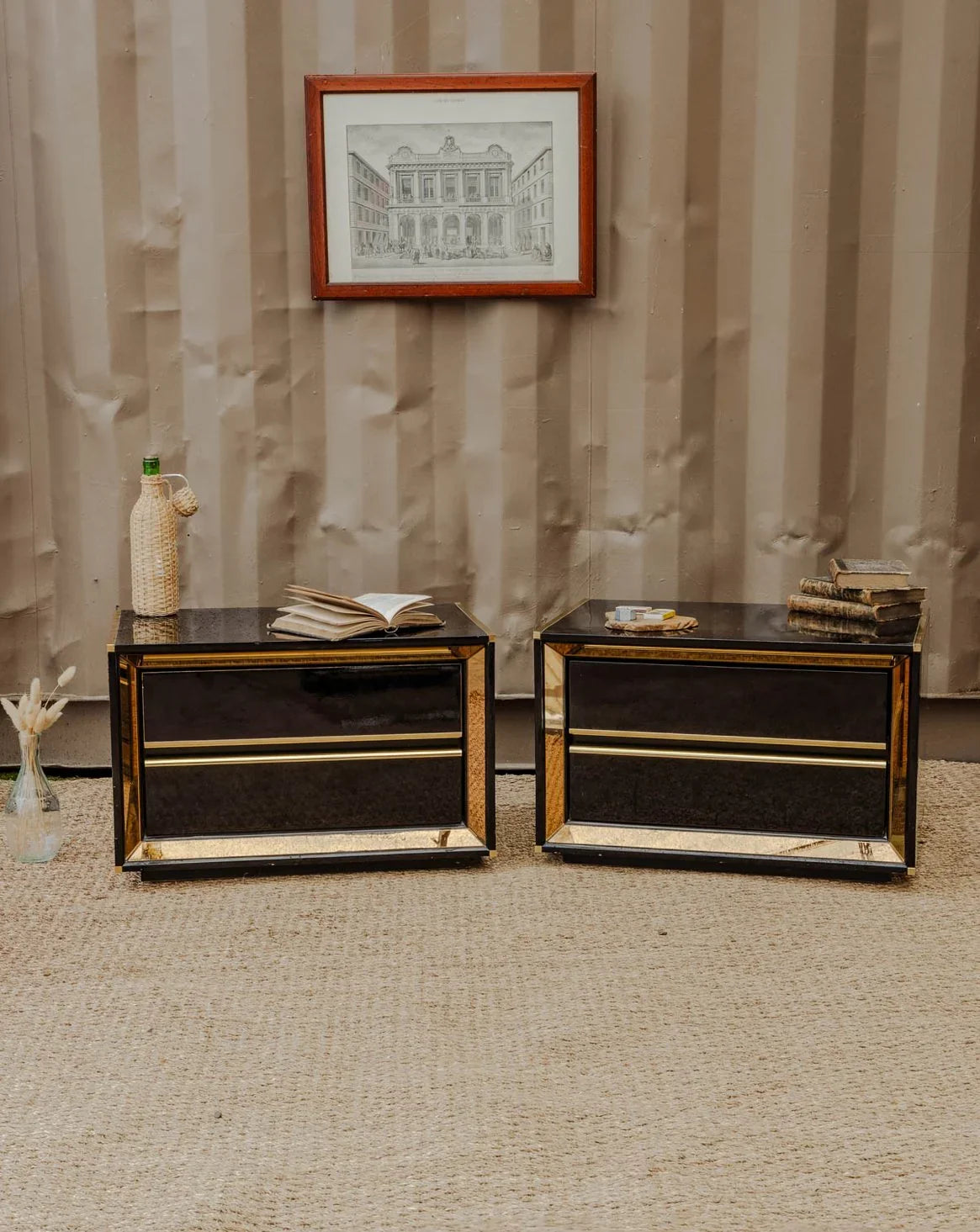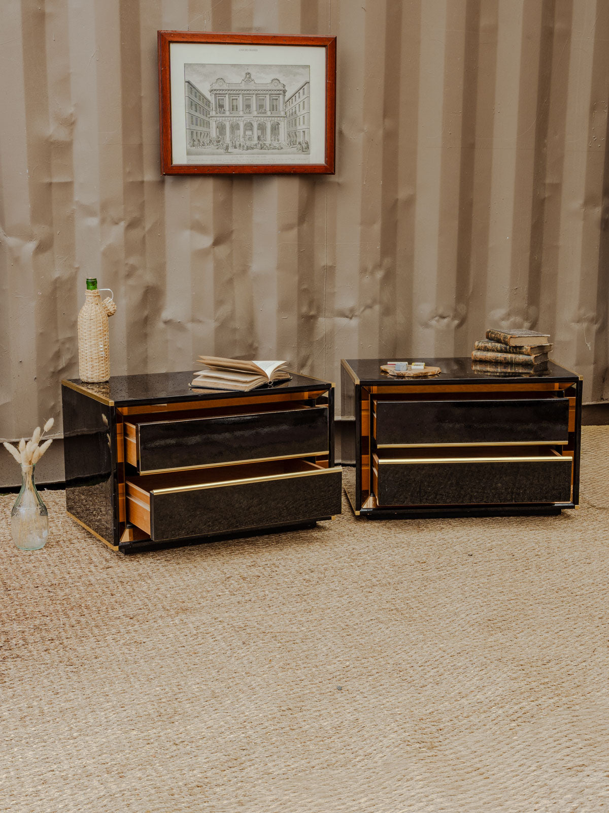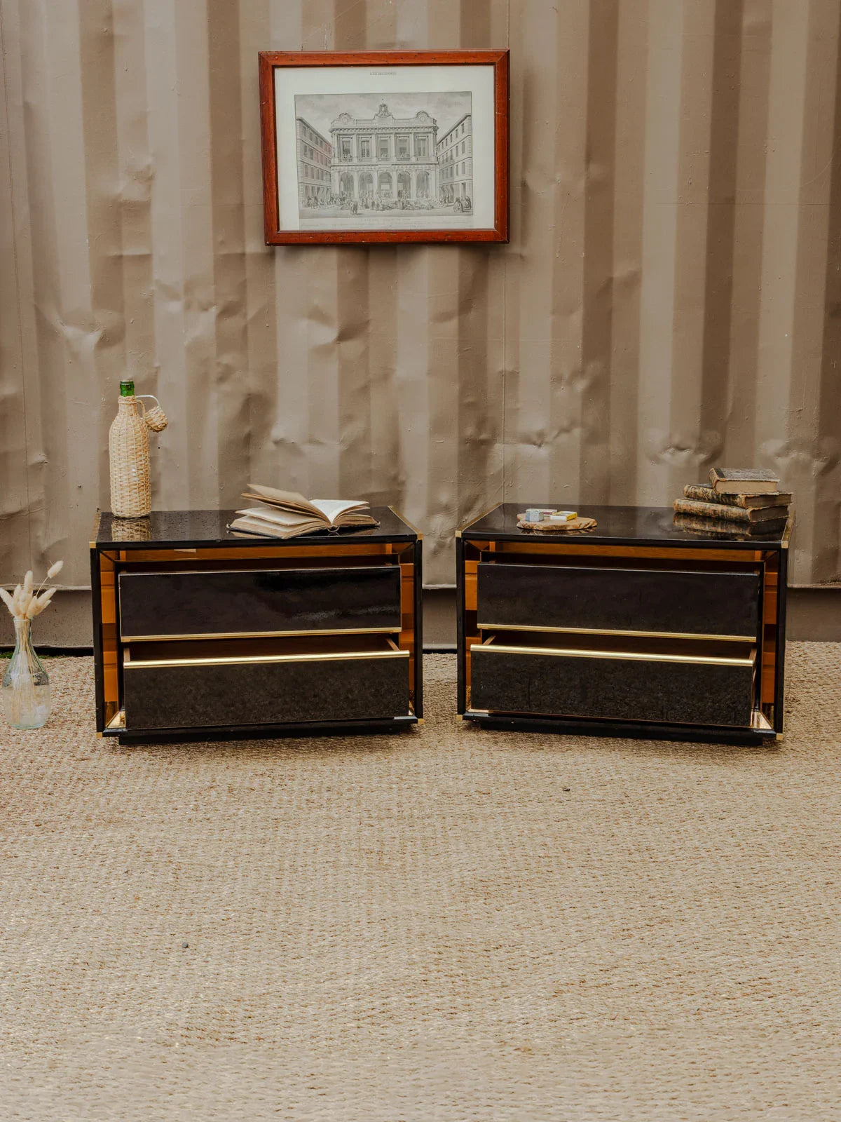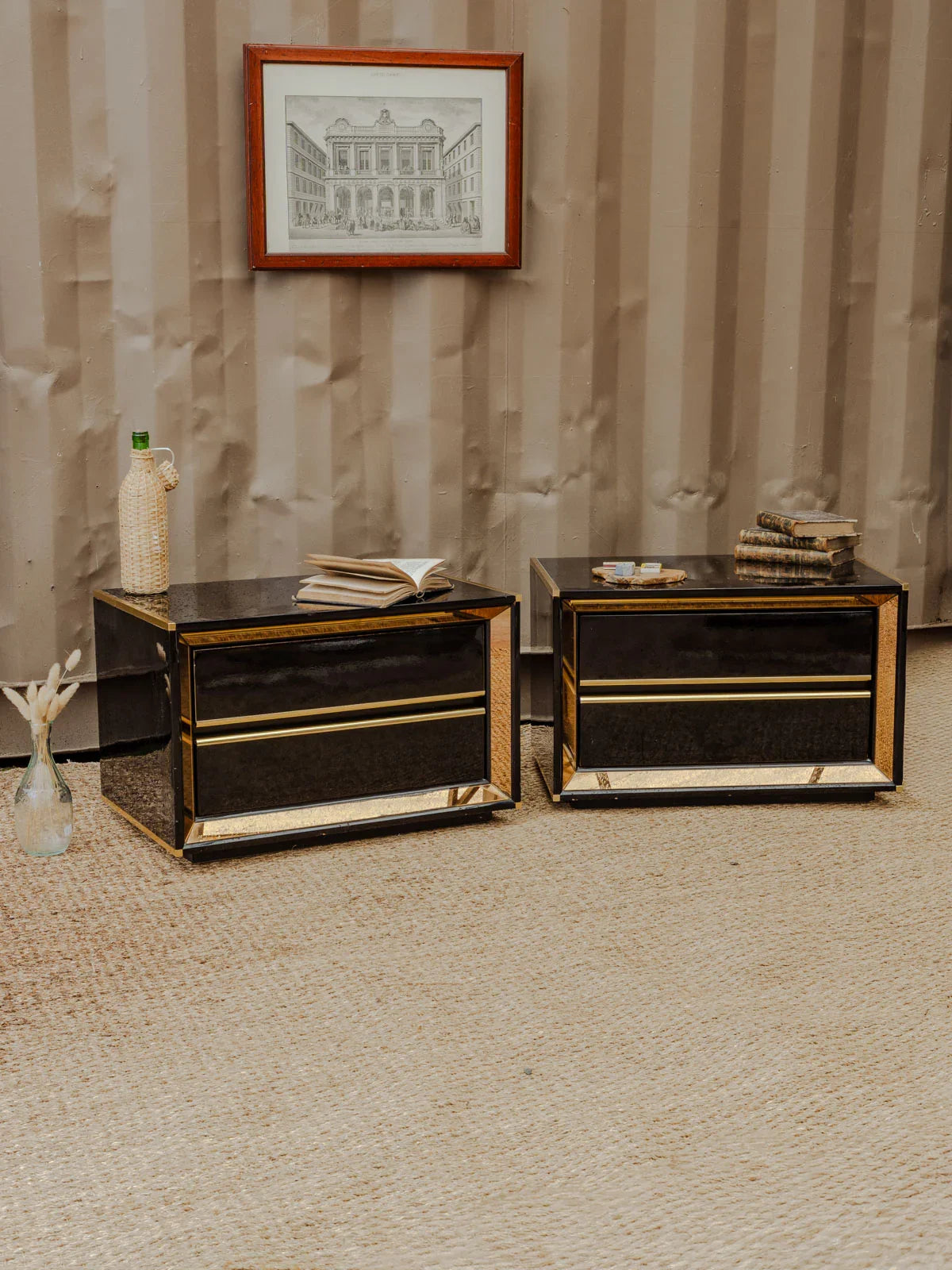 Add a touch of retro chic with this set of two bedside tables or side tables in black lacquered wood, enhanced with gold details that define their silhouette. Each offers two drawers for discreet storage and proportions suitable for a bedroom or living room corner, while their finish contrasts between understated elegance and a touch of brilliance to create a warm and refined atmosphere. Some signs of age and minor chips on the tabletops.