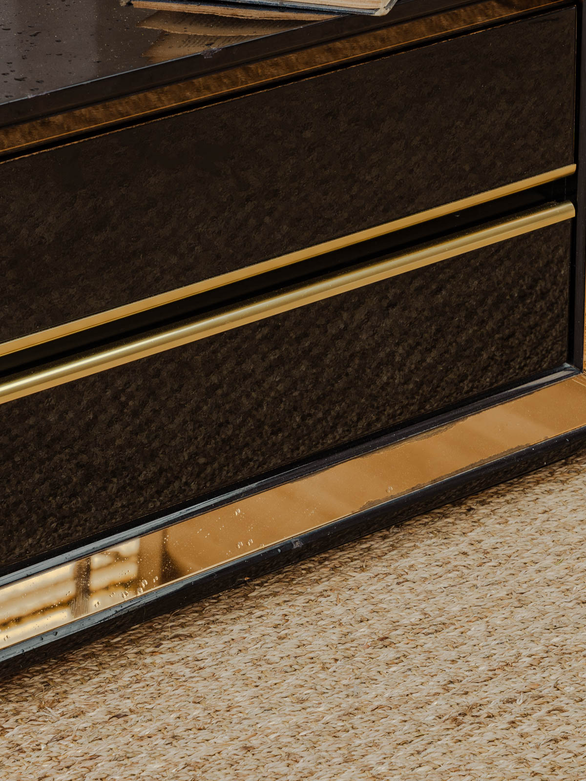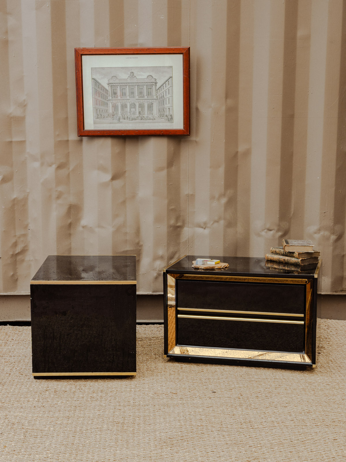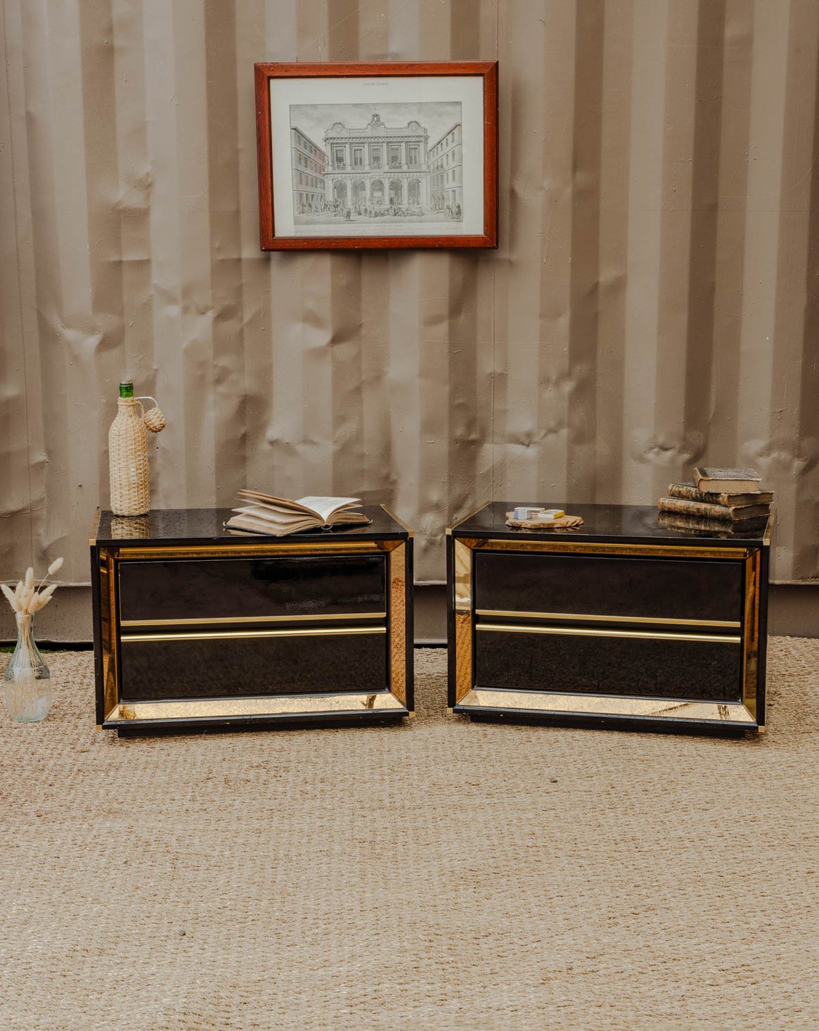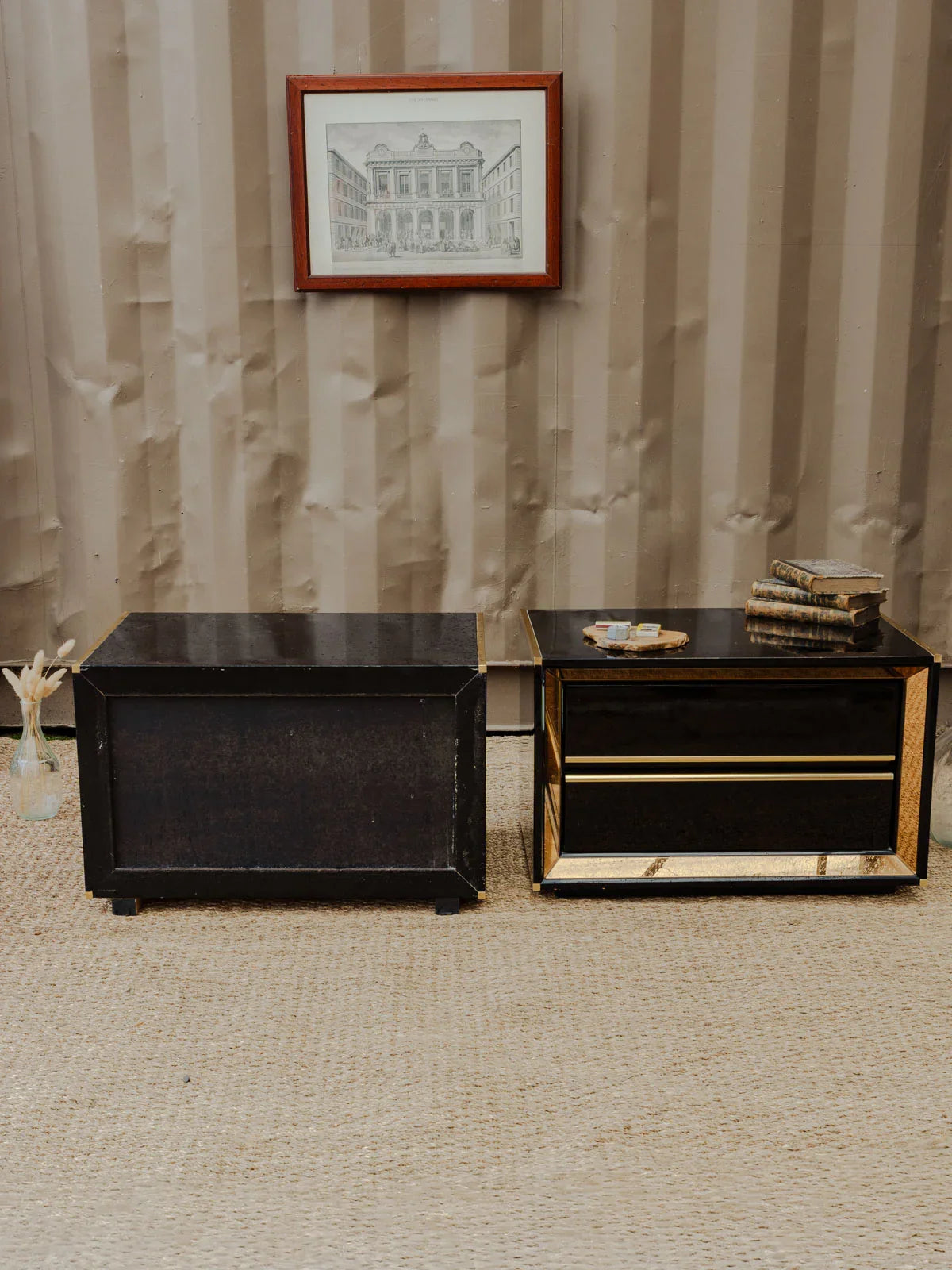 Add a touch of retro chic with this set of two bedside tables or side tables in black lacquered wood, enhanced with gold details that define their silhouette. Each offers two drawers for discreet storage and proportions suitable for a bedroom or living room corner, while their finish contrasts between understated elegance and a touch of brilliance to create a warm and refined atmosphere. Some signs of age and minor chips on the tabletops.