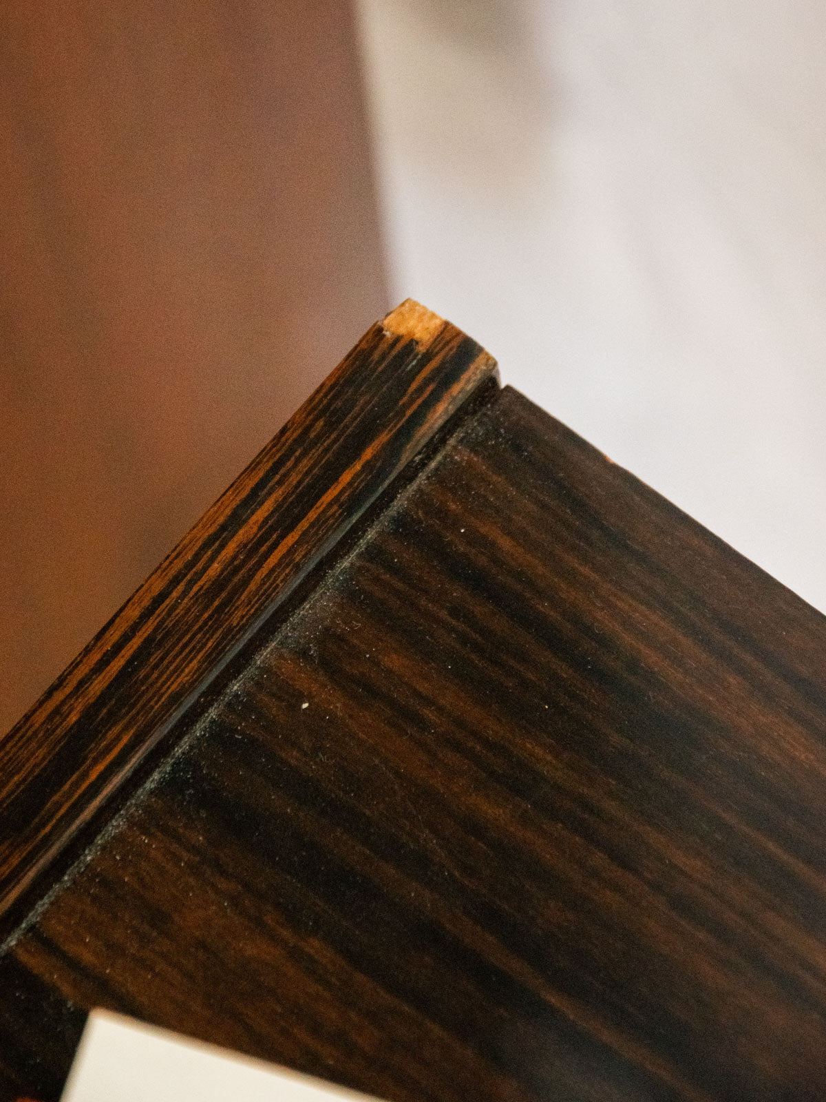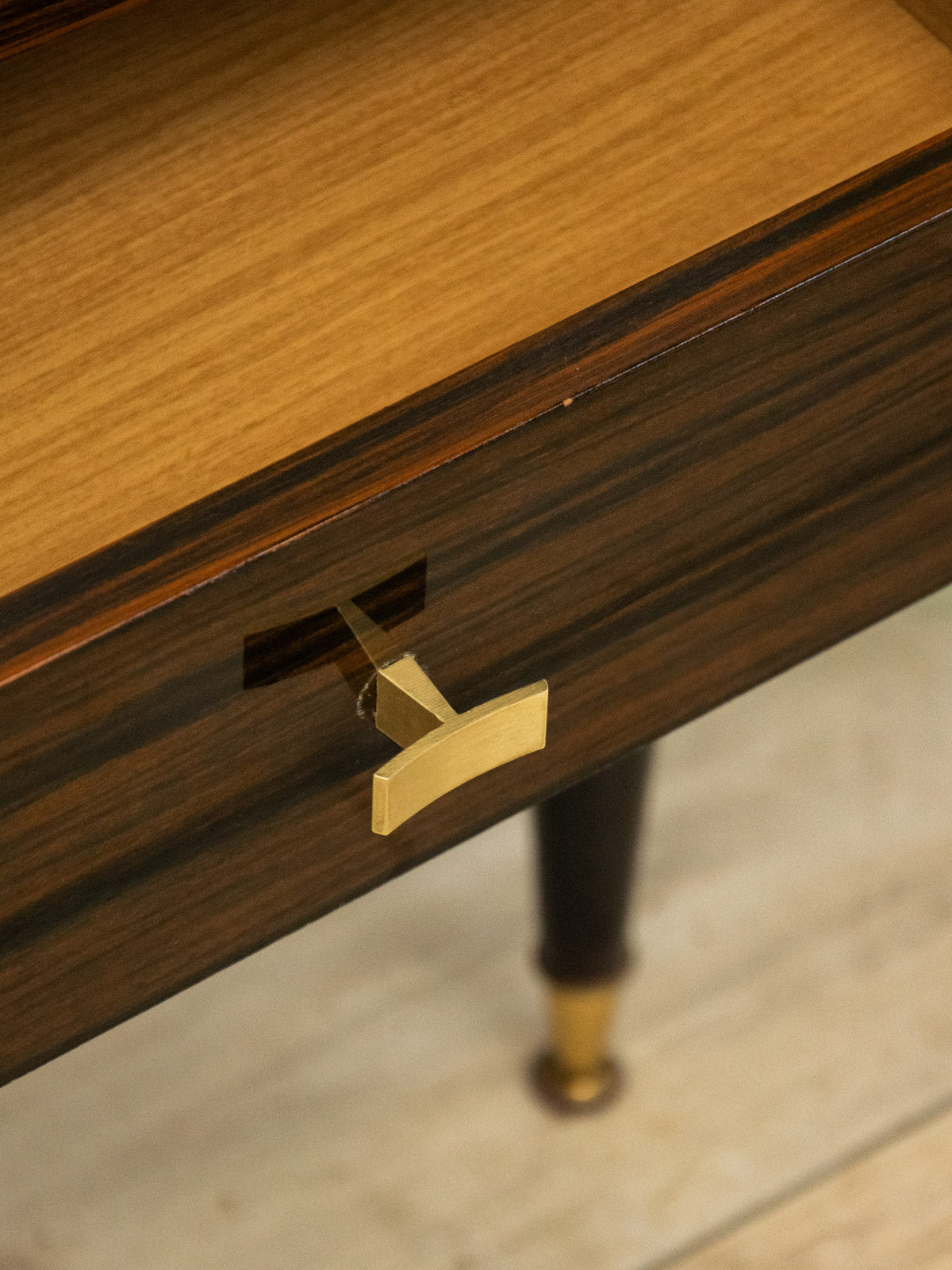 Bring a touch of retro charm to your bedroom with this Formica-style lacquered wood bedside table, enhanced with a gold handle and matching foot caps. Its small drawer offers discreet storage for your nighttime essentials, and its compact proportions make it ideal next to a bed or in an alcove. The glossy finish and metallic details add a stylish and luminous touch to a decor that blends vintage and contemporary styles. There is a small chip on the back left corner.