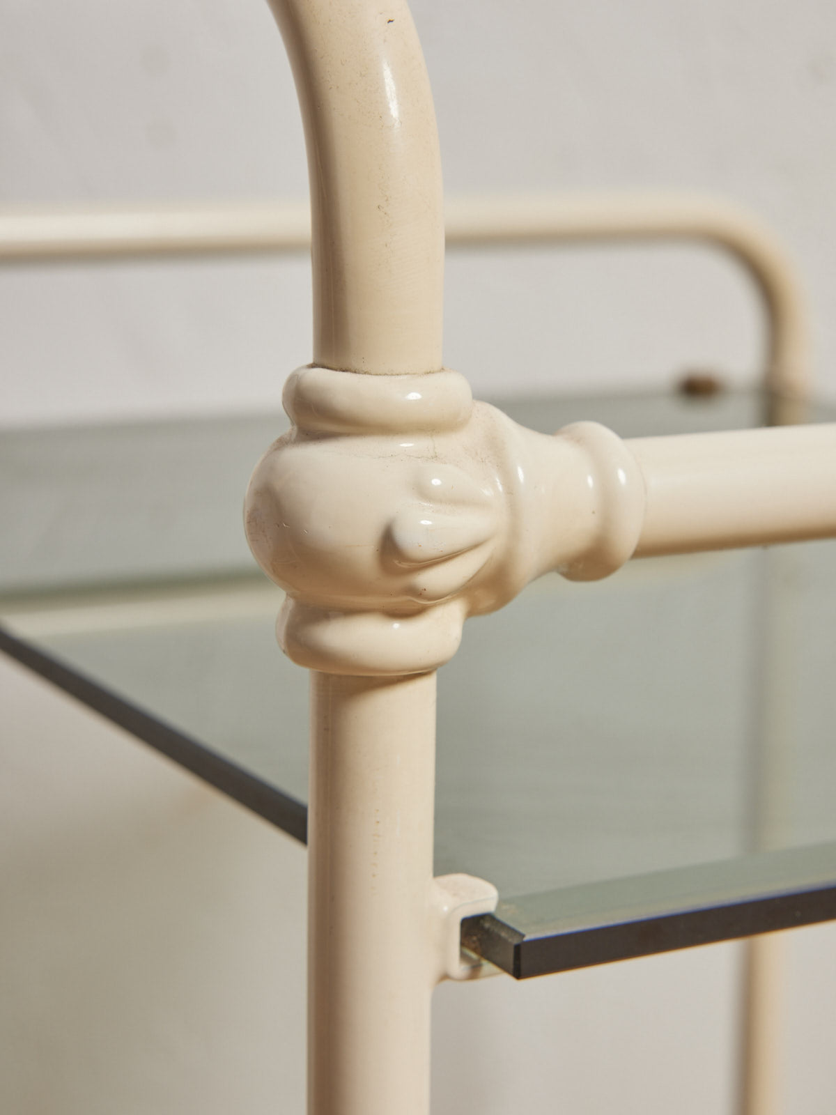 Discover this pair of metal and smoked glass bedside tables with a compact and airy design, ideal for structuring a contemporary bedroom. The glass tops offer a discreet surface for a lamp and books, while the metal frame ensures sturdiness and visual lightness, suitable for smaller spaces. Their understated appearance creates a soft and subdued atmosphere, perfect for a minimalist and warm decor. One of the bedside tables is missing a fastener, but this does not affect the tabletop's stability.