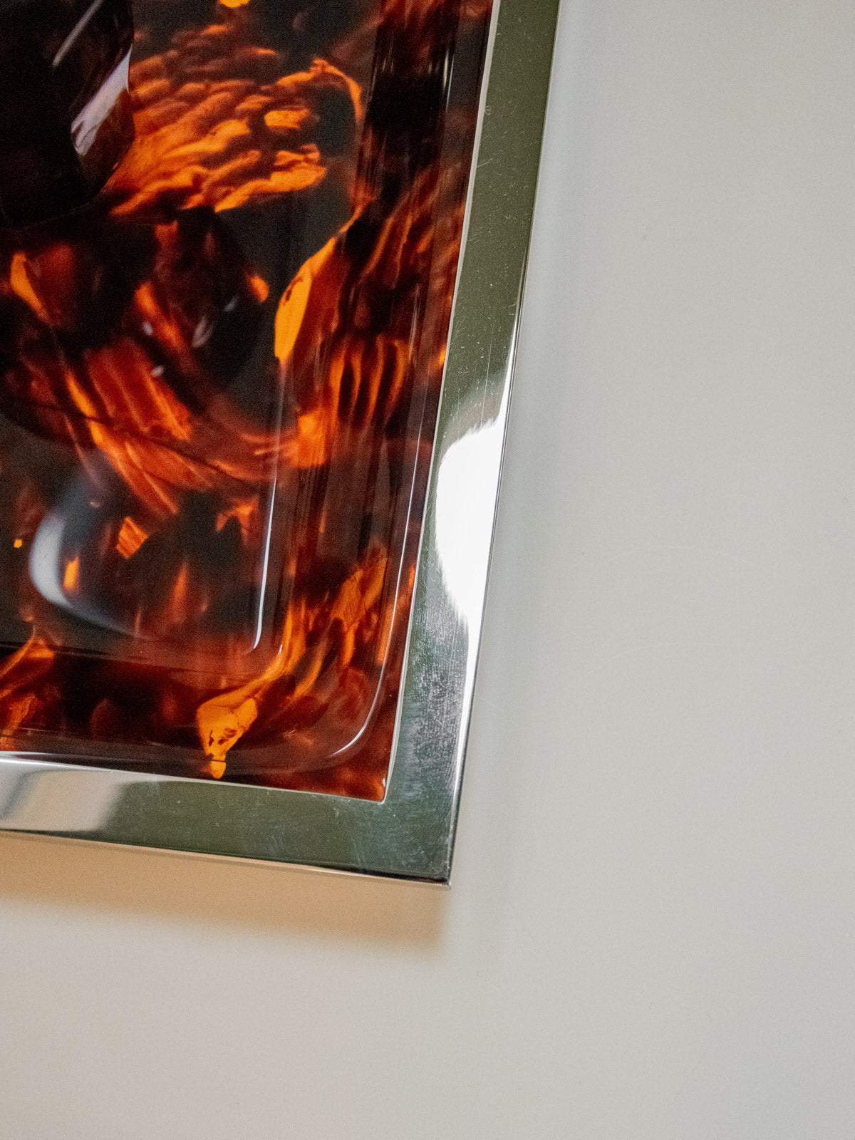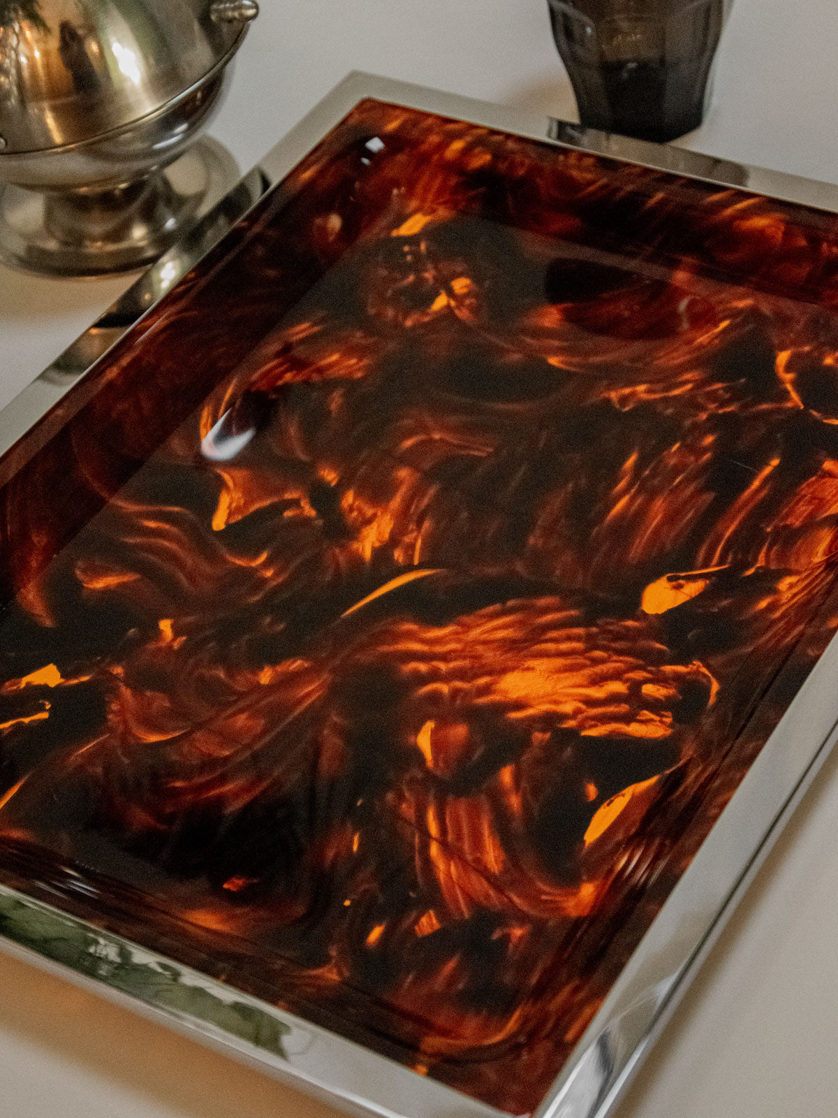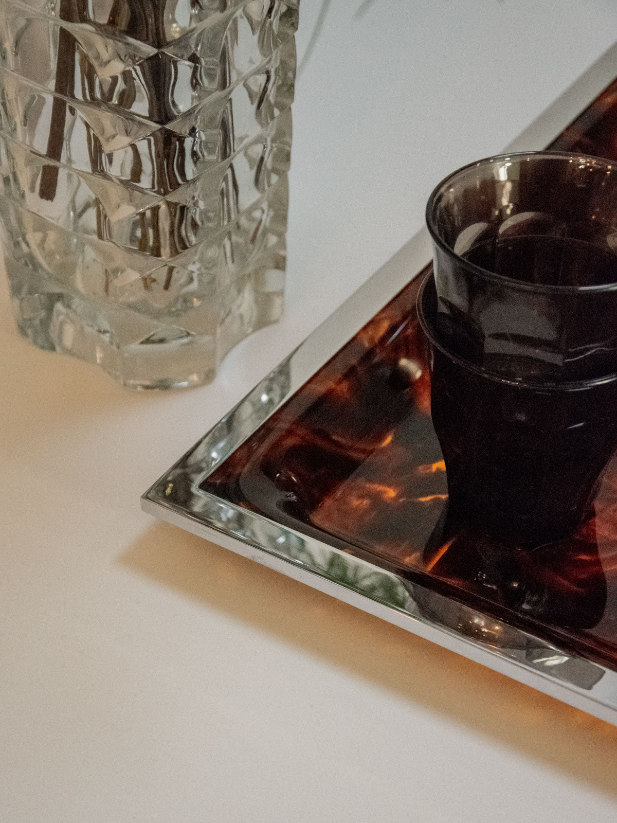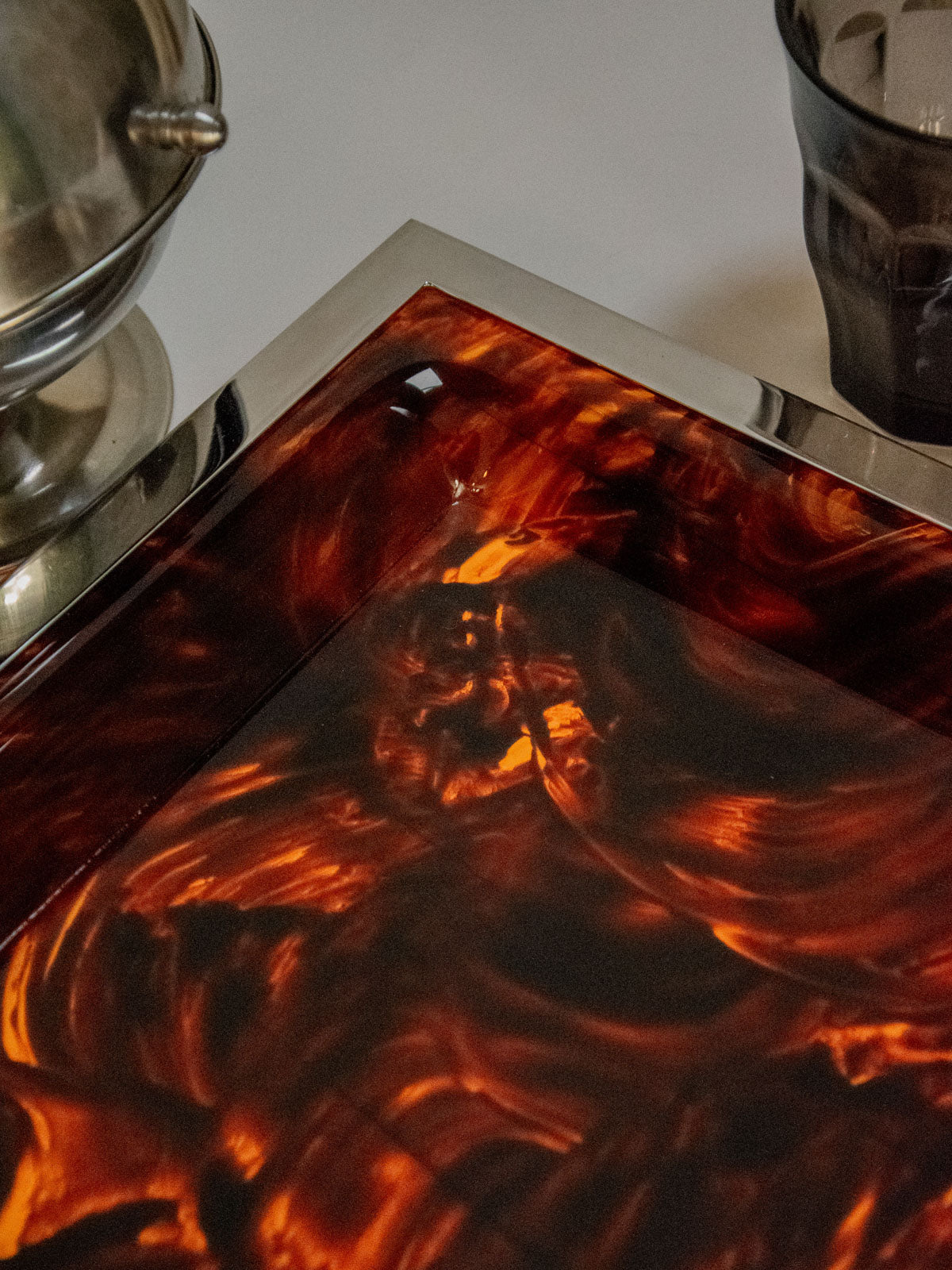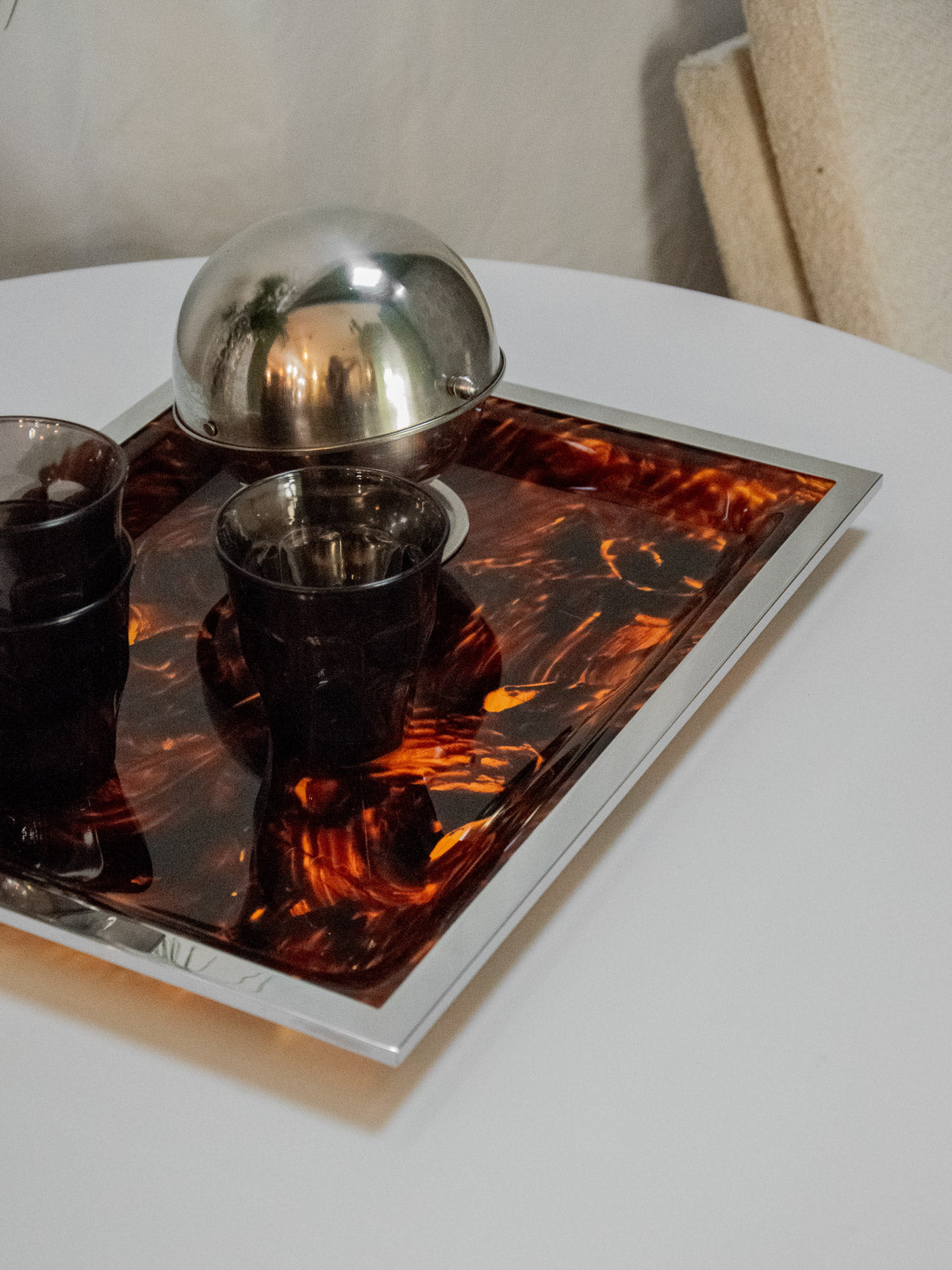 Elevate your table or bar with this lucite and chrome tray featuring a tortoiseshell pattern, where transparency interacts with light to create a discreet yet sophisticated presence. Its translucent brown background varies depending on the surface it rests on, offering warm reflections that beautifully complement glasses, bottles, and decorative objects. The combination of soft lucite and luminous metal strikes a balance between modernity and couture allure, ideal for organizing your beauty treatments or creating an elegant and inviting space. Excellent condition.