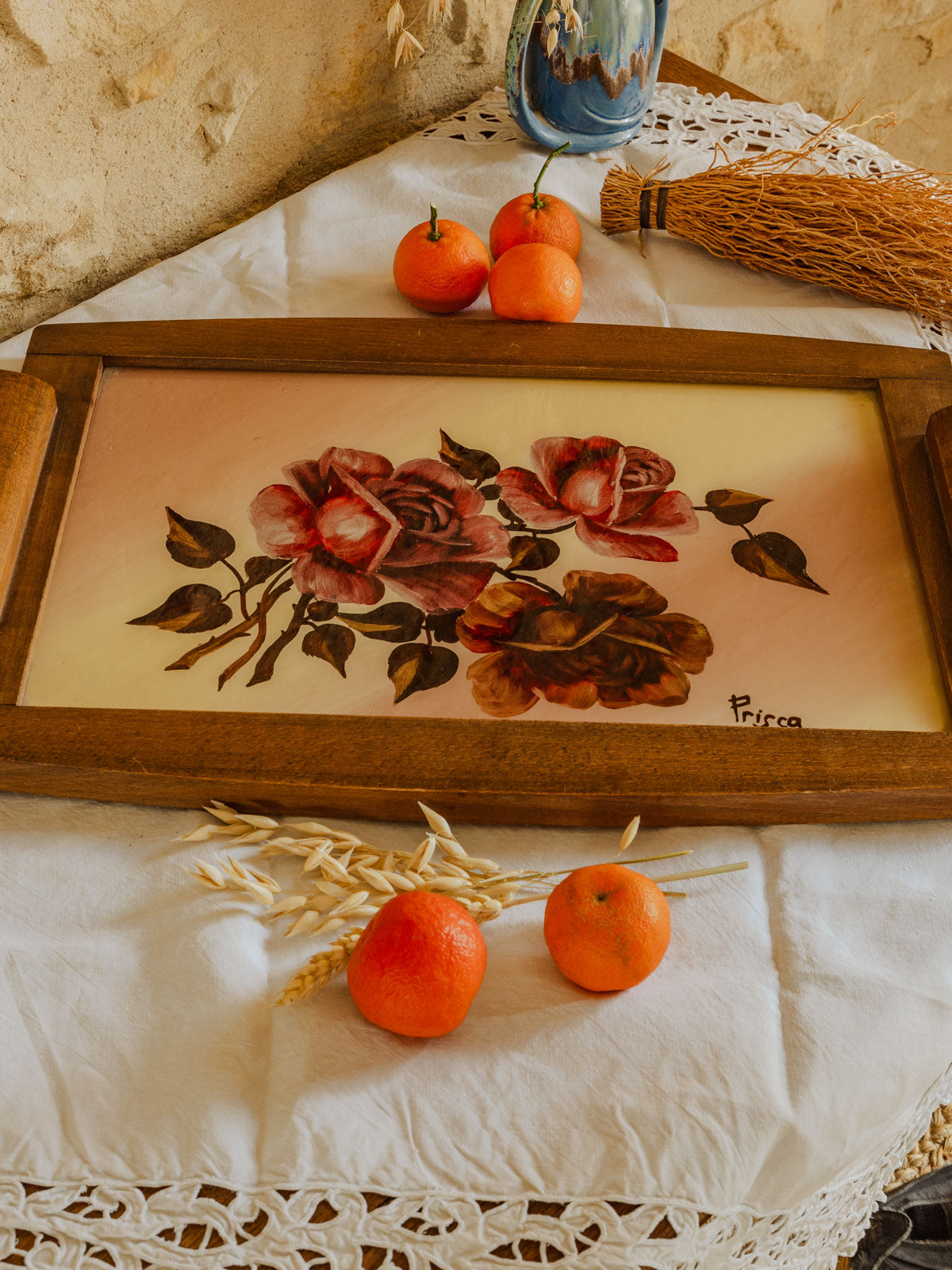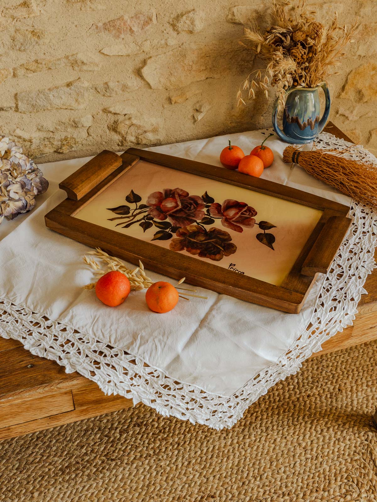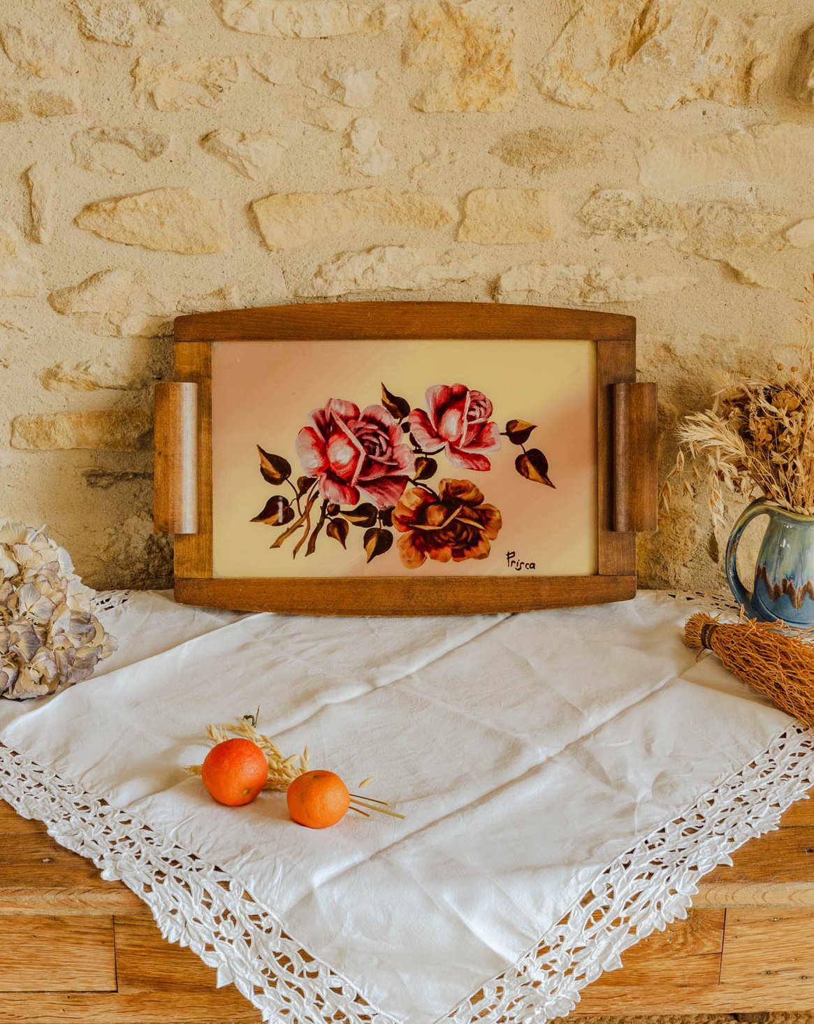 Discover this vintage tray by Prisca, dating from the 1950s, where a delicate rose design graces the center, protected by glass and surrounded by a warm wooden base. Its elongated shape allows it to hold cups and sweets, display candles or decorative objects, and serve as an elegant centerpiece. The combination of wood and glass creates a retro and poetic ambiance, ideal for a charmingly decorative setting.