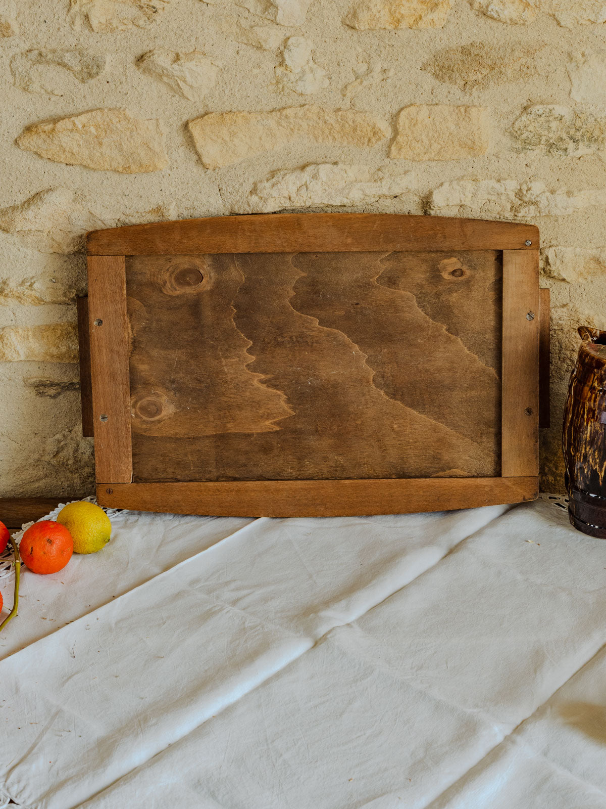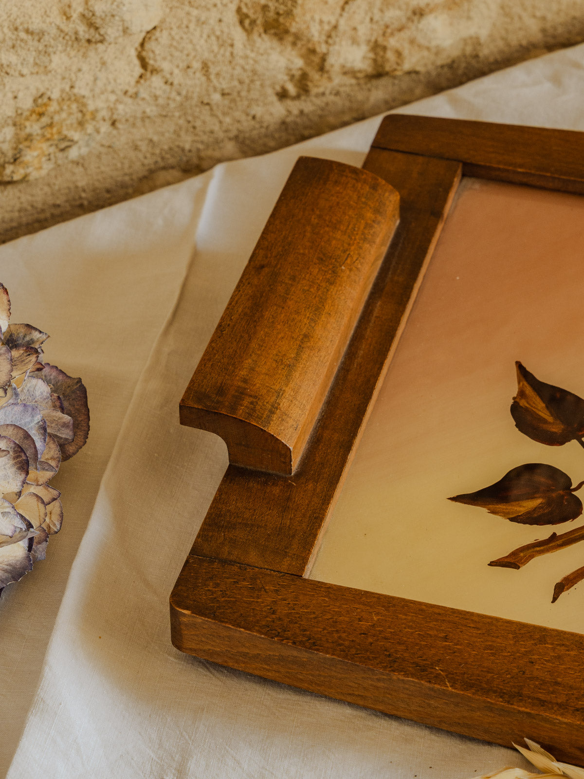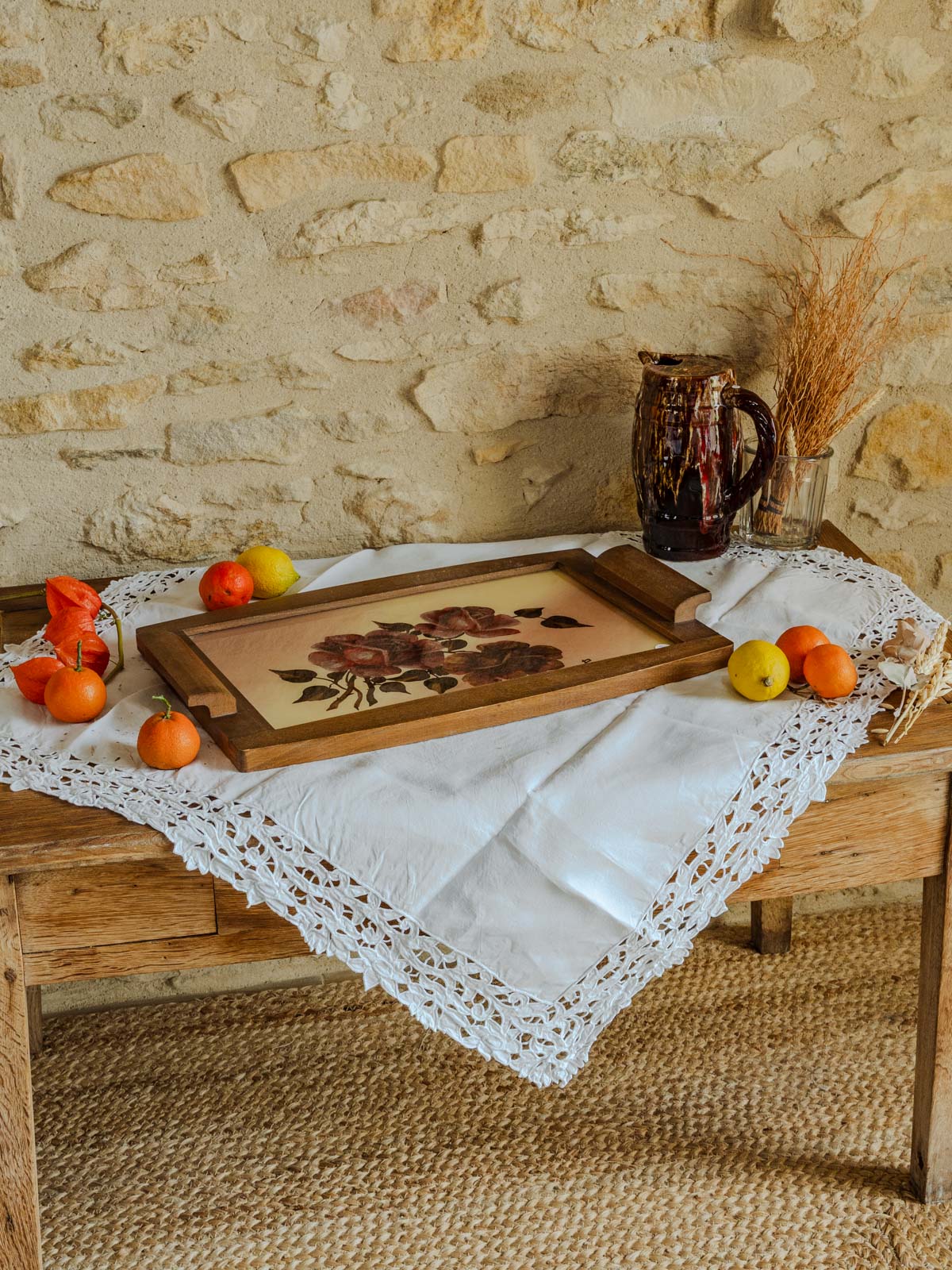 Discover this vintage tray by Prisca, dating from the 1950s, where a delicate rose design graces the center, protected by glass and surrounded by a warm wooden base. Its elongated shape allows it to hold cups and sweets, display candles or decorative objects, and serve as an elegant centerpiece. The combination of wood and glass creates a retro and poetic ambiance, ideal for a charmingly decorative setting.