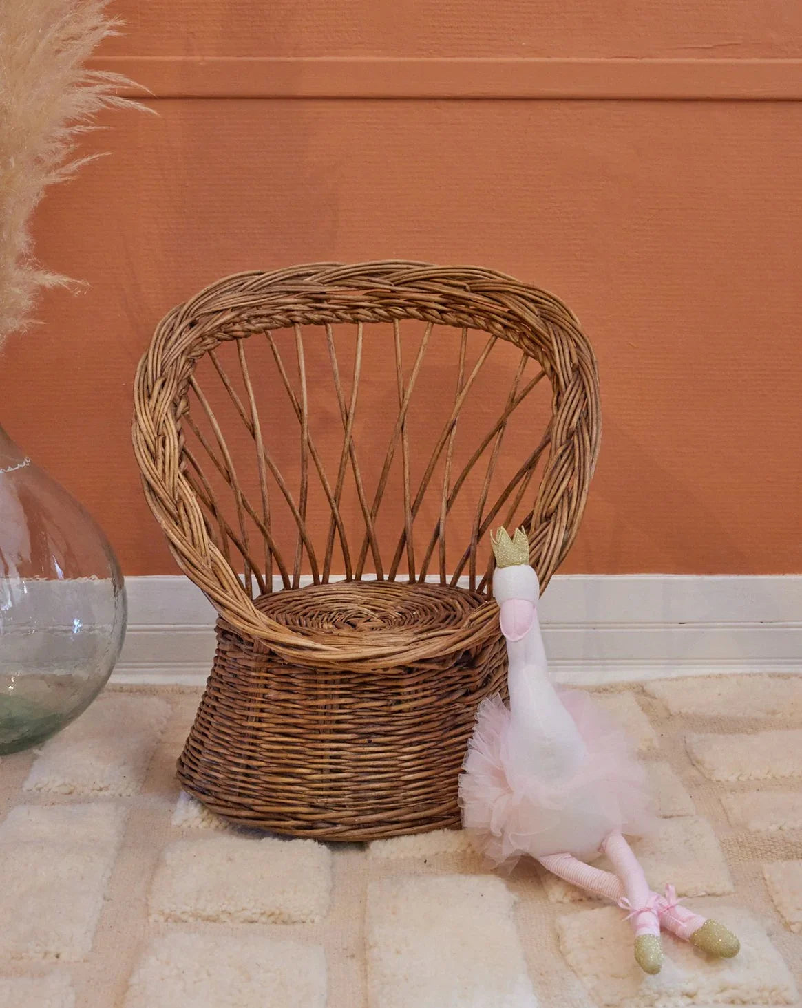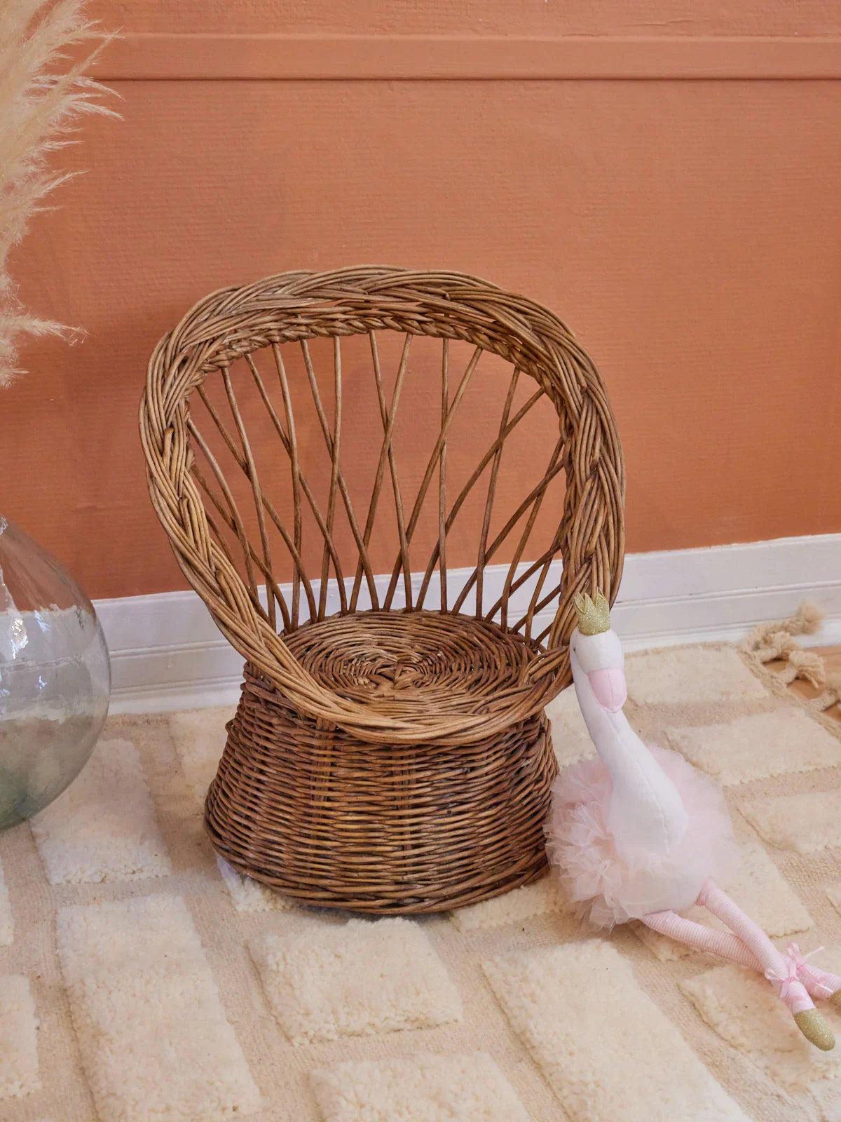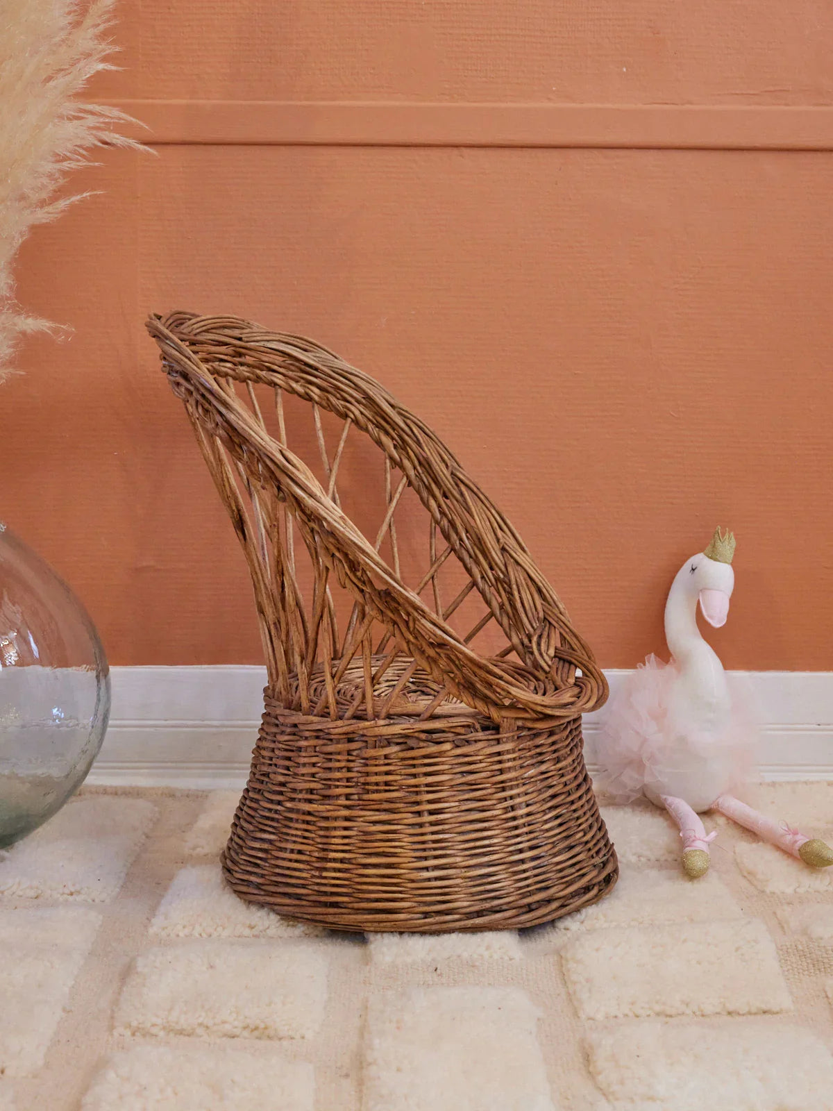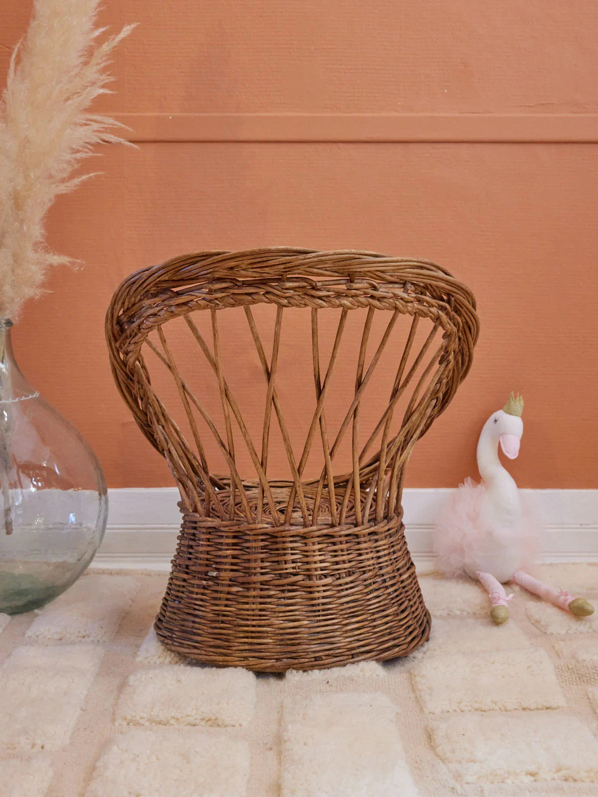 Adopt this Diabolo rattan armchair for children, with its artisanal weaving and enveloping lines that invite reading and imaginative play. Its light structure and adapted proportions make it easy to move and it fits naturally into a bedroom, a reading corner or a sheltered terrace. The natural rattan brings a vegetal warmth and an airy silhouette, creating both a bohemian and refined atmosphere. 2 armchairs available.