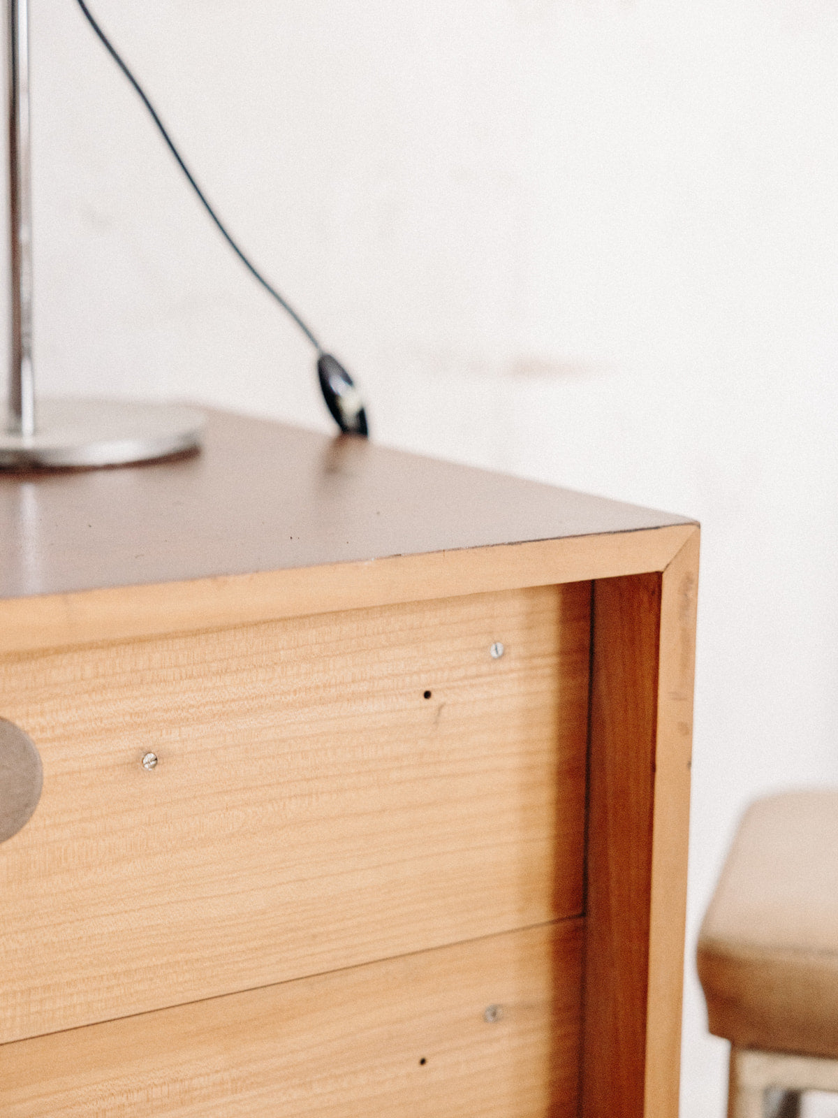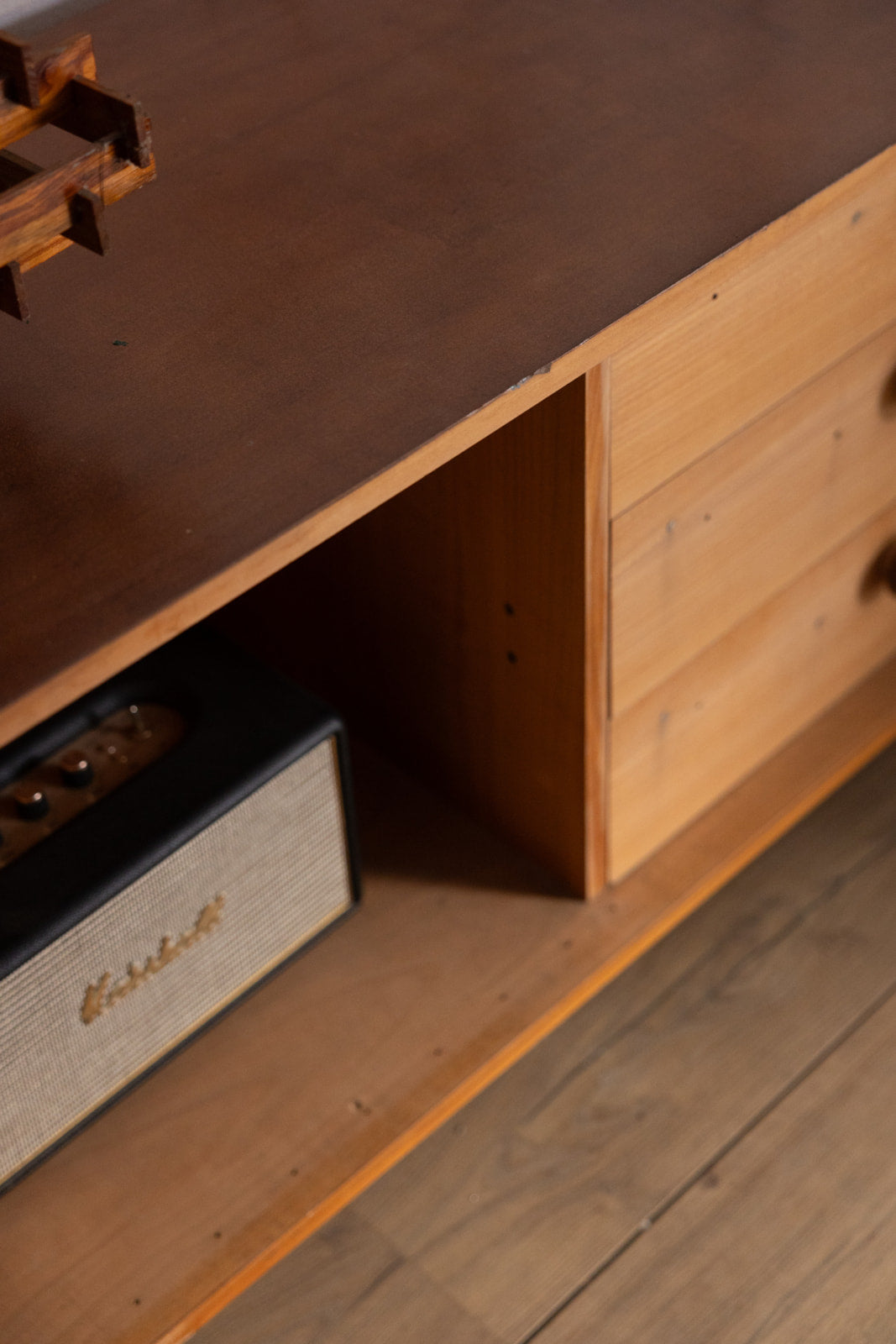 Add a touch of elegance to your home with this small wooden sideboard that subtly combines two tones, light and dark. Originally finished in a golden oak stain, its top has been carefully refinished, giving it a bright and refined look. Featuring an open niche and three drawers, it offers practical and functional storage. The chrome legs add a modern and sophisticated touch. An ideal piece to add character while optimizing your space.