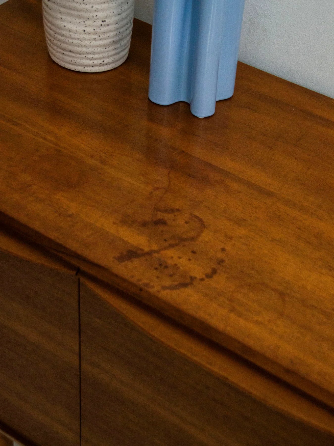 A teak sideboard with a clean, modern design, inspired by 1960s Scandinavian style, bringing warmth and a sense of linearity to your interior. It offers a generous surface area and clever storage with two cupboards and a drop-down cabinet concealed beneath a drawer, ideal for dishes or linens. The warm wood tone and elongated proportions make it a versatile piece, perfect for both the dining room and living room. Solid and in very good condition. Minor signs of age only add to its charm.