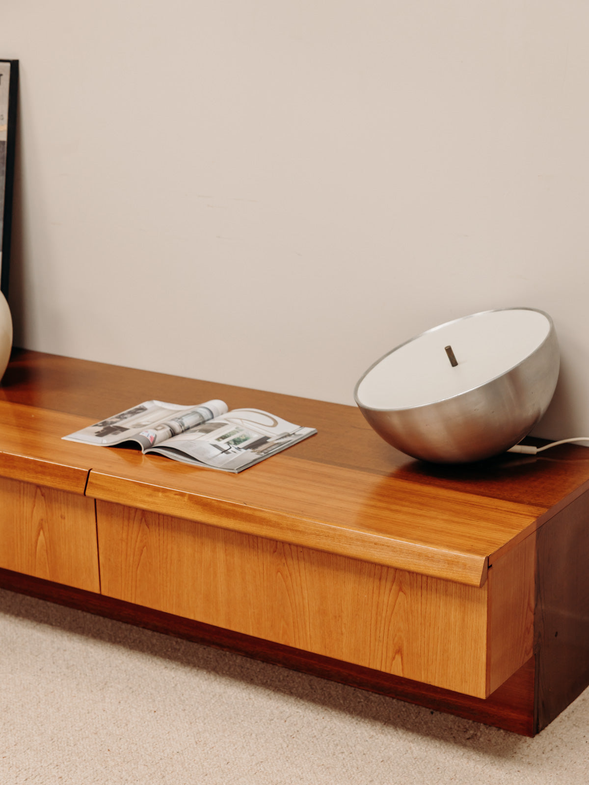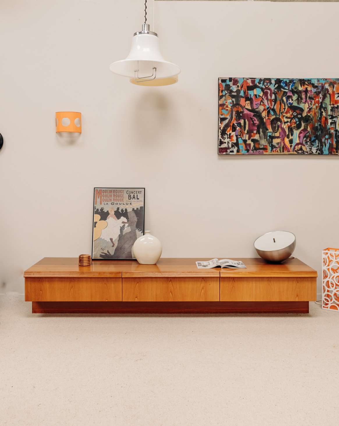 It was in the 1950s that the first Scandinavian sideboards appeared. The Scandinavian-style sideboard is part of the innovative furniture of the post-war era. Its airy lines and rectilinear volumes reflect the understated, modernist-inspired style, with all the hallmarks of Norwegian, Swedish, and Finnish designers. The Scandinavian sideboard is crafted using traditional cabinetmaking techniques, generally in teak. It is used as a replacement for the traditional dining room buffet and now also serves as a console table. For a stylish and inviting living room, the sideboard is the perfect piece of furniture!