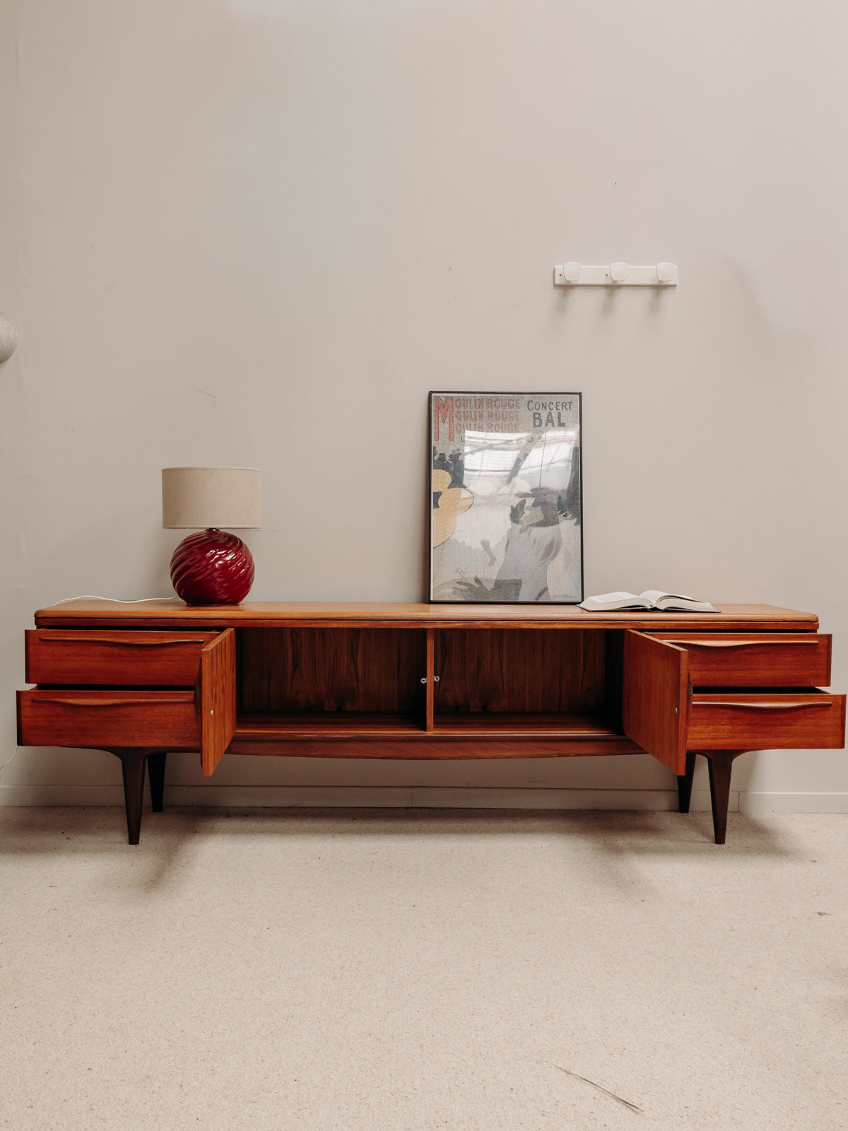 It was in the 1950s that the first Scandinavian sideboards appeared. The Scandinavian-style sideboard is part of the innovative furniture of the post-war era. Its airy lines and rectilinear volumes reflect the understated, modernist-inspired style, with all the hallmarks of Norwegian, Swedish, and Finnish designers. The Scandinavian sideboard is crafted using traditional cabinetmaking techniques, generally in teak. It is used as a replacement for the traditional dining room buffet and now also serves as a console table. For a stylish and inviting living room, the sideboard is the perfect piece of furniture!