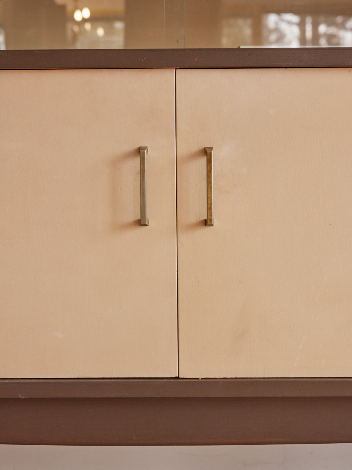 Discover this large 1970s sideboard with its retro charm, crafted from wood with generous lines. Its numerous storage compartments, drawers, doors, and a central glass-fronted cabinet offer practical and adaptable organization for the living room or dining room. Its silhouette and balanced proportions create a warm and refined atmosphere. The entire piece has been neatly repainted.
