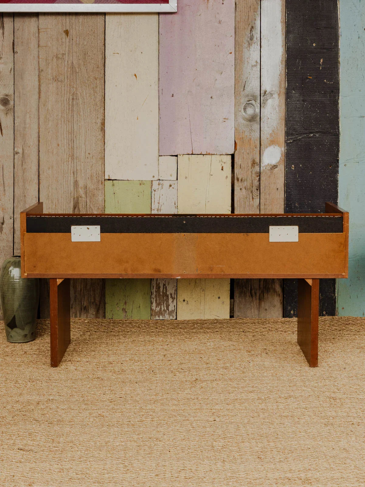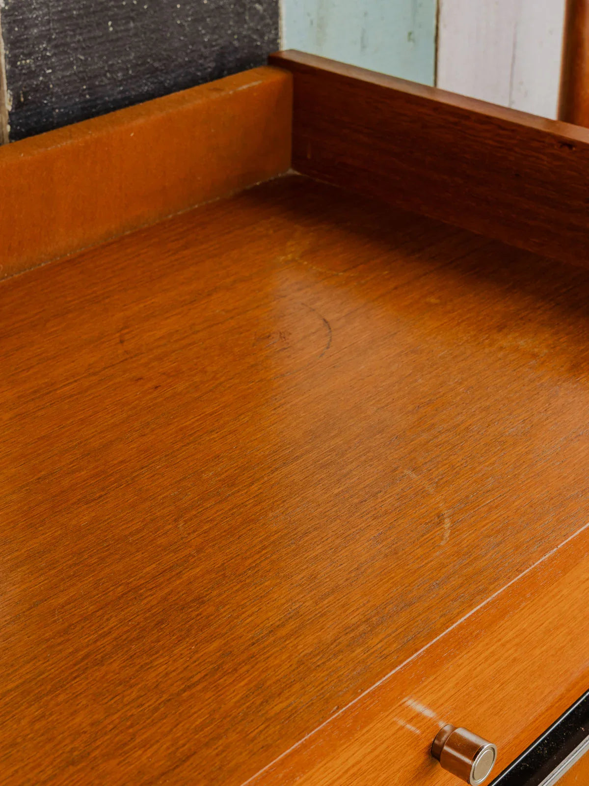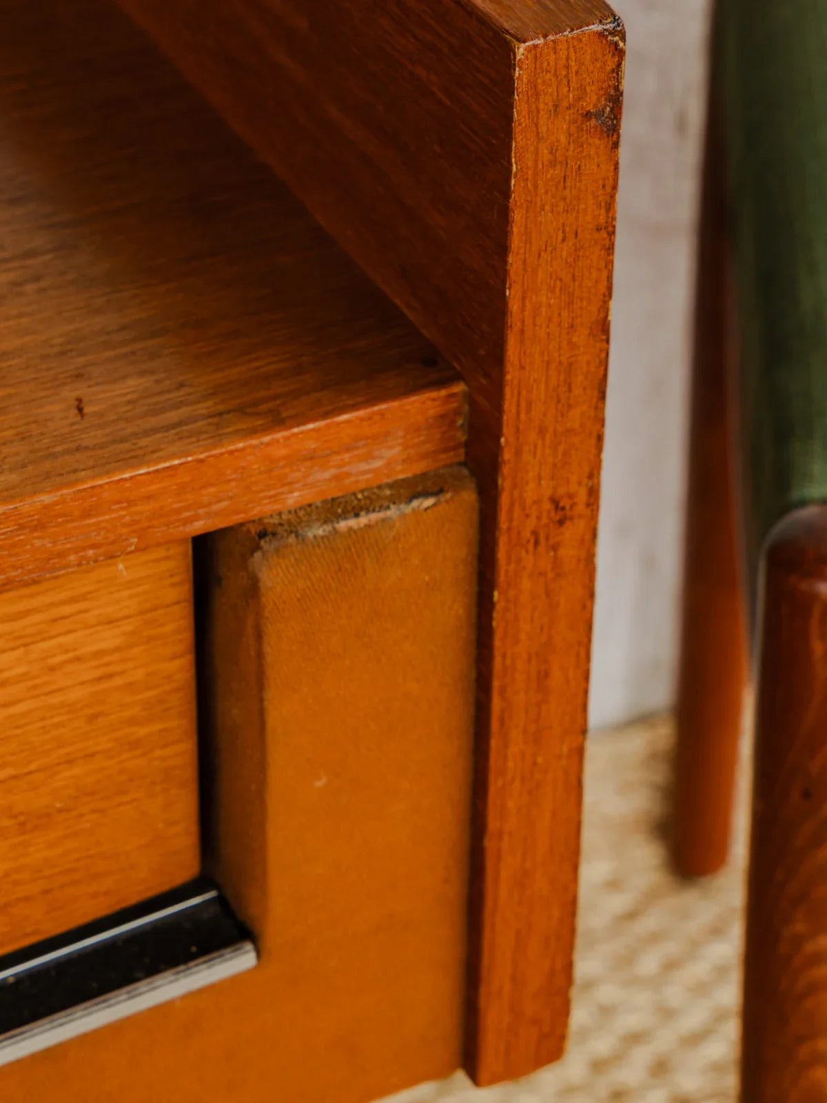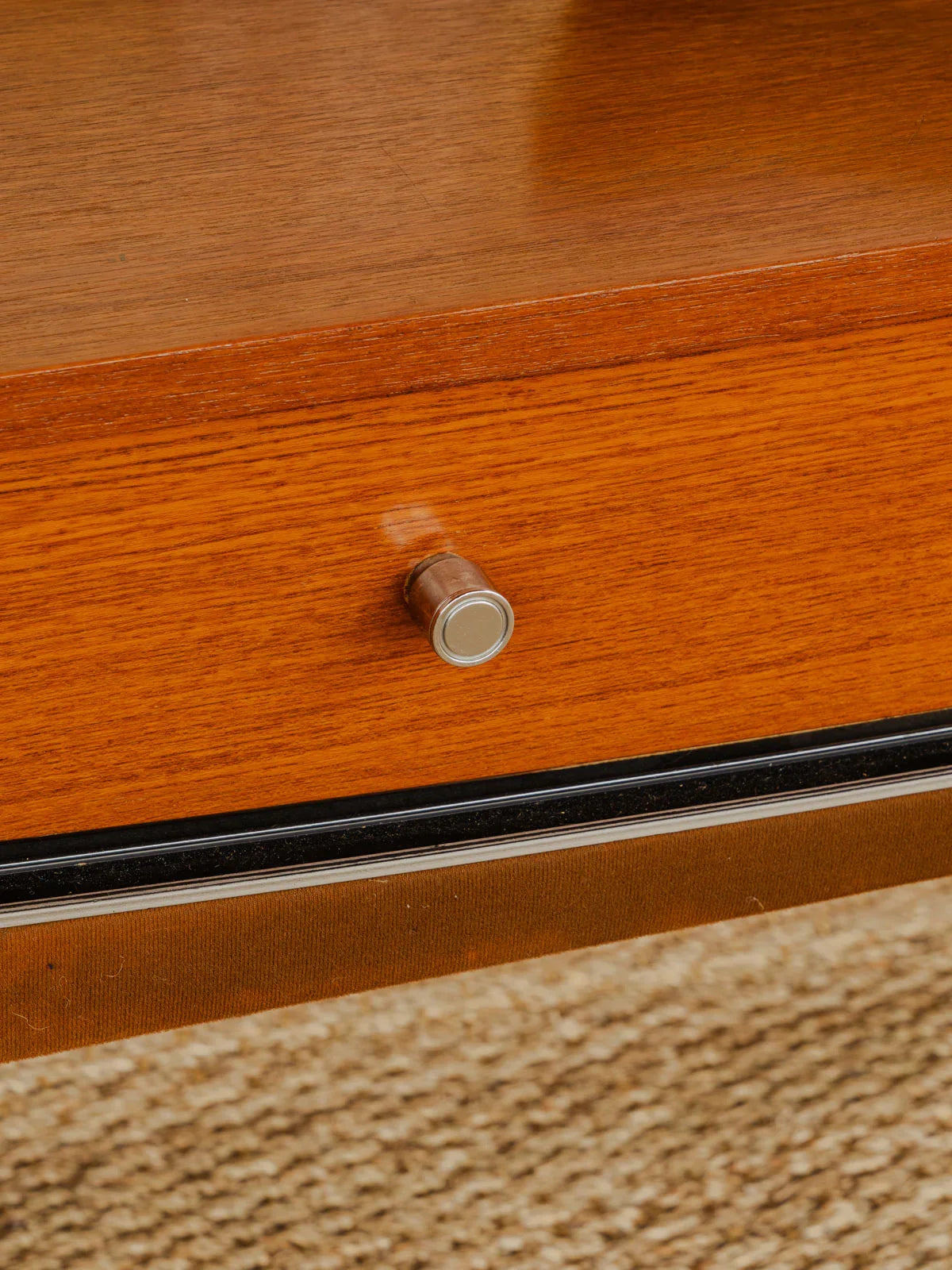 Embrace this vintage dressing table in dark wood, finished with an elegant teak veneer that accentuates its mid-century lines and silhouette. Its two drawers with metal handles offer discreet storage, while its ample top makes it a versatile entryway console or TV stand. Its warm patina and the contrasting metal create a welcoming atmosphere, perfect for enhancing a refined and understated interior.