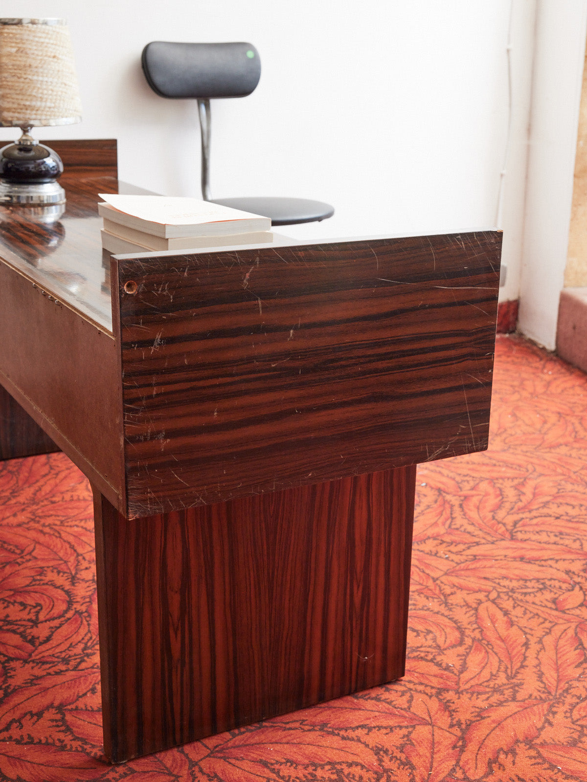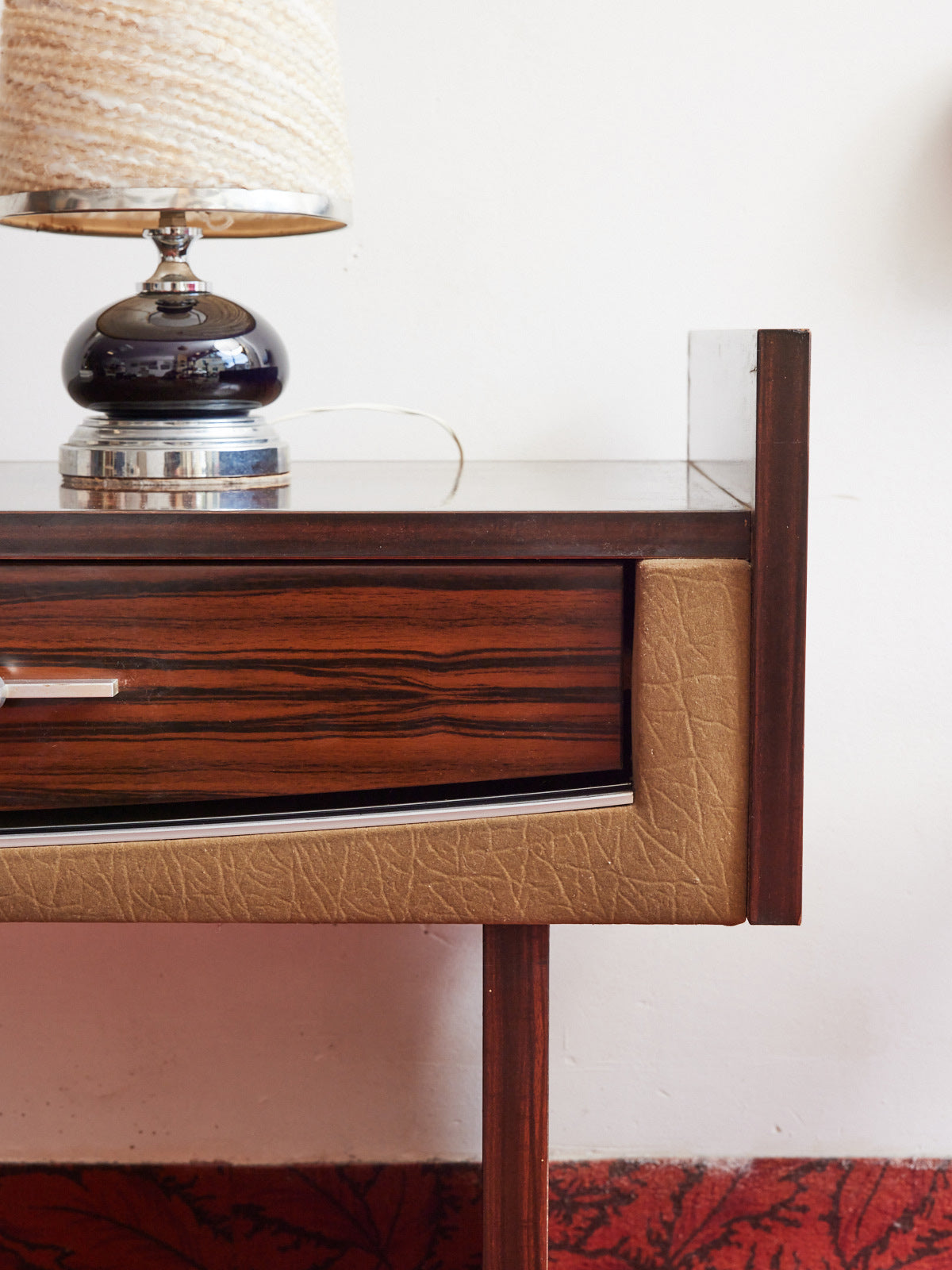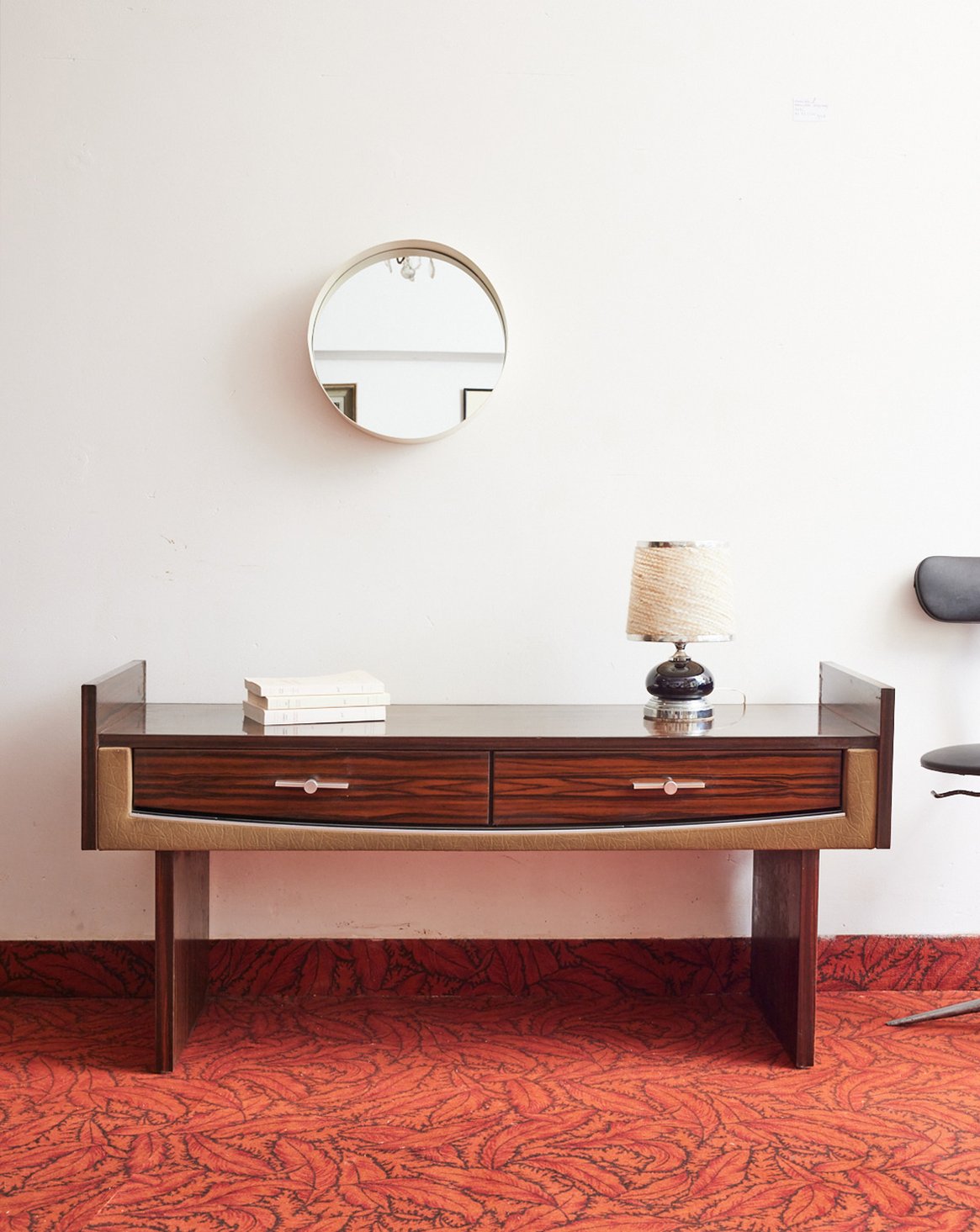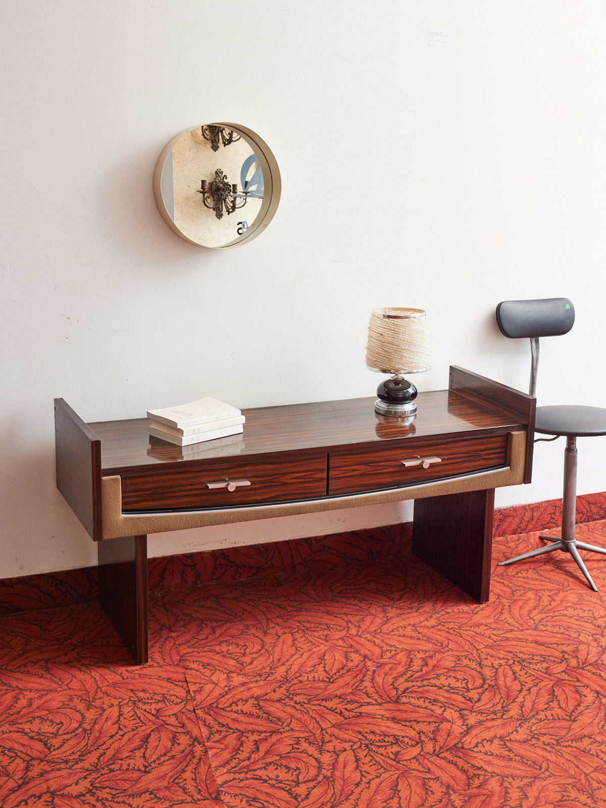 Adoptez ce bas de coiffeuse des années 70 au profil long et élégant, conçu pour s'utiliser en enfilade ou comme meuble TV. Réalisé en bois chaleureux, il se pare de détails en cuir et de poignées allongées qui soulignent un raffinement rétro discret. Ses proportions généreuses offrent un vaste plan de pose et un rangement discret, idéal pour structurer une chambre ou sublimer un salon au ton vintage. Rayures côté gauche et traces de colle sur le plateau.