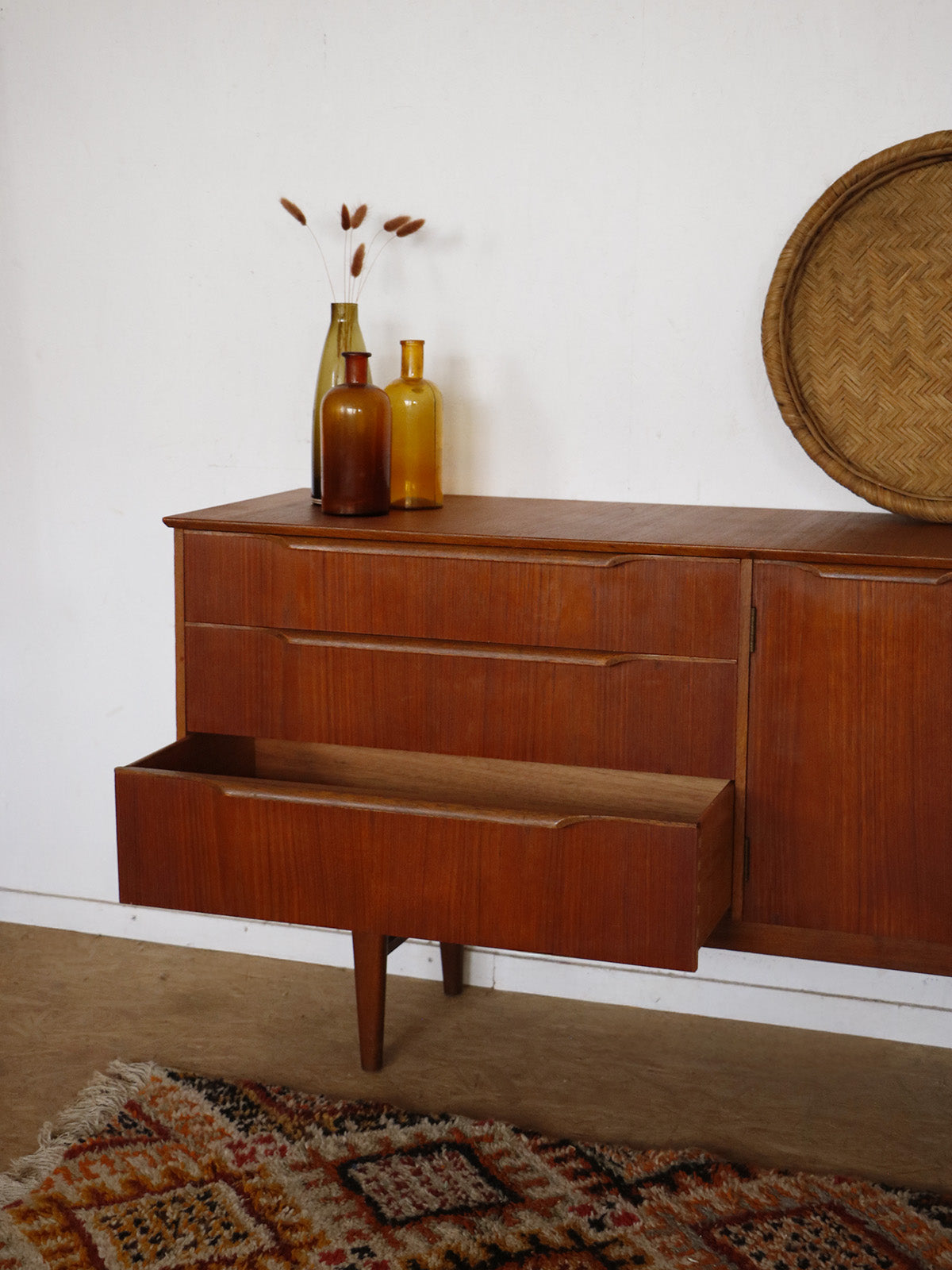 Embrace this small 1960s English sideboard in dark teak veneer, with its clean and elegant lines; its compact proportions conceal cleverly designed storage. Three drawers and two doors opening onto a cupboard offer practical organization for dishes, documents, or electronics, ideal for a living room or dining room. The warm patina of the wood and its grain evoke a contemporary retro ambiance, bringing character and warmth to your interior.