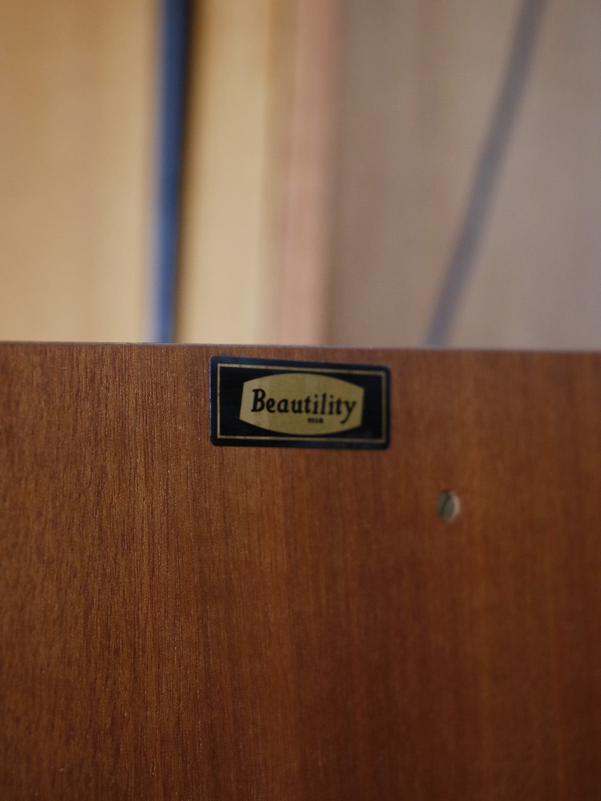 Add a touch of refined mid-century style with this English teak veneer sideboard from BEAUTILITY, featuring long lines and balanced proportions. Designed for the living room or dining room, it combines a cupboard, a front-opening bar, and three large drawers offering organized storage for dishes, linens, or media equipment. The interior shelves, at varying heights, accommodate bottles and glasses, while the drawers provide practical compartments. Its warm patina enhances its understated and timeless aesthetic.