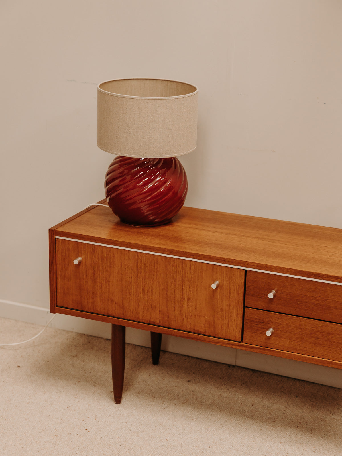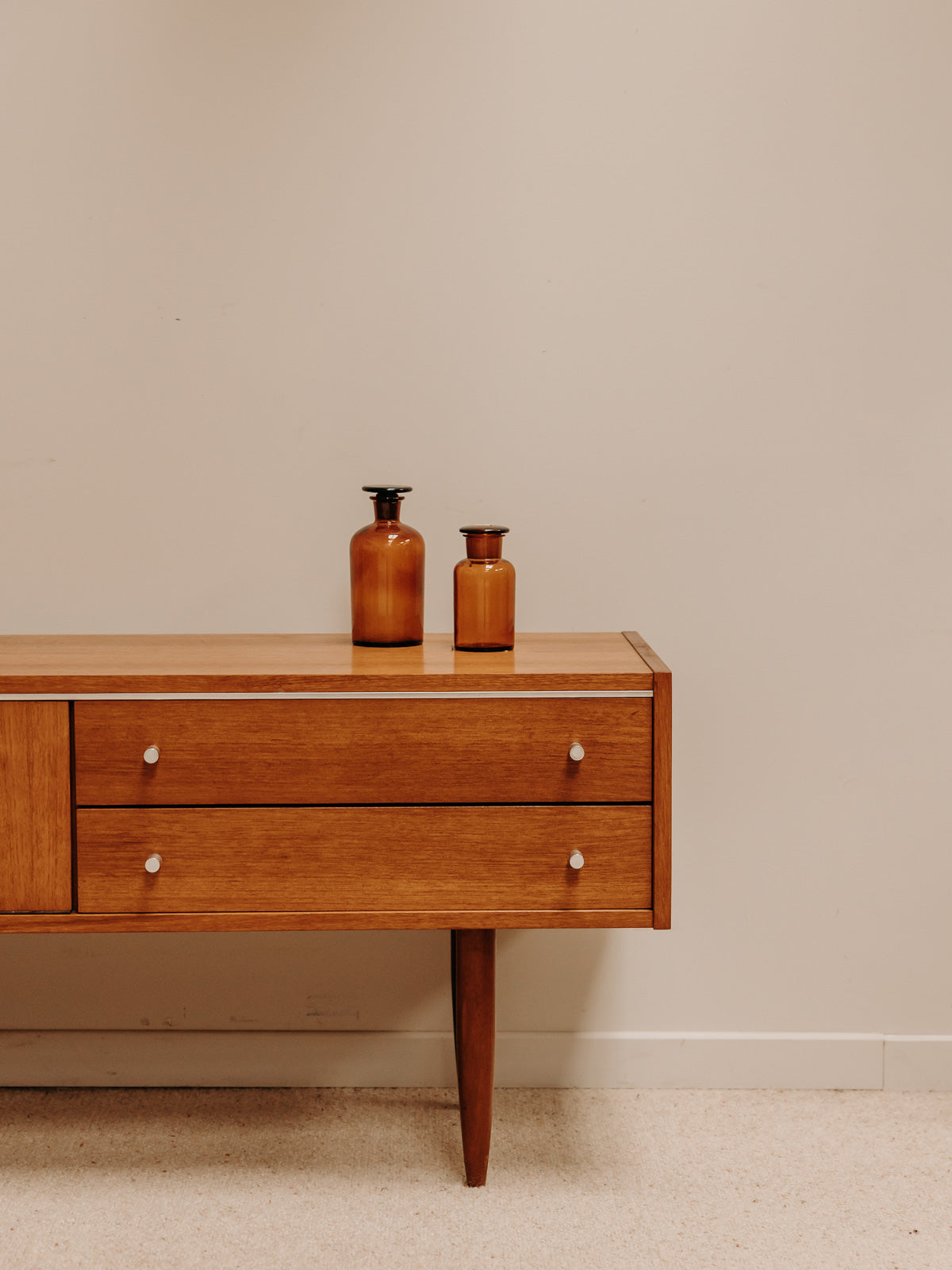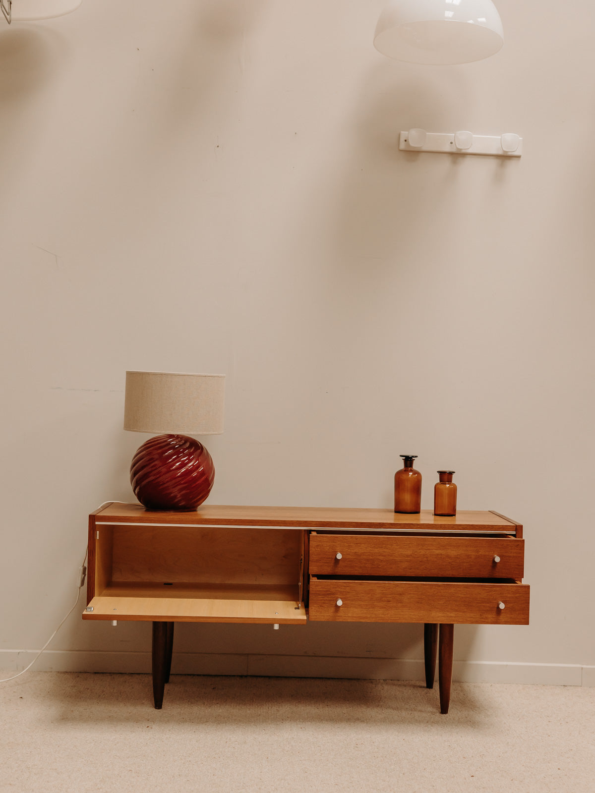 Sublimez votre intérieur avec cette enfilade basse en bois mêlant essences foncées et claires de teck et élégantes poignées métal, dont les pieds hauts fuseaux apportent une silhouette aérienne et raffinée. Le meuble propose un placard rabattant et deux tiroirs, offrant un rangement optimisé pour un salon, une entrée ou une salle à manger, tandis que son format compact s'intègre facilement sous une fenêtre ou un meuble TV. Son équilibre de matières et lignes épurées instaure une atmosphère chaleureuse et rétro-chic.