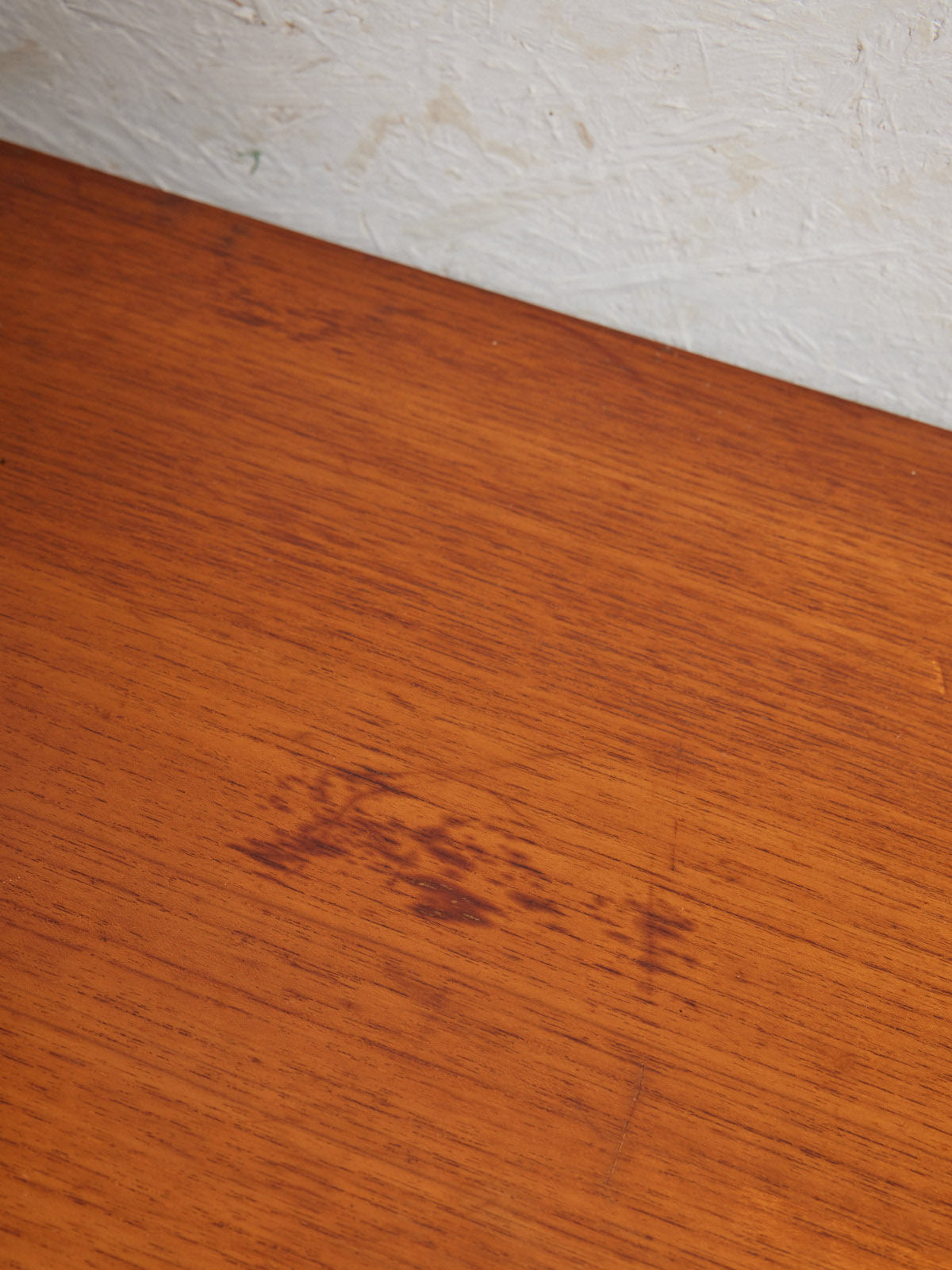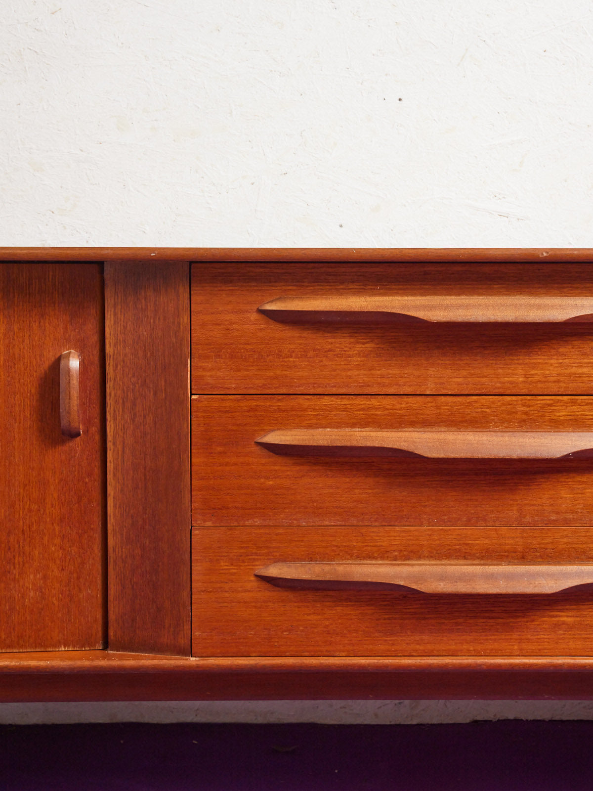 Discover this 60s teak sideboard, where the warmth of the wood and its natural patina bring a sober elegance to the dining room or living room. Its drawers, cleverly fitted with cutlery storage, offer practical organization without compromising on style, while the molded handles and U-shaped legs assert a refined mid-century design. Its generous depth allows for crockery and accessories to be stored, creating a warm and organized atmosphere.