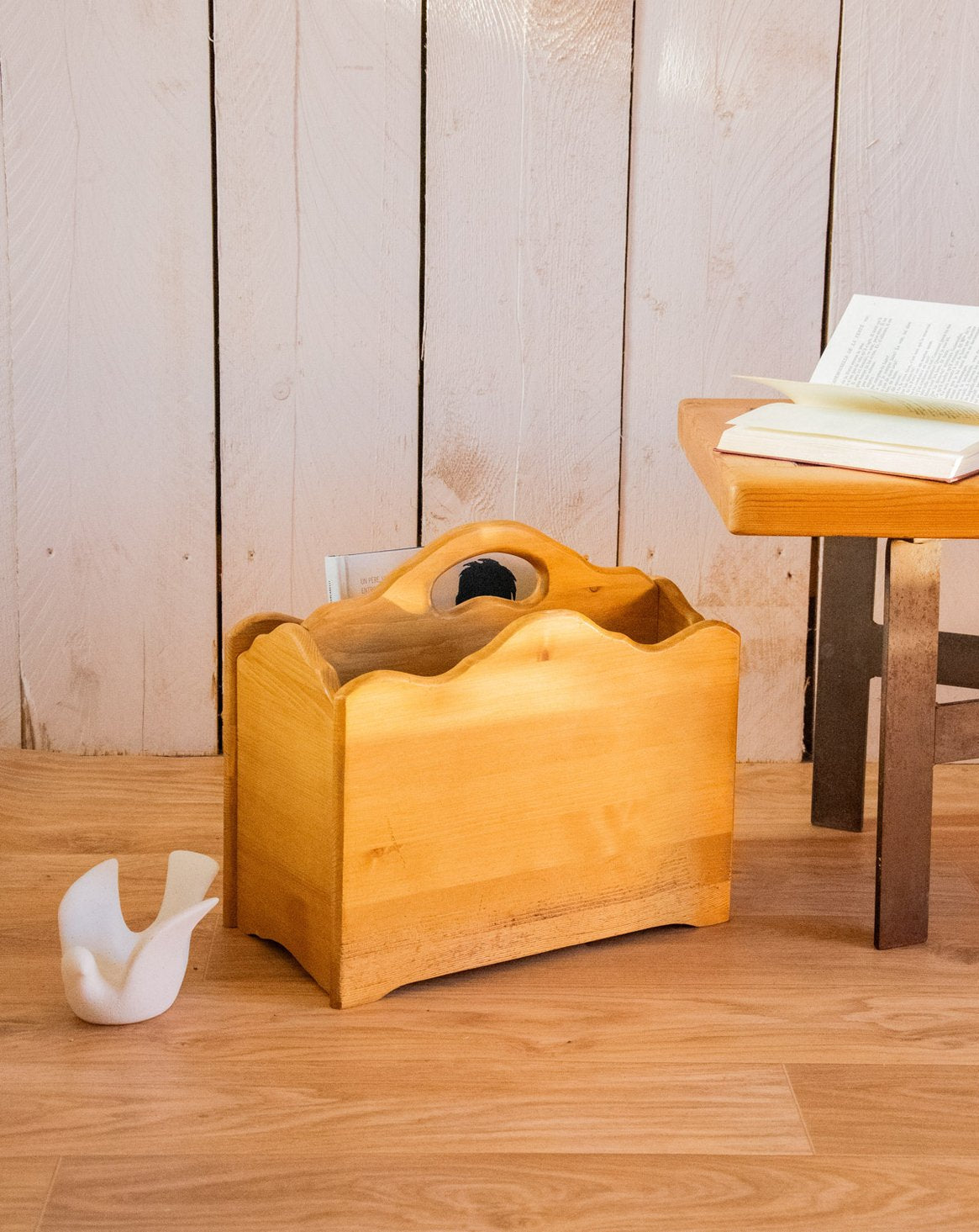 Discover this magazine rack crafted from solid pine with a beautifully patinated light wood. Its integrated handle makes it easy to move and highlights its simple yet elegant silhouette. The compartments, perfectly sized to hold magazines, newspapers, or files, combine practicality and style, making it ideal for a living room, office, or entryway. The warm patina creates a soft and authentic atmosphere, perfect for complementing a natural and inviting interior.