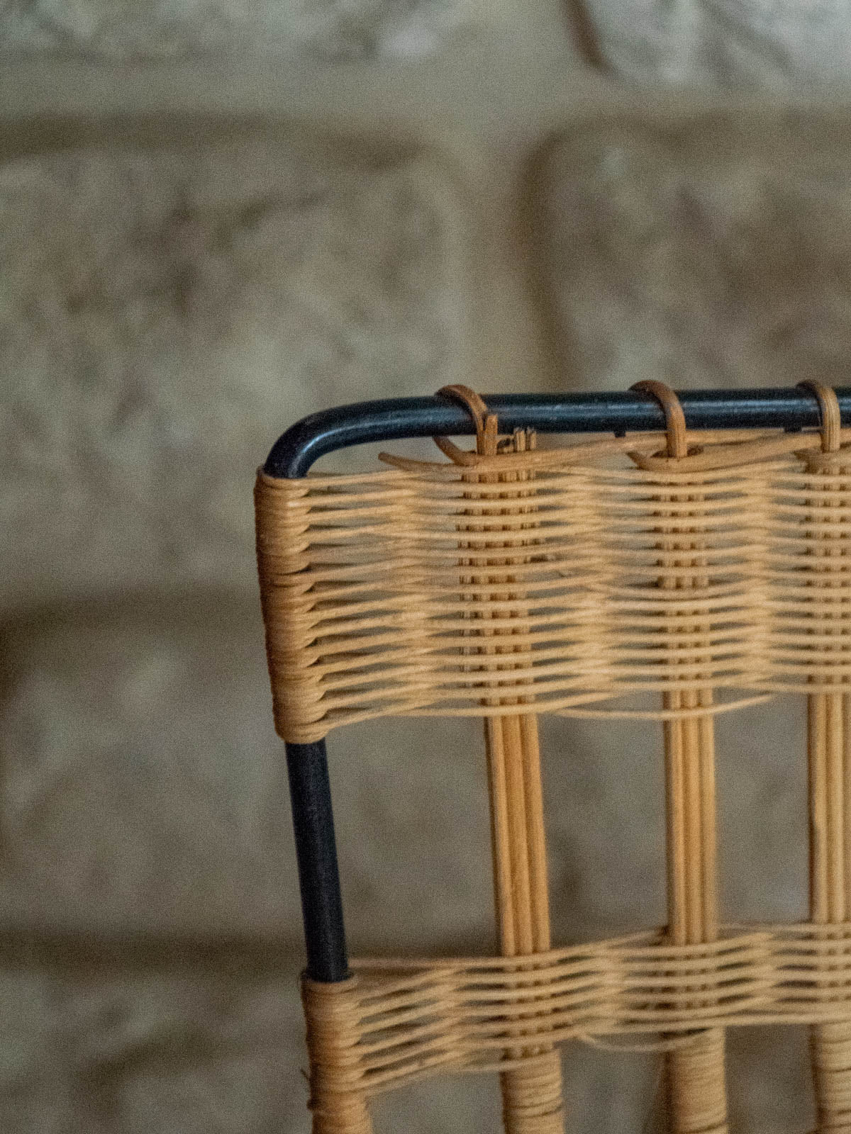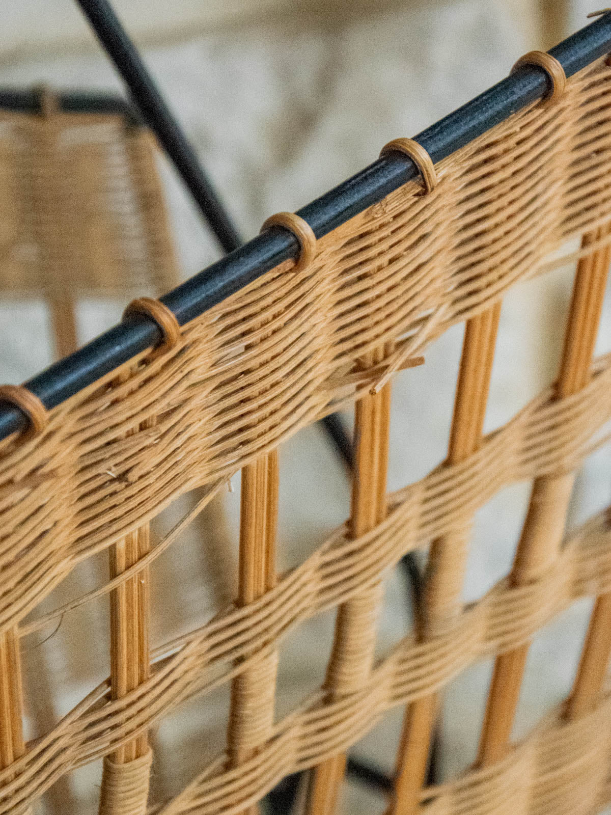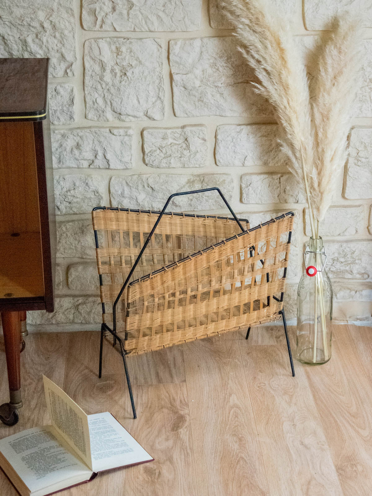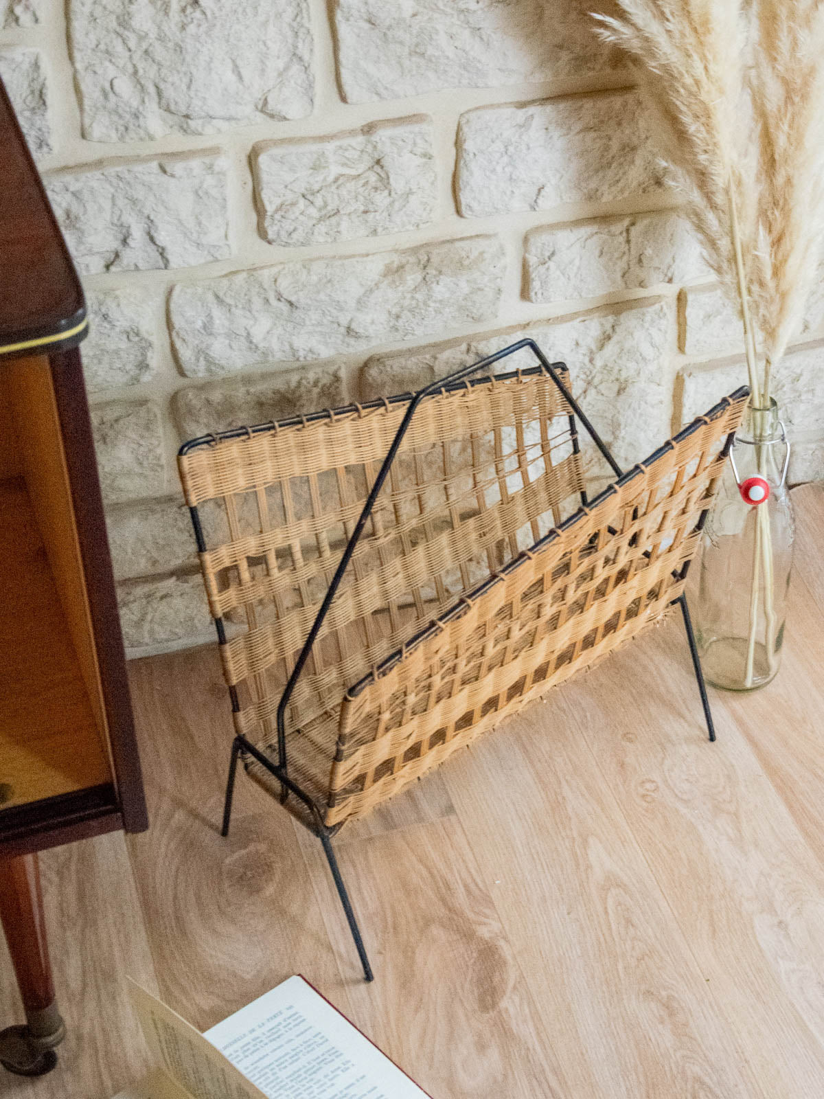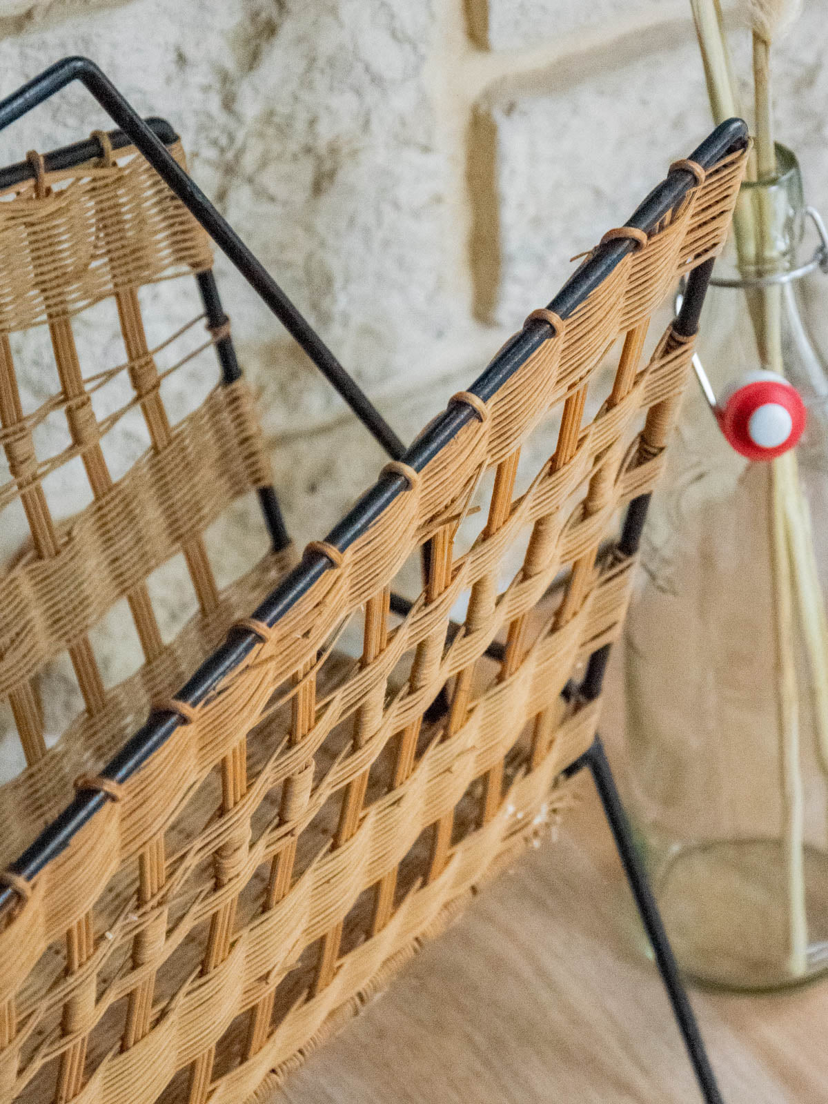 Invite this magazine rack into your home with its asymmetrical design, crafted from woven wicker and black metal, a perfect blend of natural warmth and the graphic elegance of metal. Its unique, airy silhouette offers ample space for magazines and newspapers, while the black frame provides structure and a contemporary contrast. Ideal next to a sofa, reading chair, or in an entryway to create a warm and distinctive atmosphere. Minor signs of age are present.