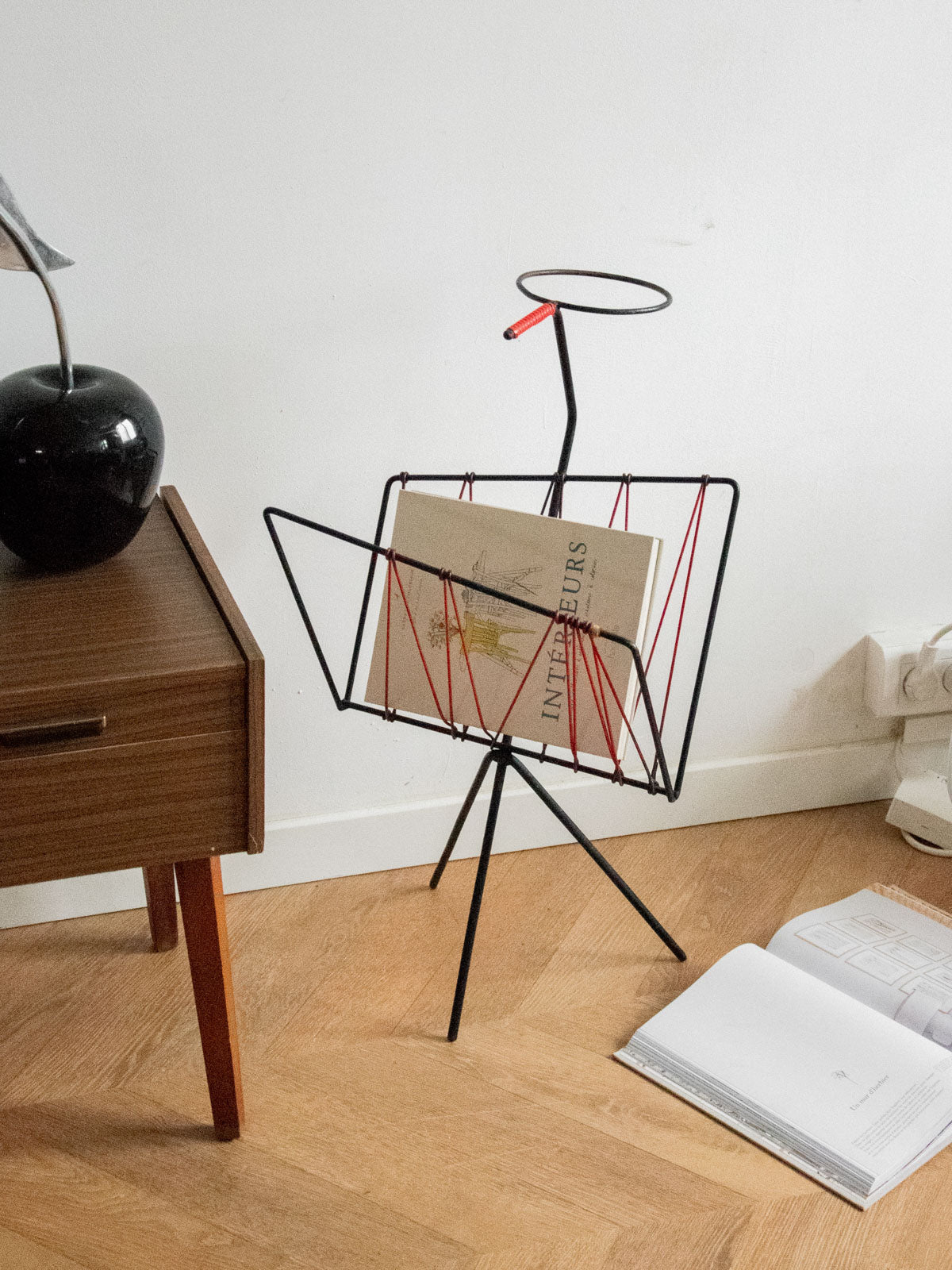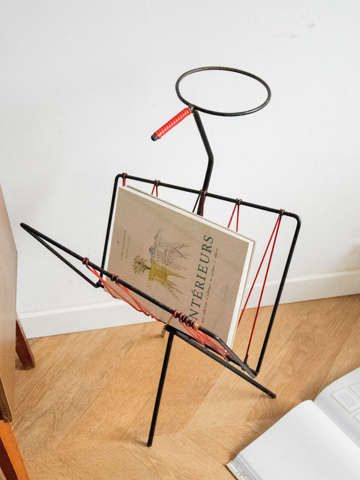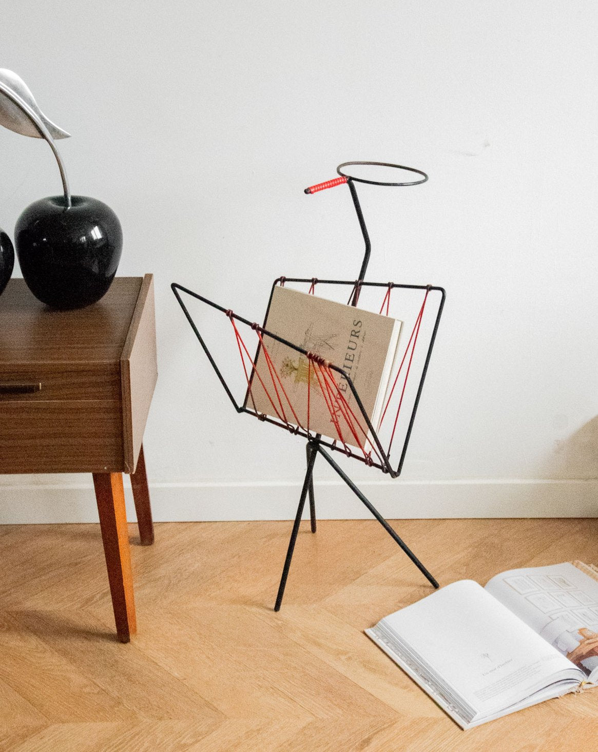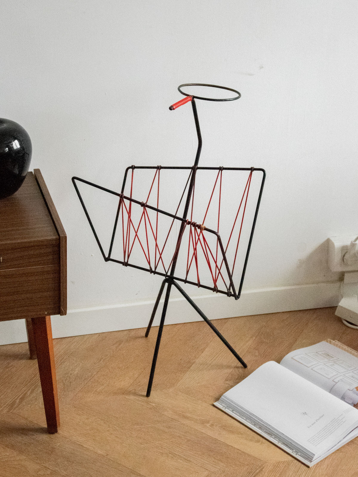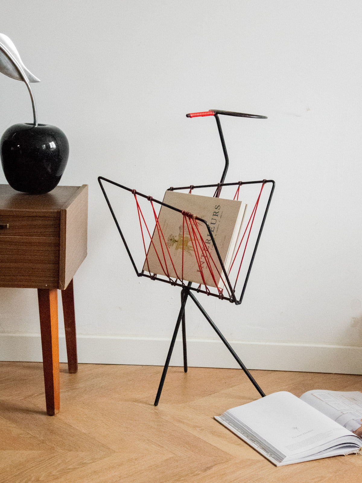 Adoptez ce porte-revues des années 60 en fil métallique rouge, une structure légère et graphique qui réinvente le rangement au quotidien. Sa hauteur et son gabarit étroit accueillent magazines, parapluies ou pots de plantes avec une belle présence verticale, idéale pour une entrée, un salon ou un balcon. La finition laquée souligne son esprit rétro tout en conservant une élégance sobre ; un objet fonctionnel qui apporte couleur et rythme à votre intérieur.