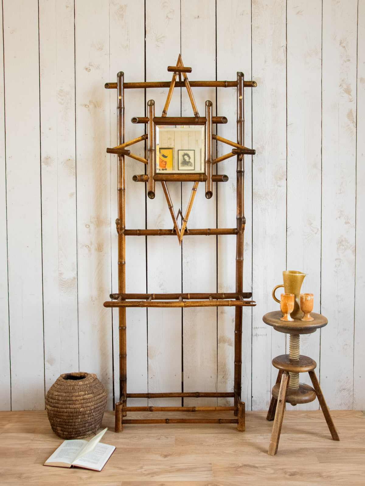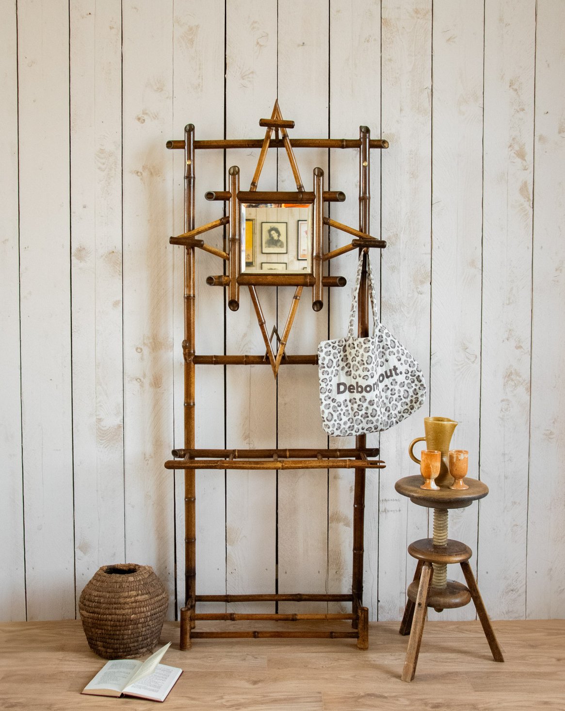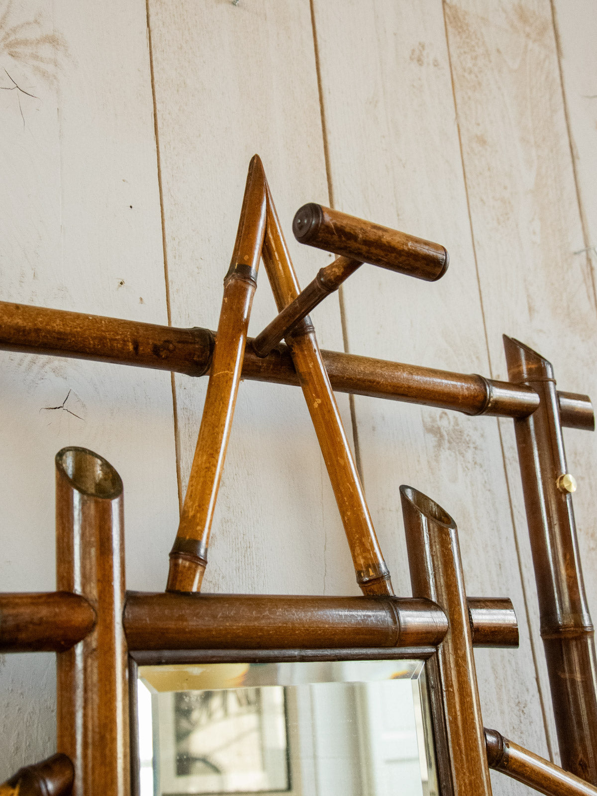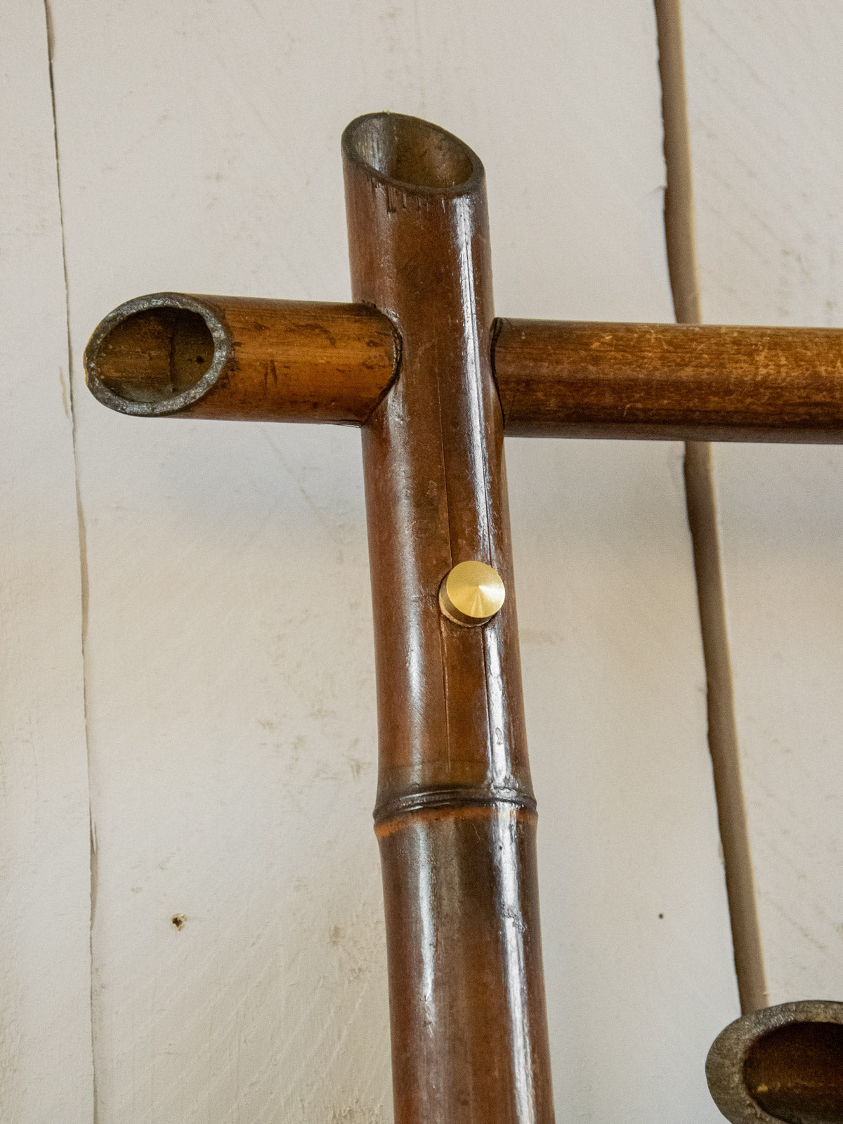 Embrace this 1940s bamboo coat rack, treated with linseed oil for a warm, natural patina. Its slender silhouette, punctuated by a square, beveled mirror, integrates elegantly into an entryway or hallway, while five hooks and four umbrella stands organize jackets and everyday accessories. The bamboo gives it a light visual appeal and structural strength, ideal for an authentic vintage look. The umbrella stand on the right is damaged.