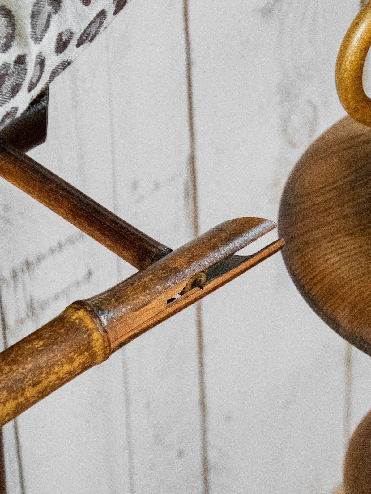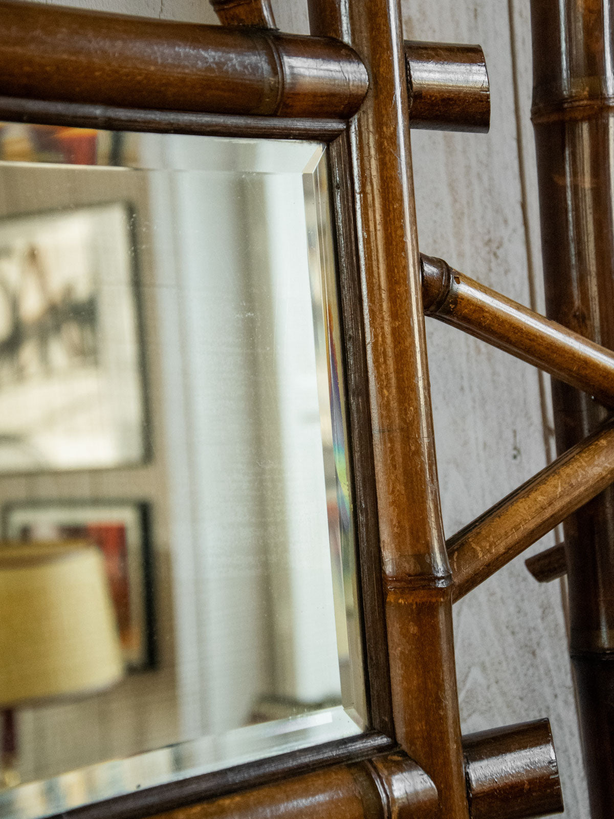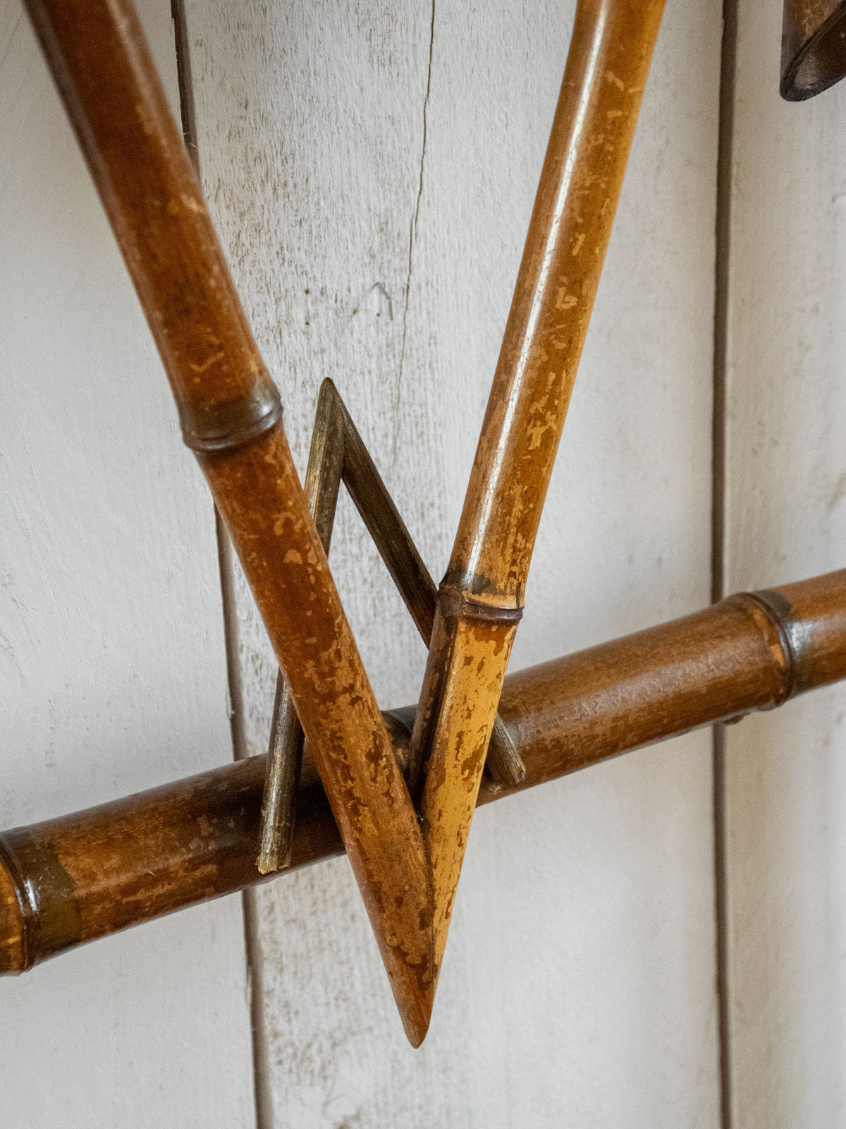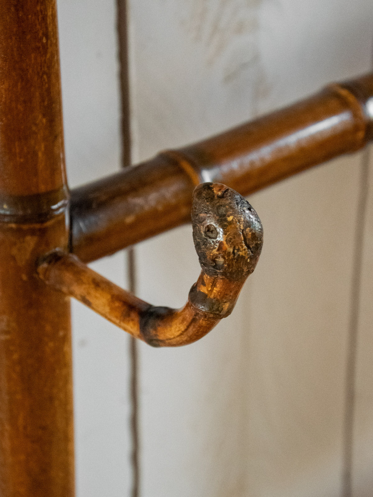 Embrace this 1940s bamboo coat rack, treated with linseed oil for a warm, natural patina. Its slender silhouette, punctuated by a square, beveled mirror, integrates elegantly into an entryway or hallway, while five hooks and four umbrella stands organize jackets and everyday accessories. The bamboo gives it a light visual appeal and structural strength, ideal for an authentic vintage look. The umbrella stand on the right is damaged.