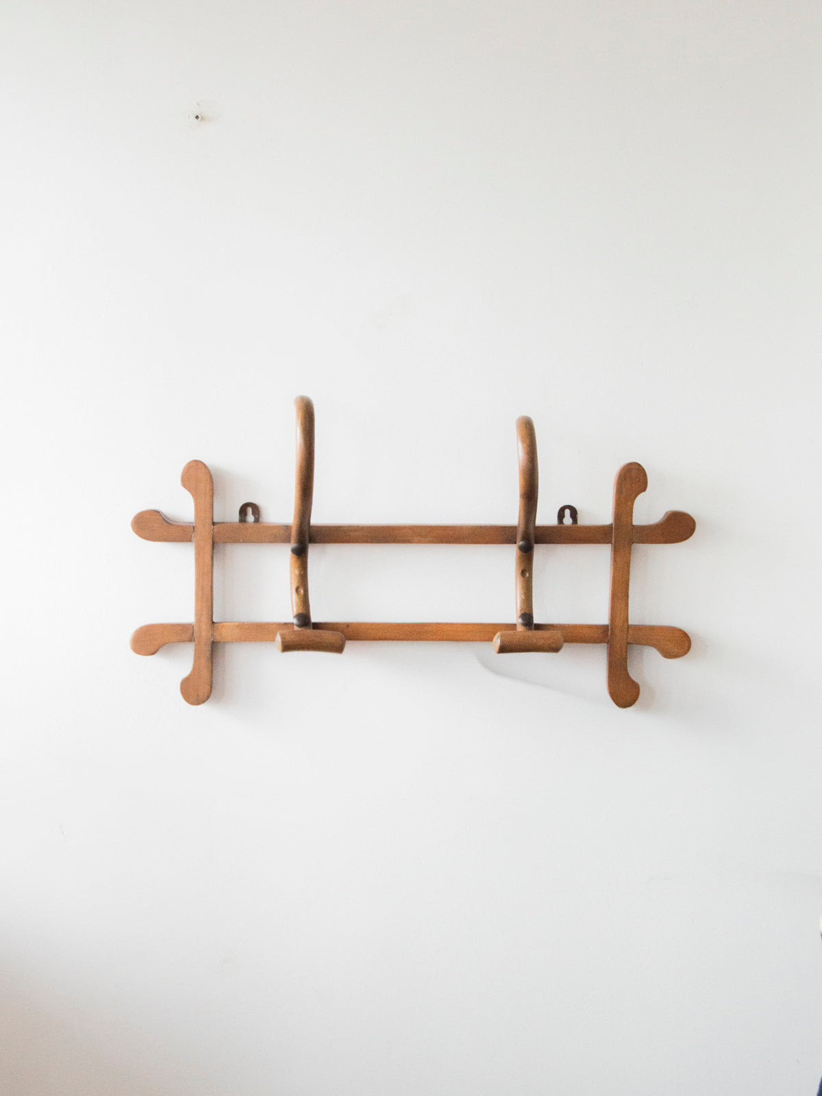 Choose a Thonet-style wooden wall-mounted coat rack with three delicately curved hooks. Its slim, balanced silhouette fits easily into a hallway or entryway, adding an elegant bistro touch while remaining practical. The warm wood and understated finish create a welcoming atmosphere, ideal for hanging coats, hats, and bags. Its compact size makes it perfect for city entryways or small spaces without sacrificing functionality.