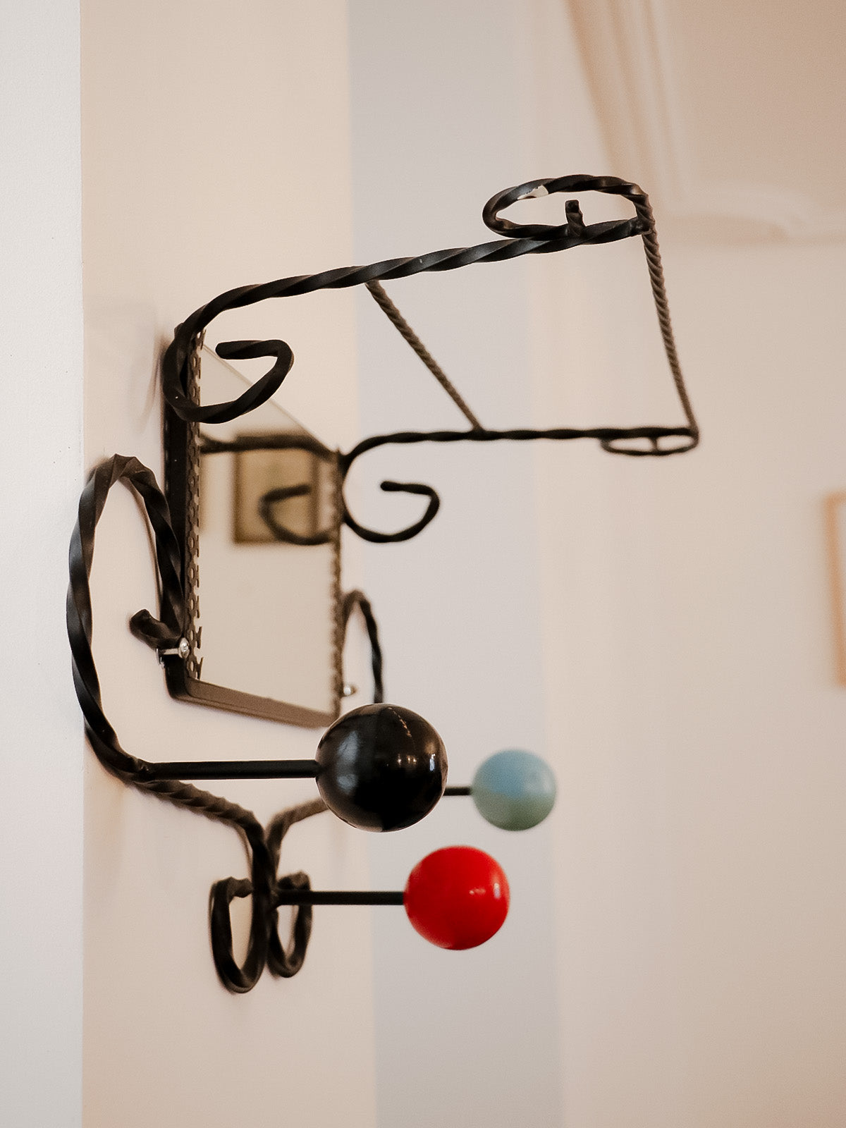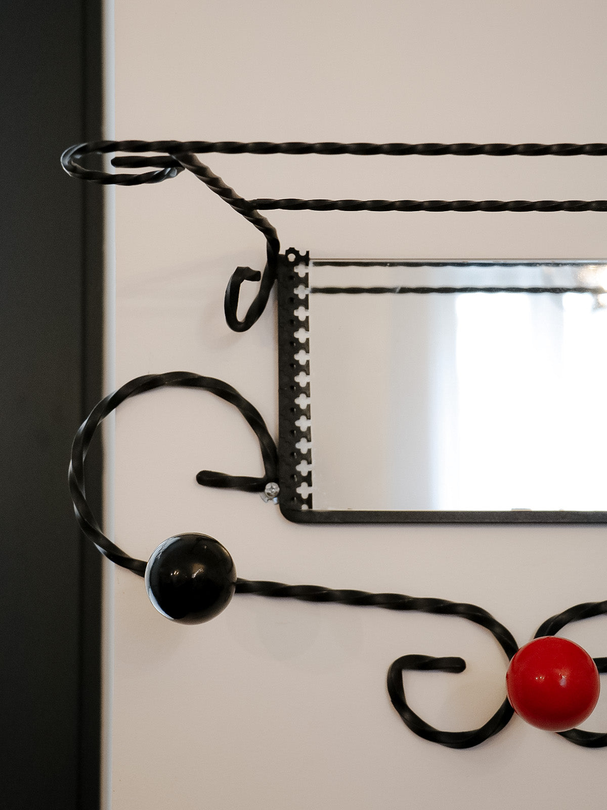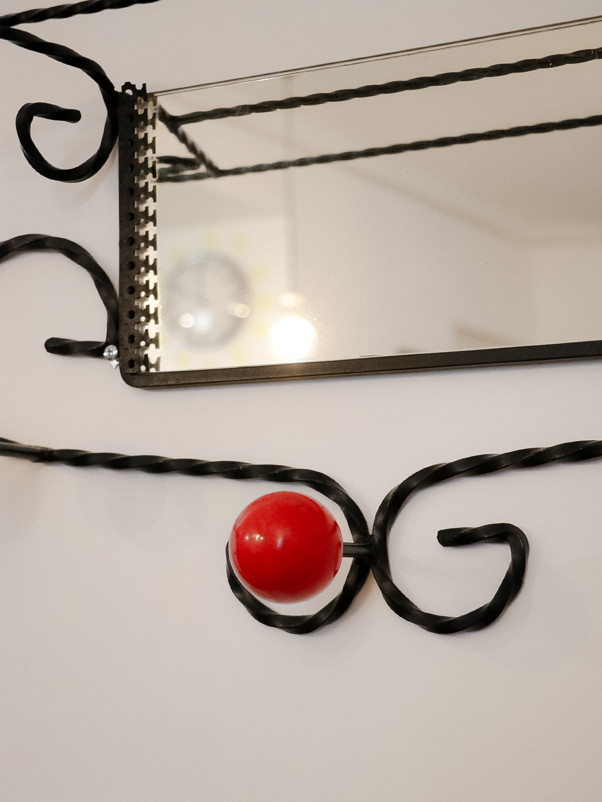 Embrace this 1960s-70s wrought iron coat rack, featuring an integrated mirror and three ball-shaped hooks in black, red, and blue. Its retro style and metalwork bring a handcrafted, graphic touch to an entryway or hallway. Compact and well-proportioned, it accommodates coats, bags, and scarves without cluttering the space, while also offering a handy mirror for a last-minute check before heading out. Its vintage charm creates a welcoming and warm atmosphere.