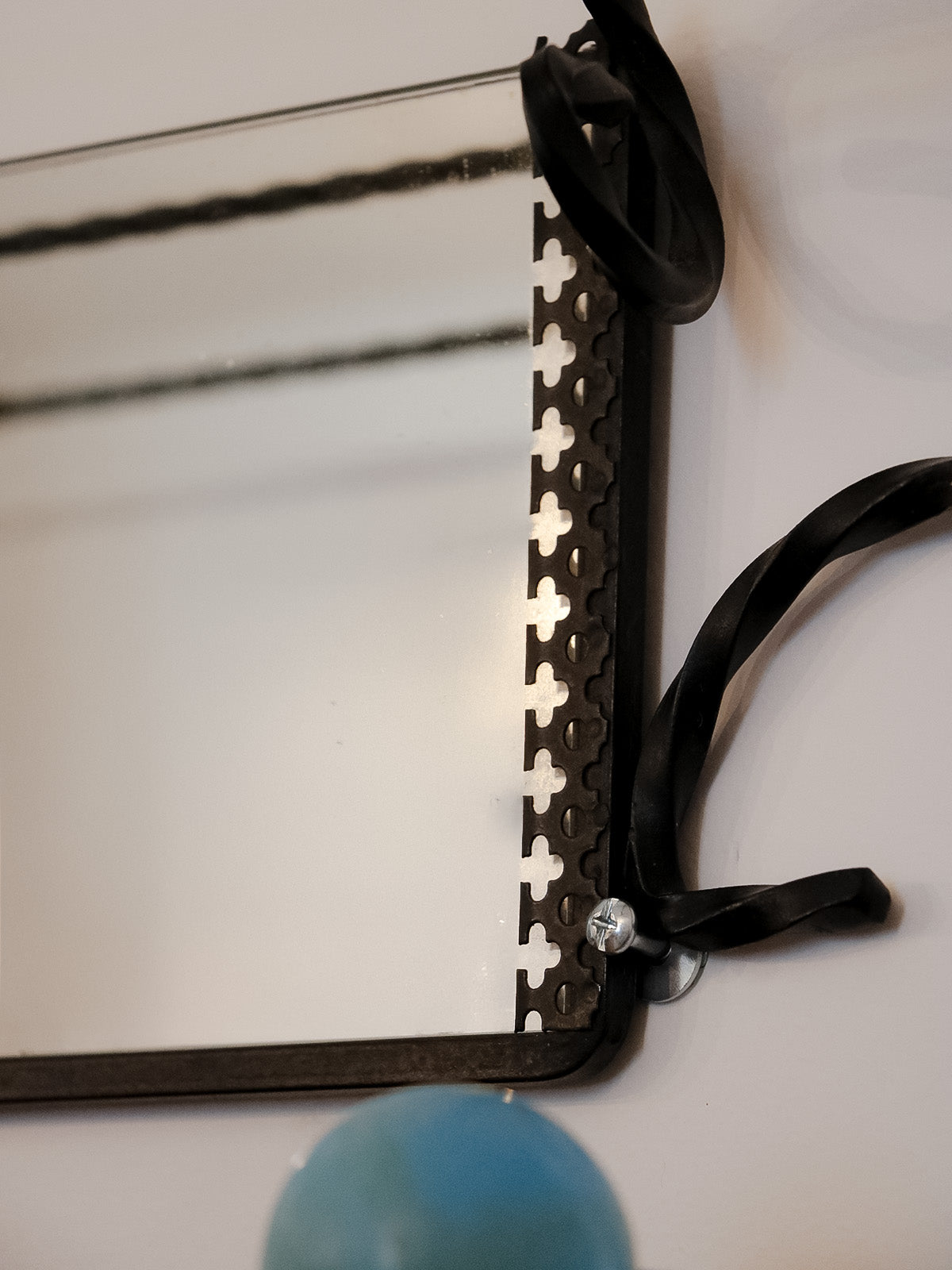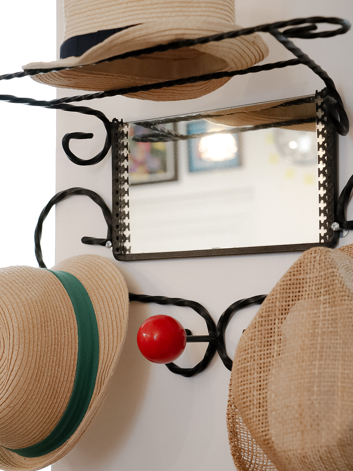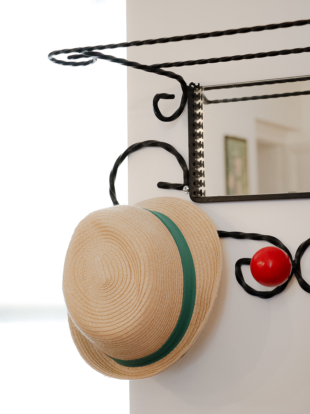 Embrace this 1960s-70s wrought iron coat rack, featuring an integrated mirror and three ball-shaped hooks in black, red, and blue. Its retro style and metalwork bring a handcrafted, graphic touch to an entryway or hallway. Compact and well-proportioned, it accommodates coats, bags, and scarves without cluttering the space, while also offering a handy mirror for a last-minute check before heading out. Its vintage charm creates a welcoming and warm atmosphere.