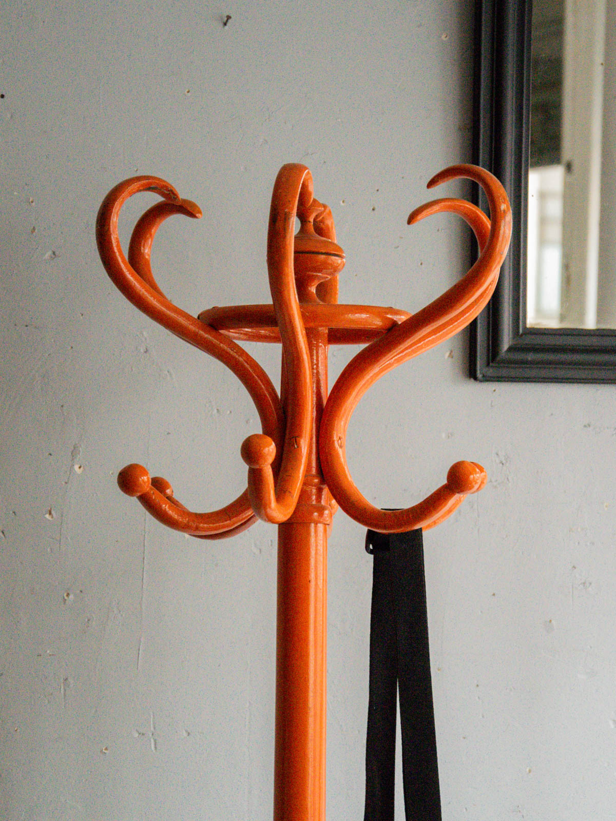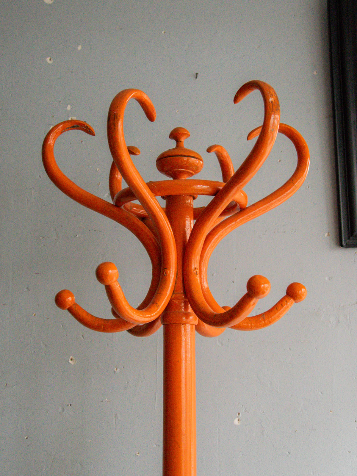 Add a touch of originality to your home with this Thonet coat rack in patinated orange wood, featuring a bold parrot design. Its elegant lines and vibrant color make it a decorative accessory while remaining functional. With some slight wear, this vintage piece bears witness to its history, adding a unique character to your décor. Ideal for an entryway or a cozy corner, it will appeal to lovers of contemporary and retro furniture.