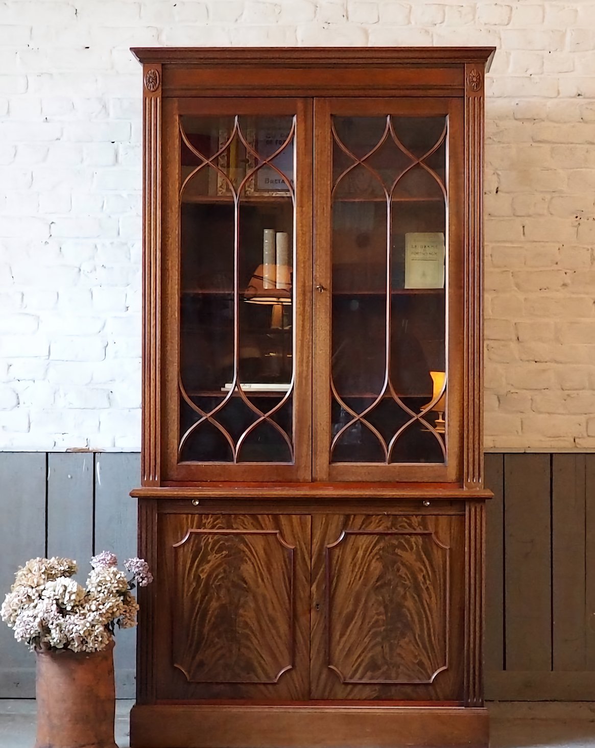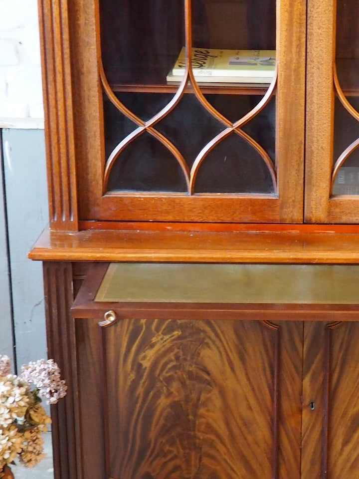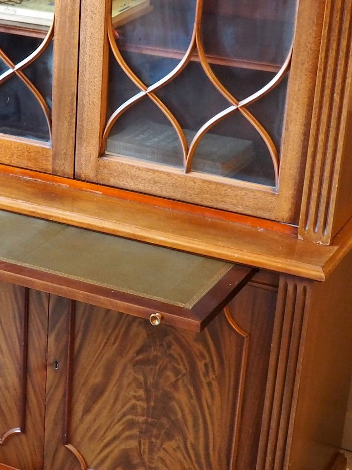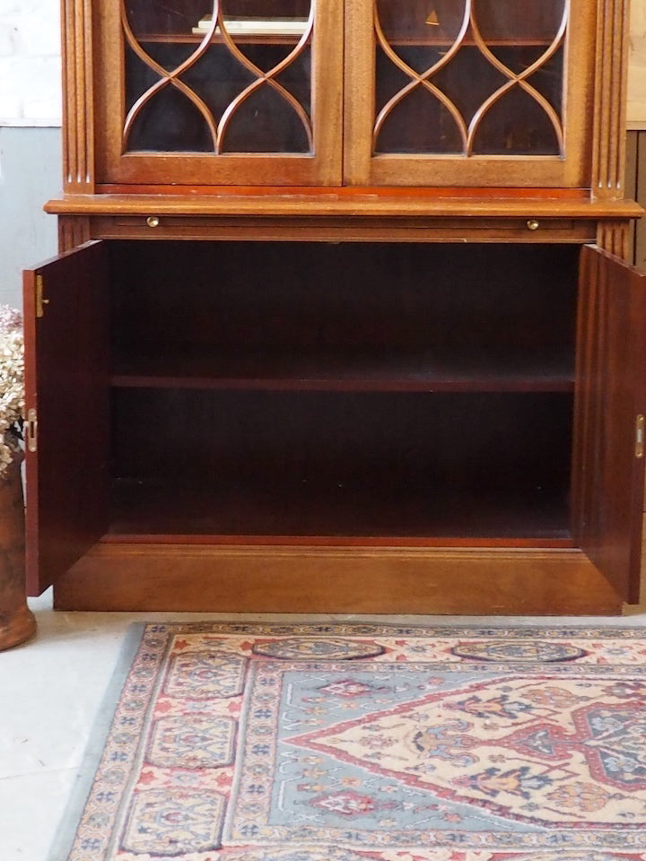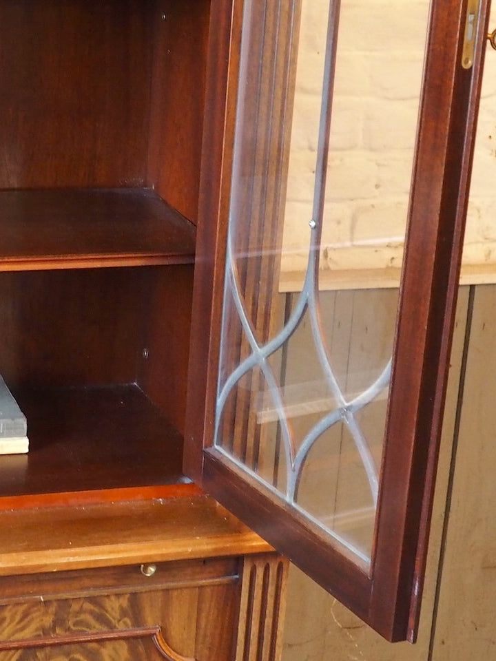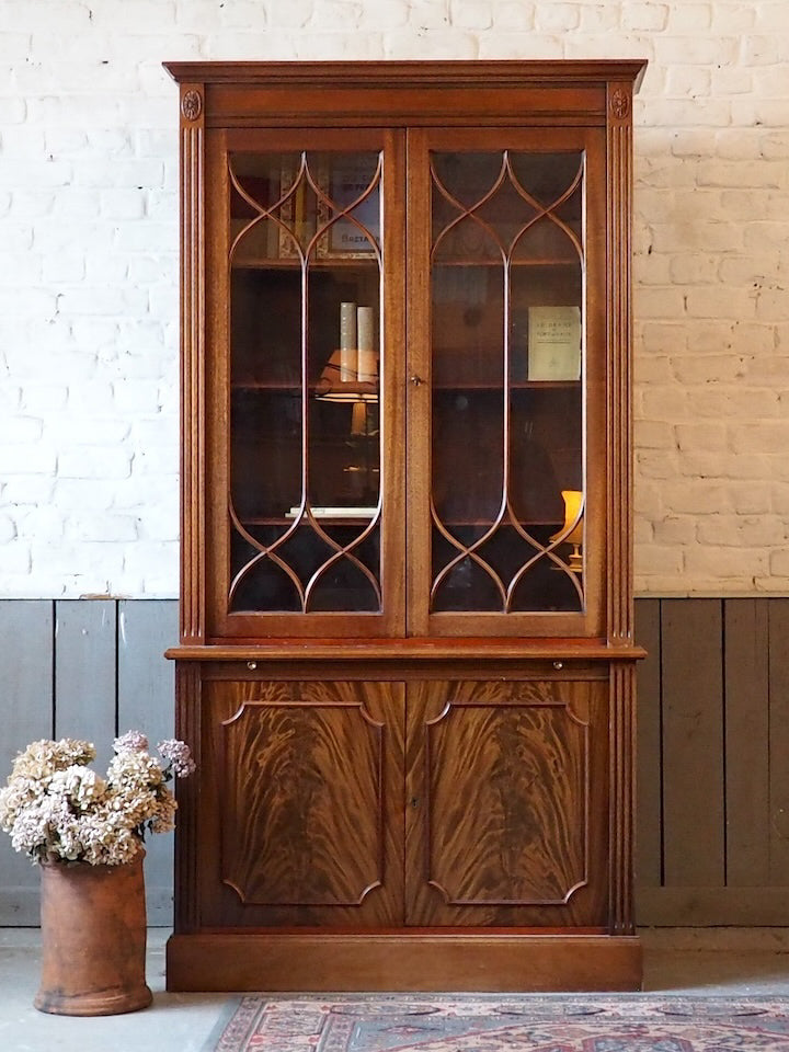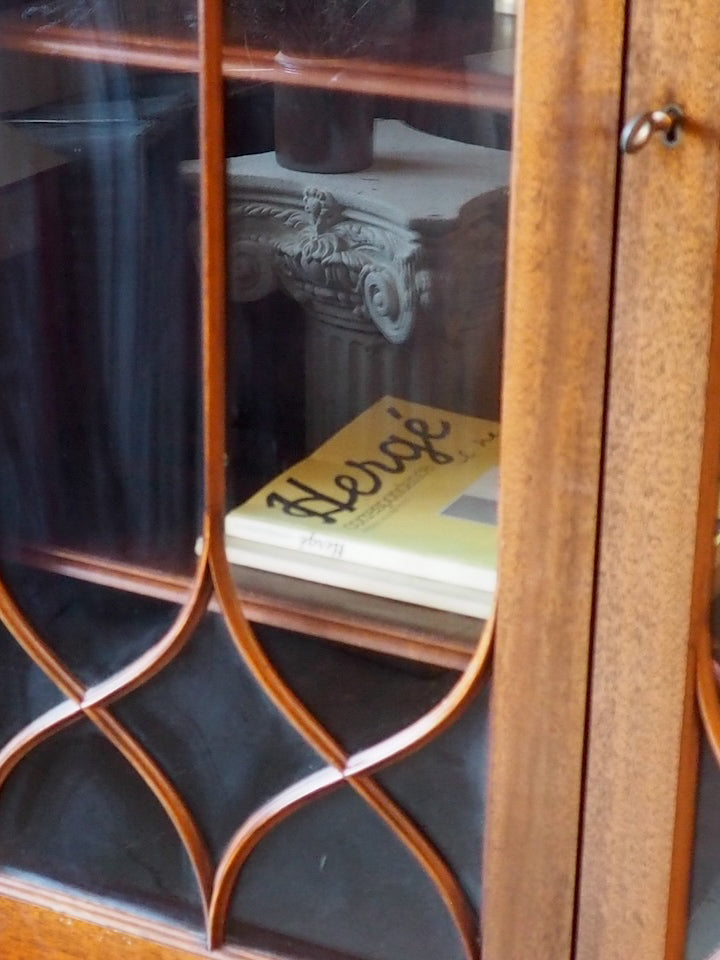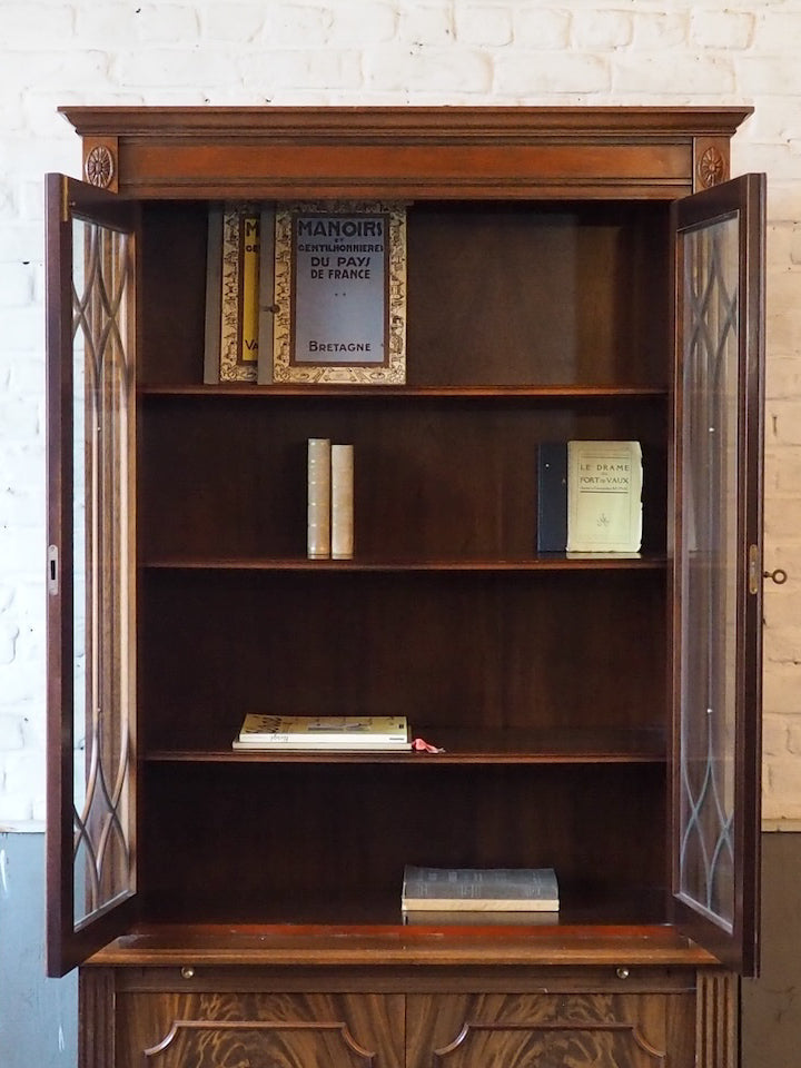 Discover this English mahogany sideboard in a Victorian style from the 1950s, where the wood's patina and refined lines create a warm and understated presence. The lower section offers ample storage behind two doors and a top covered in stretch leather, while the upper section, featuring two glass-fronted cabinets and shelves of varying heights, provides a place to display tableware and decorative objects. Its balanced proportions make it a perfect fit for both a traditional dining room and a contemporary interior.
