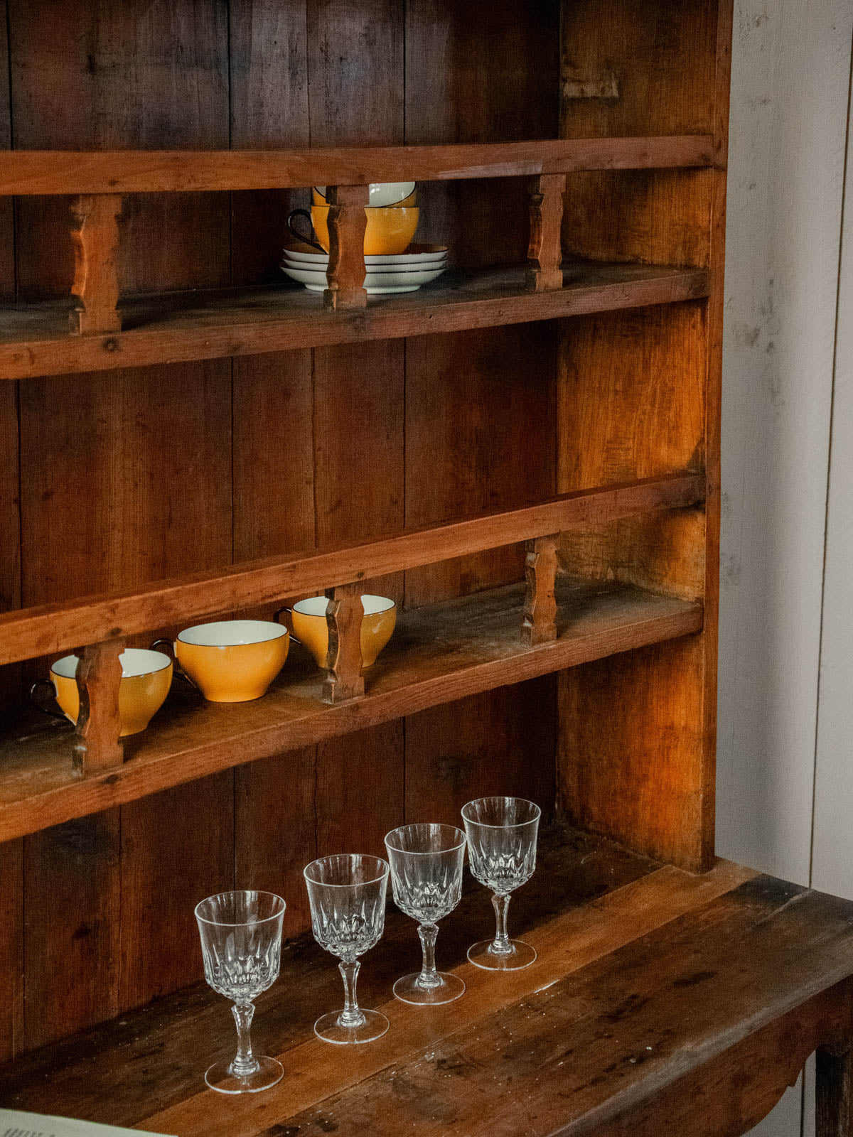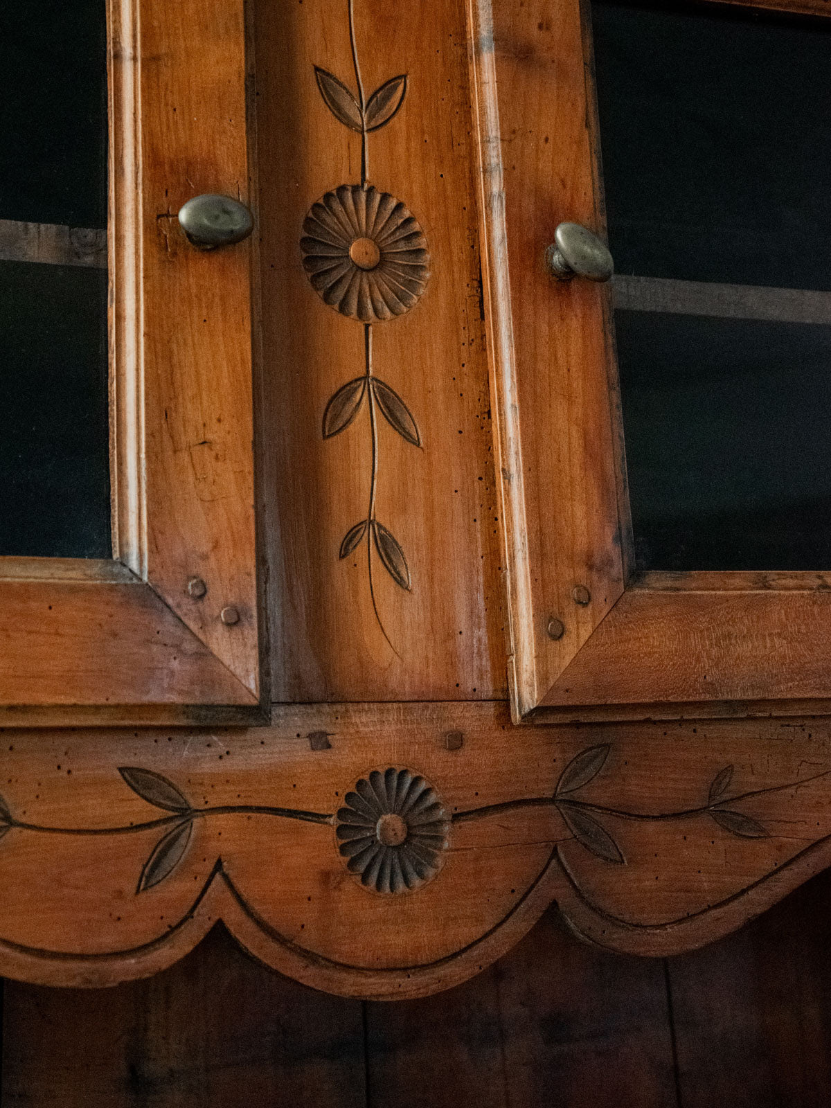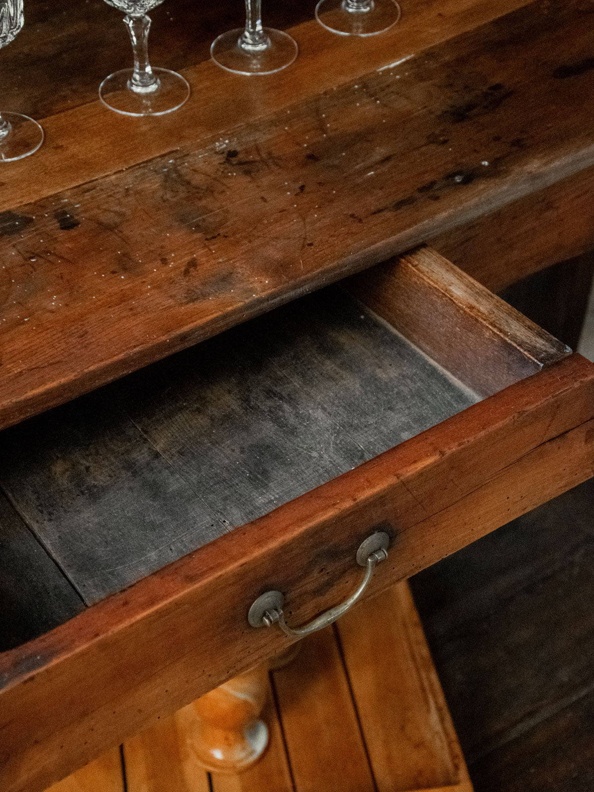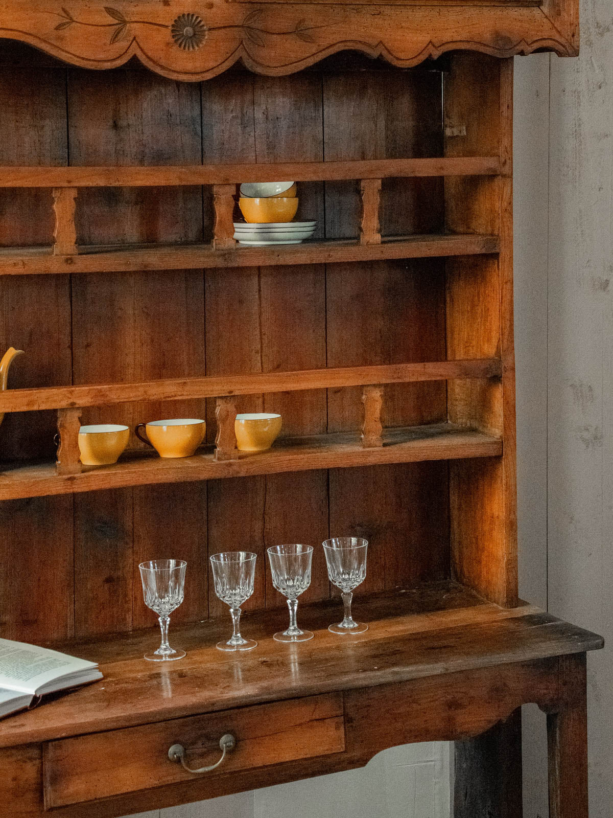 Elevate your dining room with this late 19th-early 20th century walnut sideboard, carved with an elegant floral design that tells a story. Its distinct sections—sideboard, serving cart, and glass-fronted cabinet—offer versatile storage for displaying dishes and decorative objects, while the brass handles add a touch of refinement. Placed on a raised platform and fully treated and protected, it exudes a warm and authentic presence, ideal for both classic and contemporary interiors. There are traces of woodworm and one damaged but sound door.