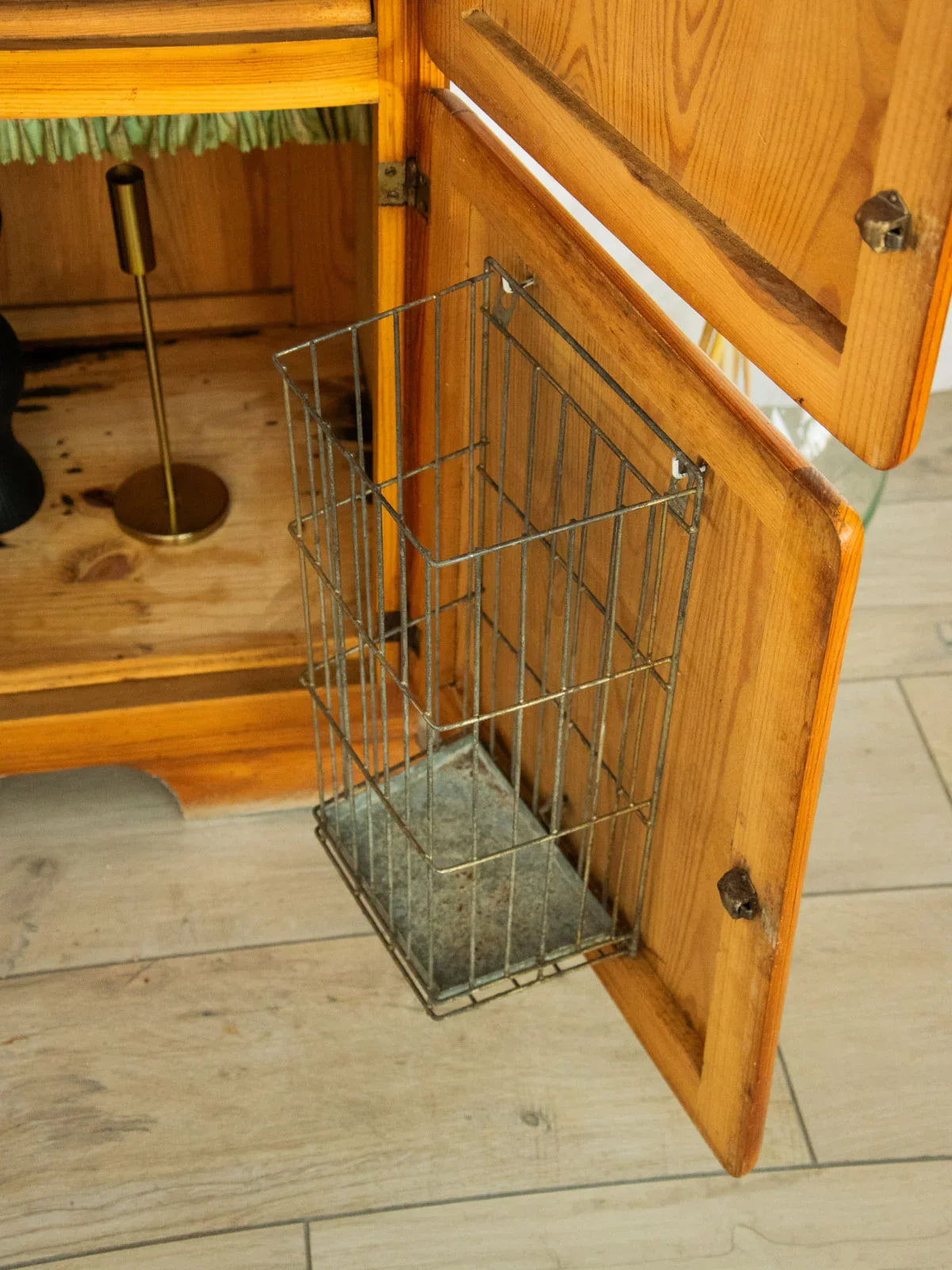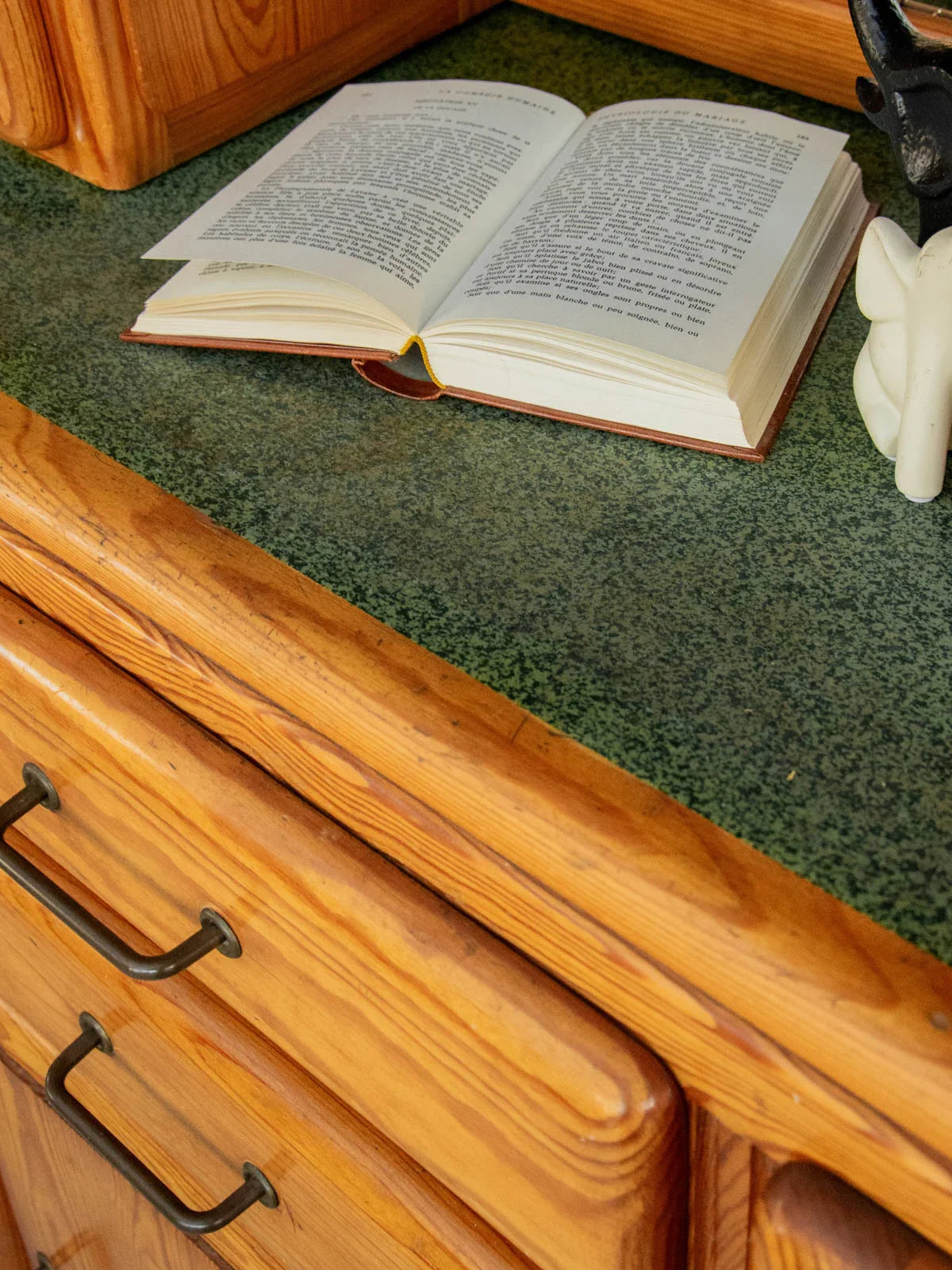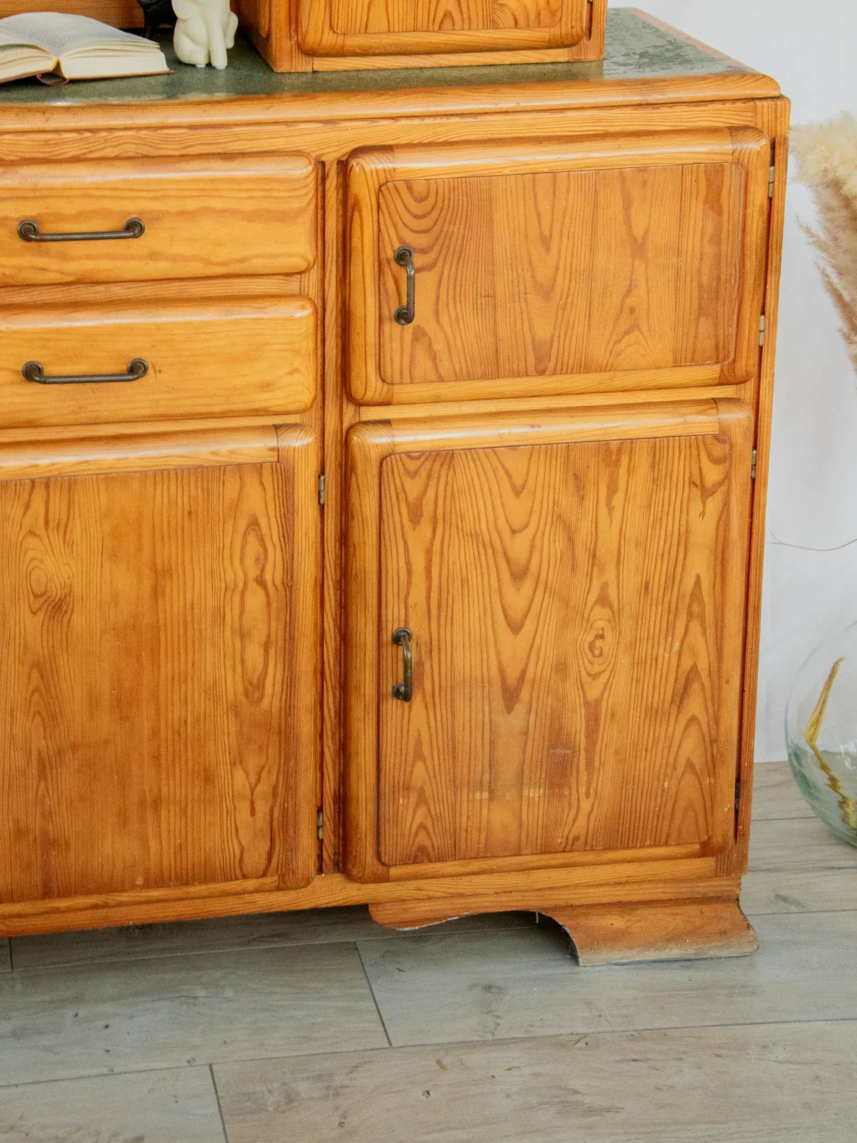 Discover this Mado pine sideboard, composed of two sections with retro charm and inviting lines. The upper section features two glass doors adorned with decorative motifs at the top and two wooden doors framing a mirror, ideal for showcasing dishes and decorative objects. The lower section offers five doors, two drawers, and an integrated bread basket—perfect for bread—providing functional storage for the kitchen or dining room, while the natural patina of the pine creates a warm and authentic atmosphere. There are some signs of age throughout the piece and ink stains inside the lower cabinet.