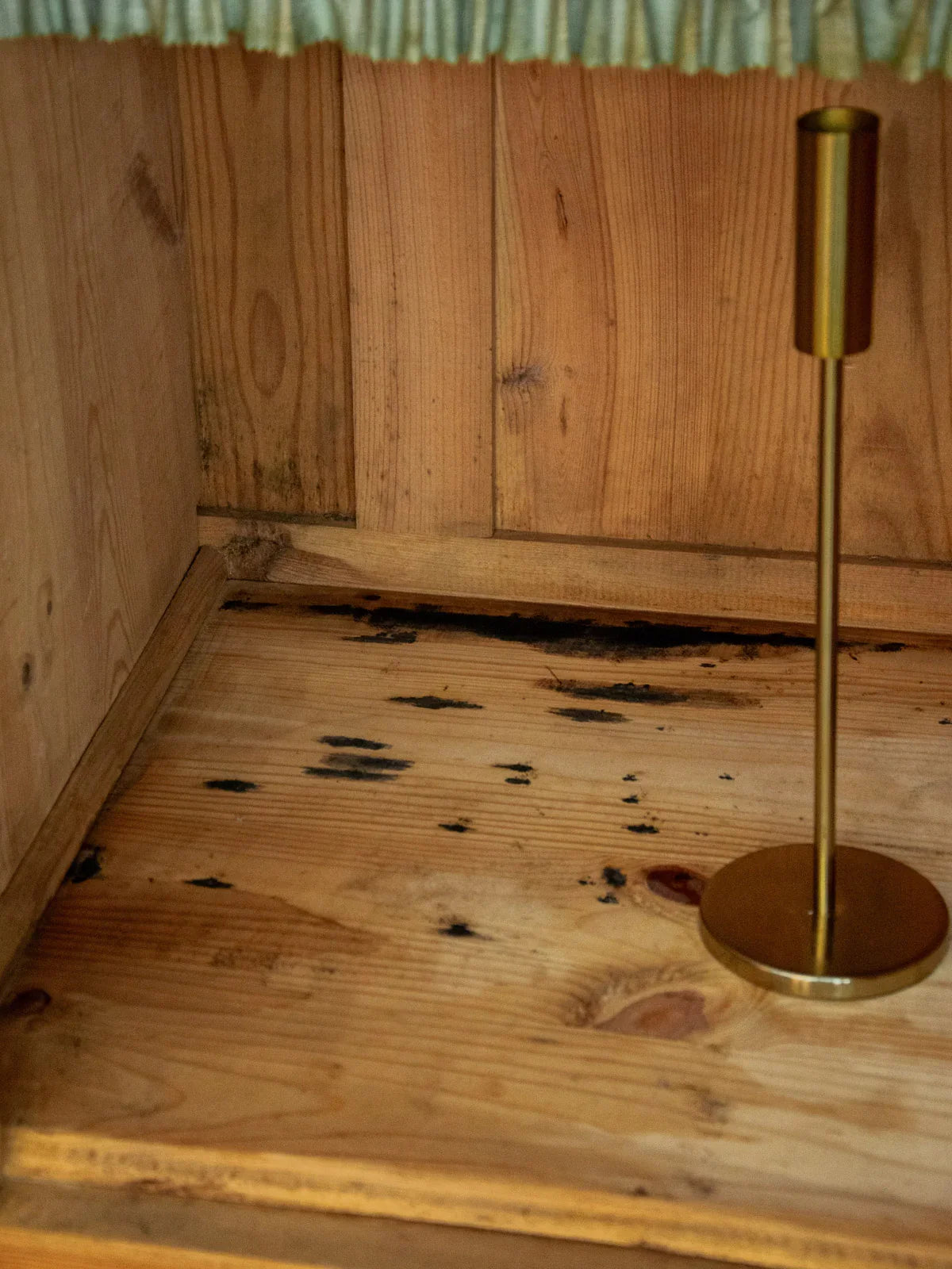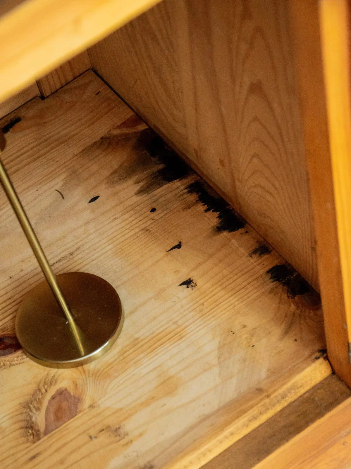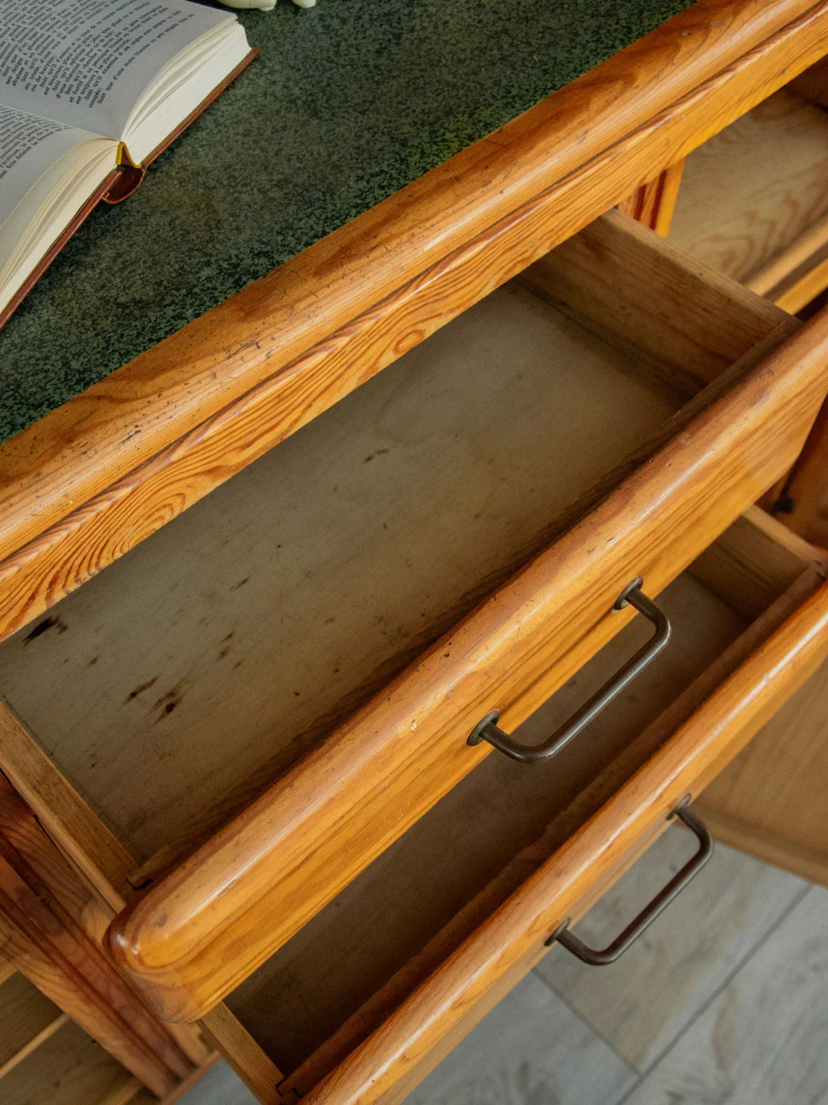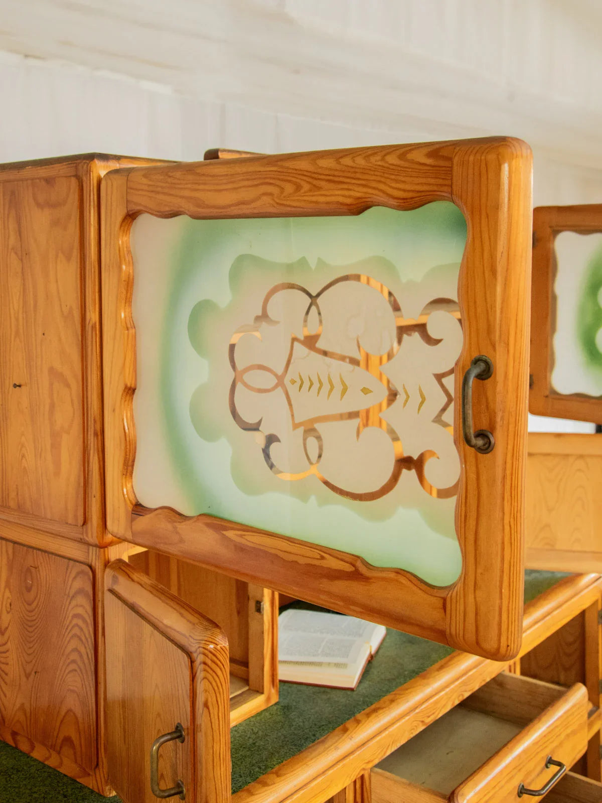 Discover this Mado pine sideboard, composed of two sections with retro charm and inviting lines. The upper section features two glass doors adorned with decorative motifs at the top and two wooden doors framing a mirror, ideal for showcasing dishes and decorative objects. The lower section offers five doors, two drawers, and an integrated bread basket—perfect for bread—providing functional storage for the kitchen or dining room, while the natural patina of the pine creates a warm and authentic atmosphere. There are some signs of age throughout the piece and ink stains inside the lower cabinet.