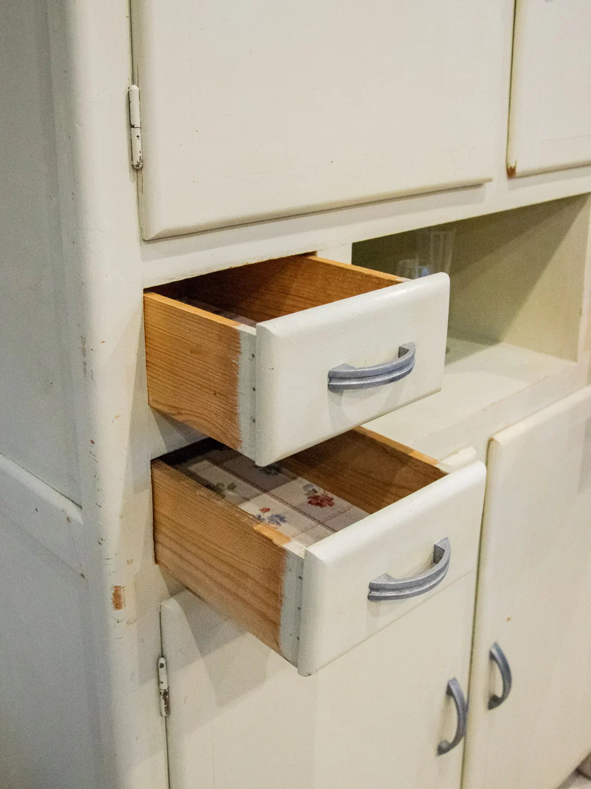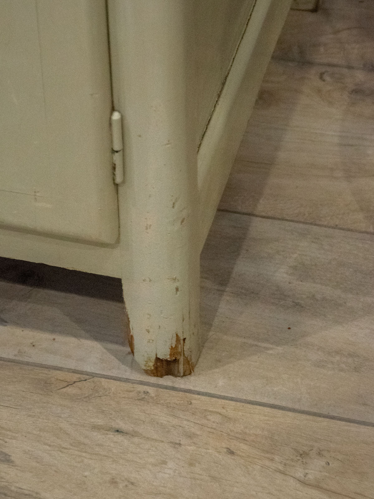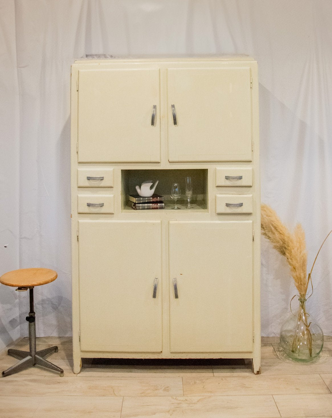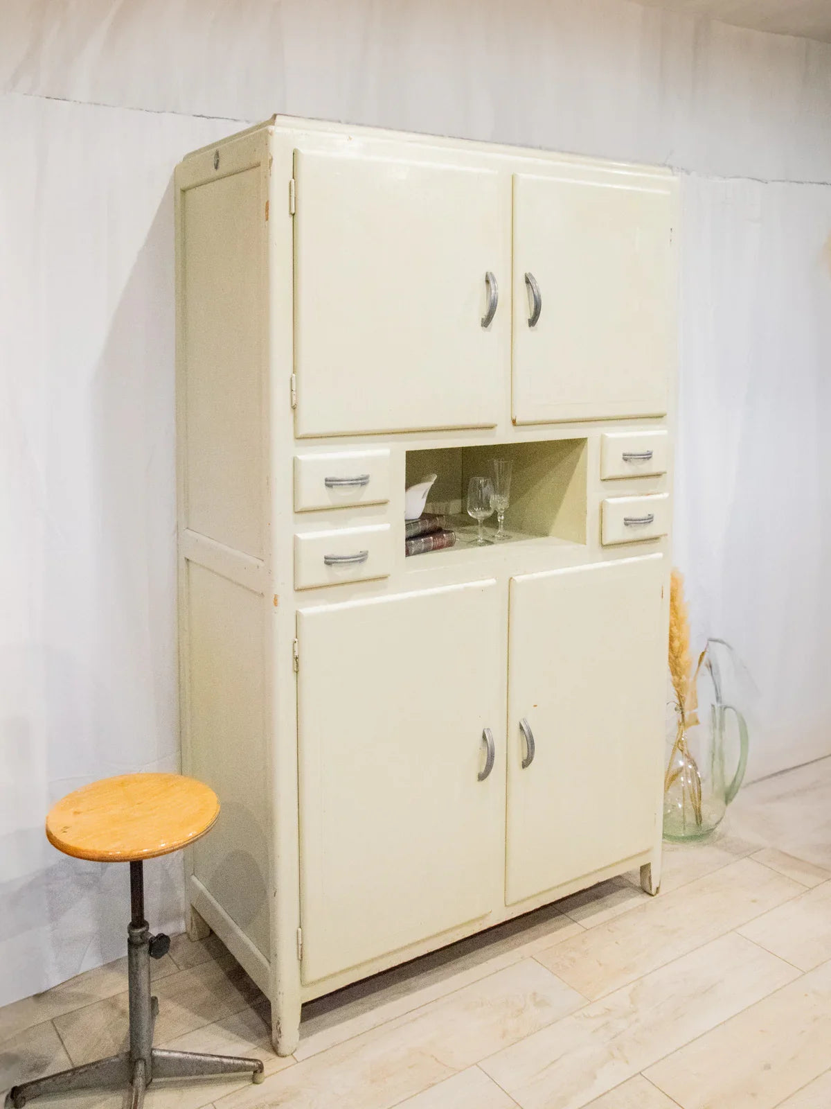 Embrace this authentic and compact grey-beige cabinet, which exudes a discreet charm thanks to its angled handles and patinated paint. Designed for practicality, it features two cupboards, four drawers—including one specifically designed for cutlery—adjustable interior shelves, integrated hooks, and various storage compartments, while the back panels and shelves are protected by a plastic film. Its compact size makes it ideal for a kitchen, laundry room, or entryway, where it creates a warm and organized atmosphere. Several paint chips, various signs of age, and a damaged but stable front right leg all attest to its unique and authentic character.