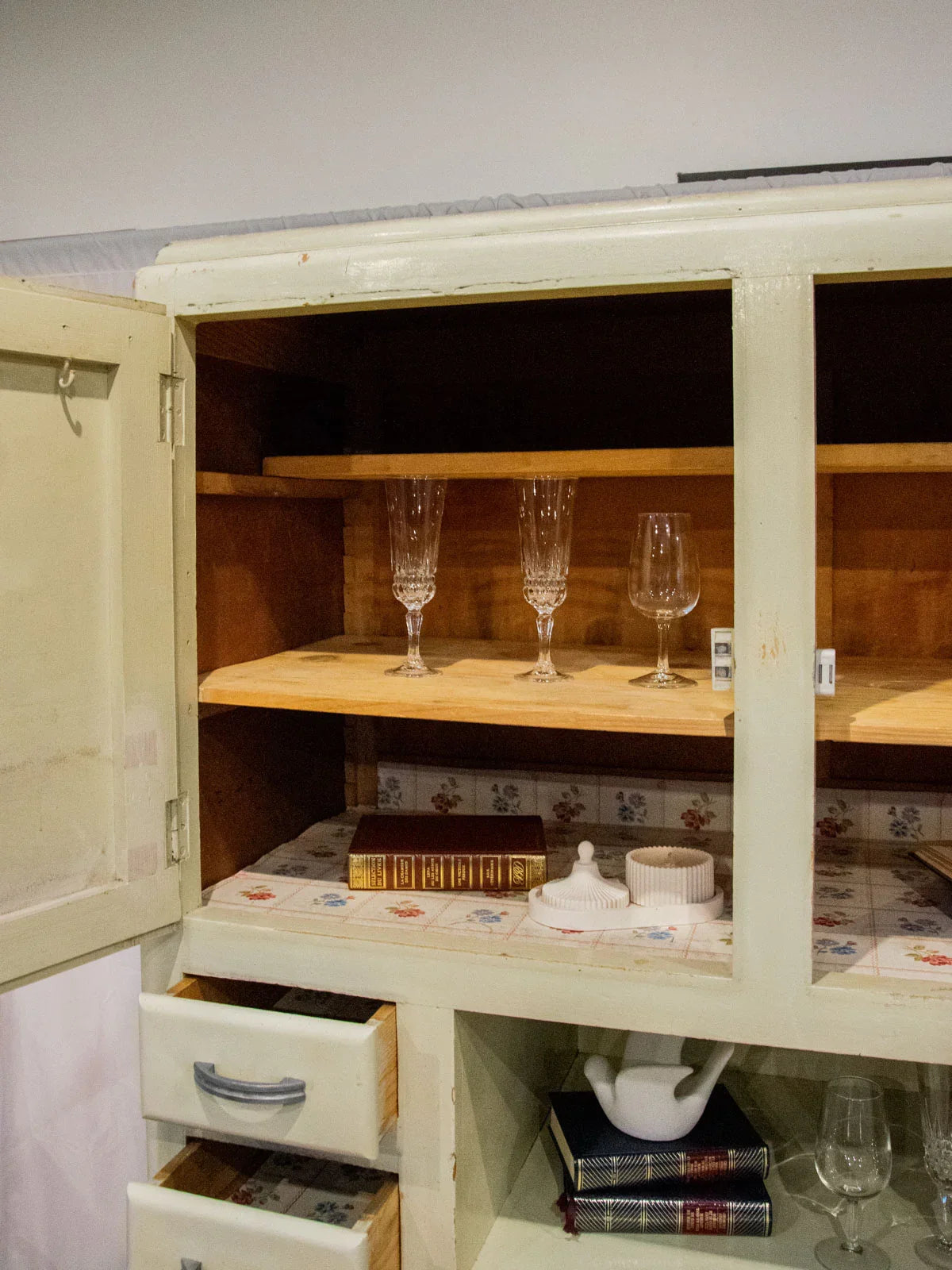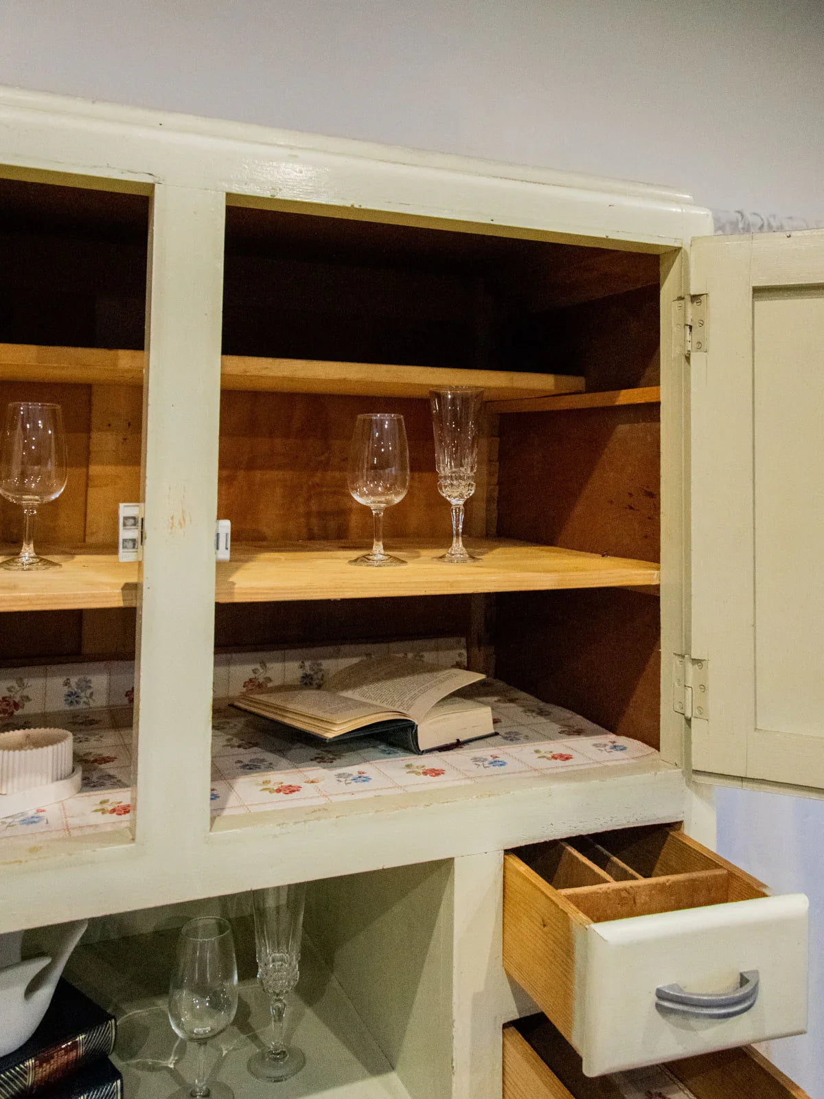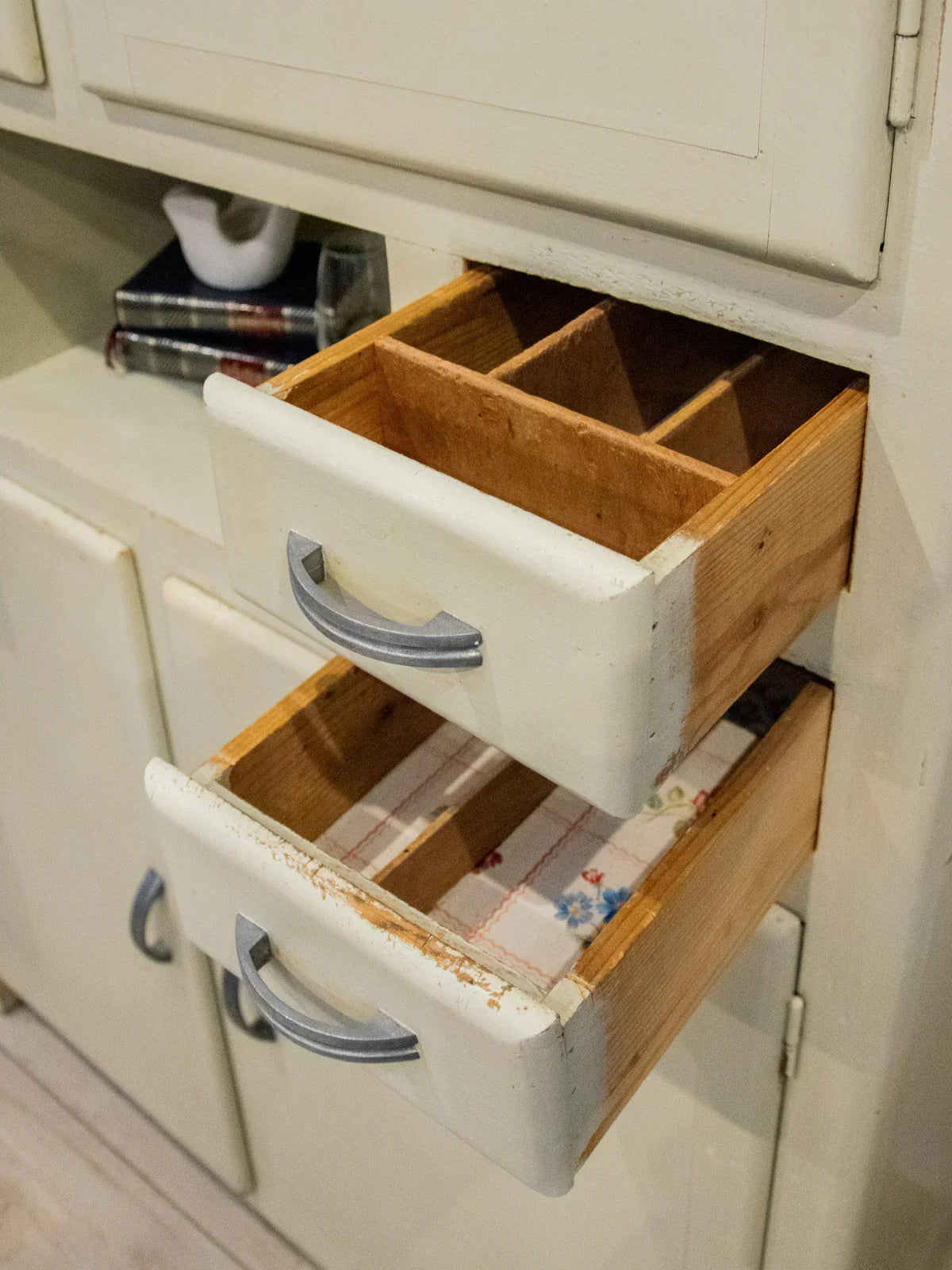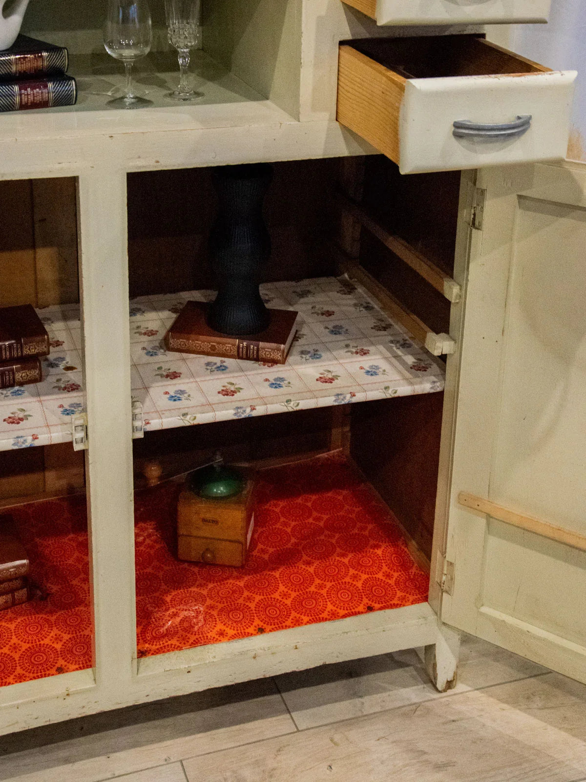 Embrace this authentic and compact grey-beige cabinet, which exudes a discreet charm thanks to its angled handles and patinated paint. Designed for practicality, it features two cupboards, four drawers—including one specifically designed for cutlery—adjustable interior shelves, integrated hooks, and various storage compartments, while the back panels and shelves are protected by a plastic film. Its compact size makes it ideal for a kitchen, laundry room, or entryway, where it creates a warm and organized atmosphere. Several paint chips, various signs of age, and a damaged but stable front right leg all attest to its unique and authentic character.