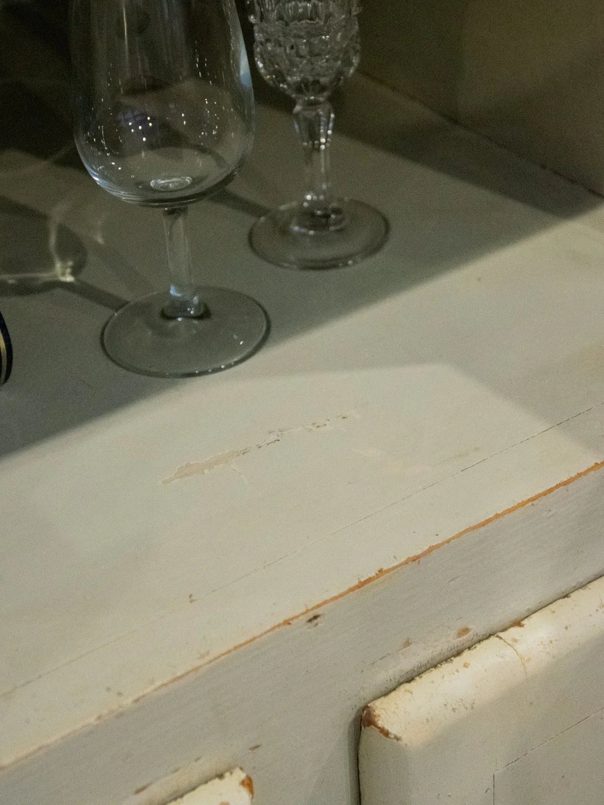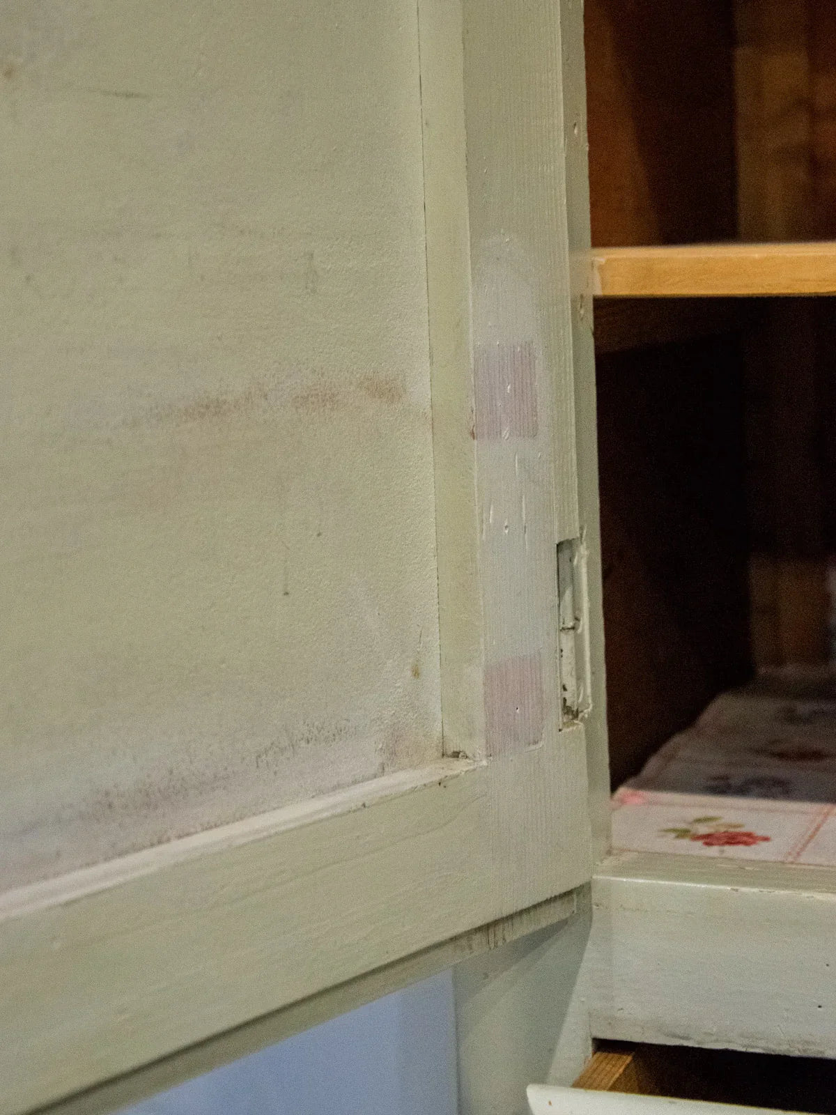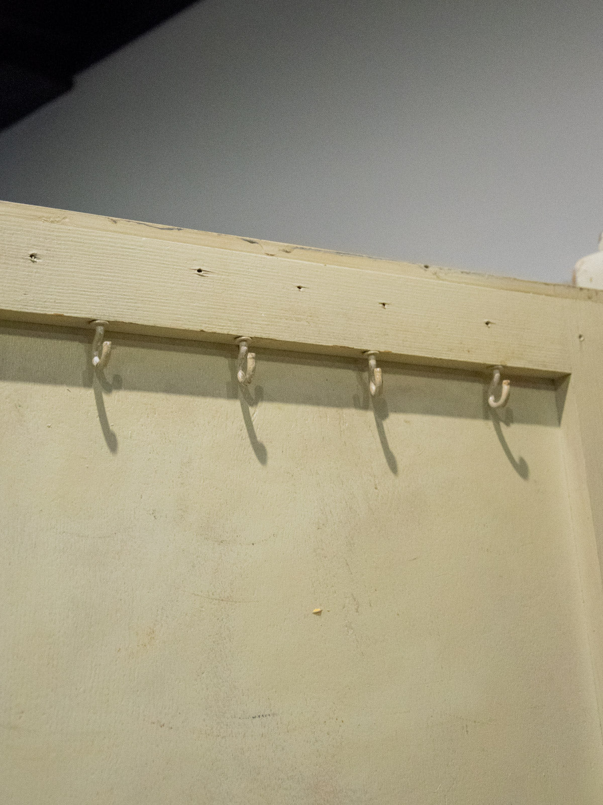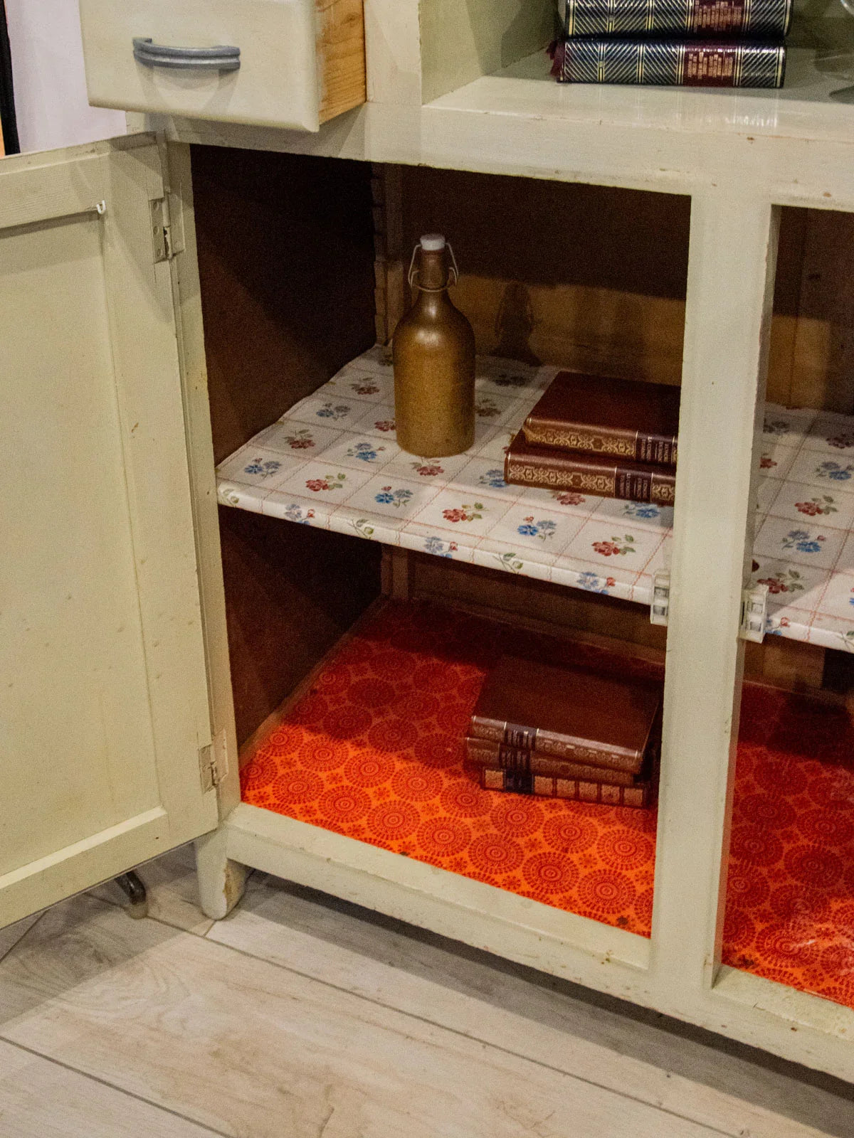 Embrace this authentic and compact grey-beige cabinet, which exudes a discreet charm thanks to its angled handles and patinated paint. Designed for practicality, it features two cupboards, four drawers—including one specifically designed for cutlery—adjustable interior shelves, integrated hooks, and various storage compartments, while the back panels and shelves are protected by a plastic film. Its compact size makes it ideal for a kitchen, laundry room, or entryway, where it creates a warm and organized atmosphere. Several paint chips, various signs of age, and a damaged but stable front right leg all attest to its unique and authentic character.