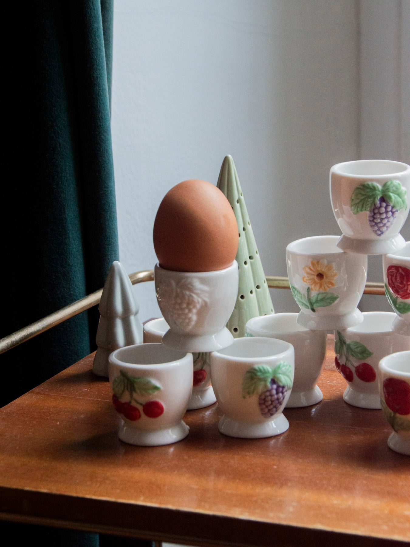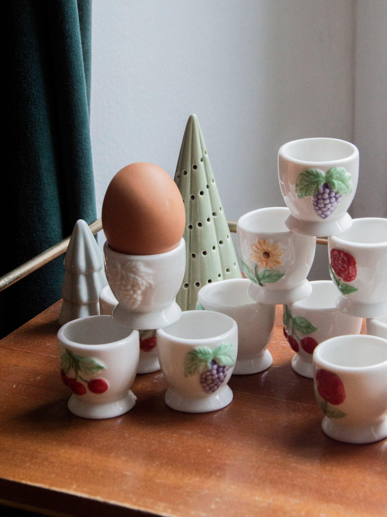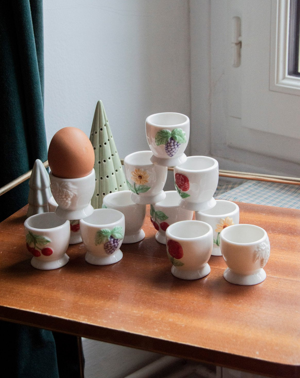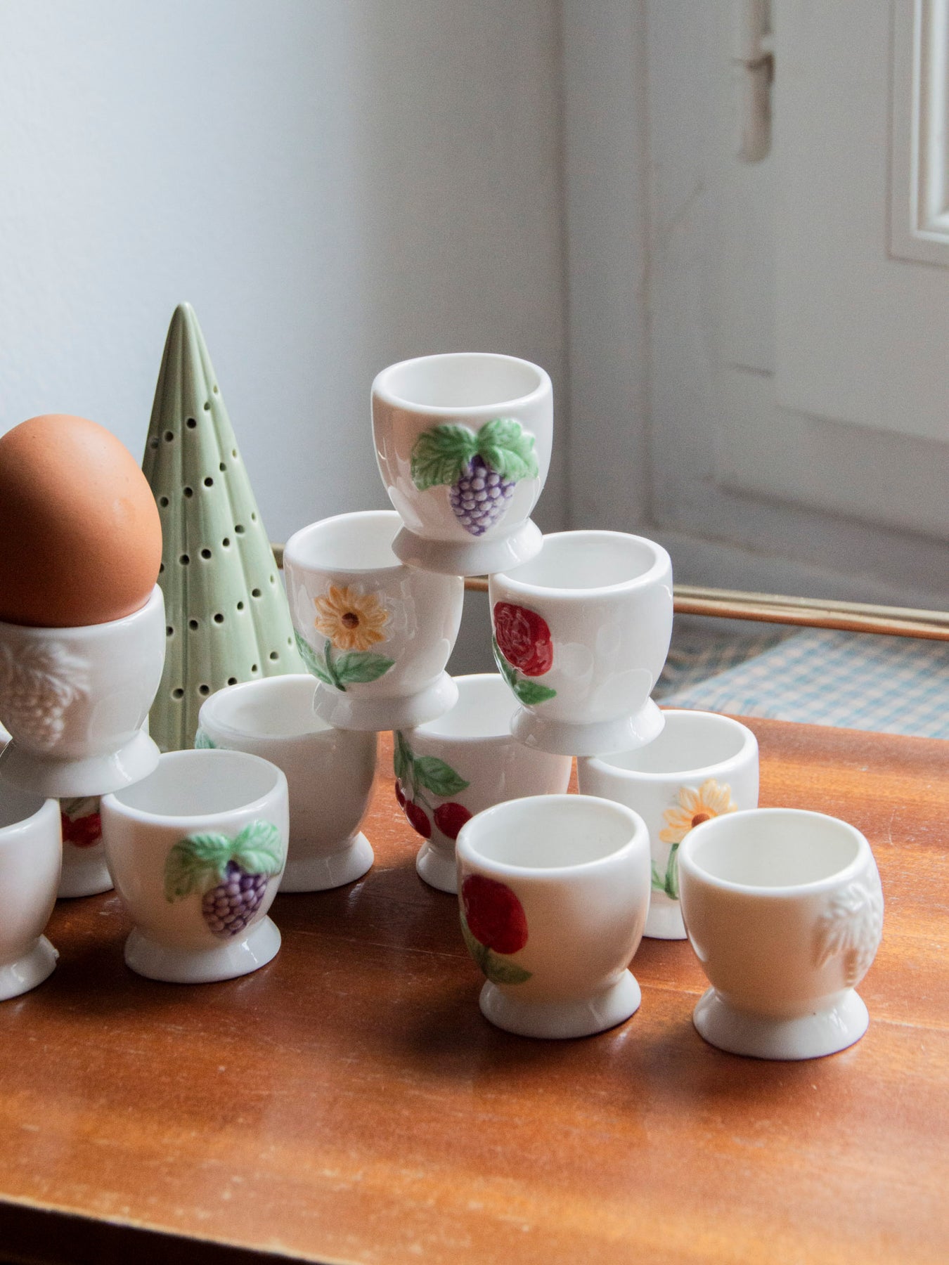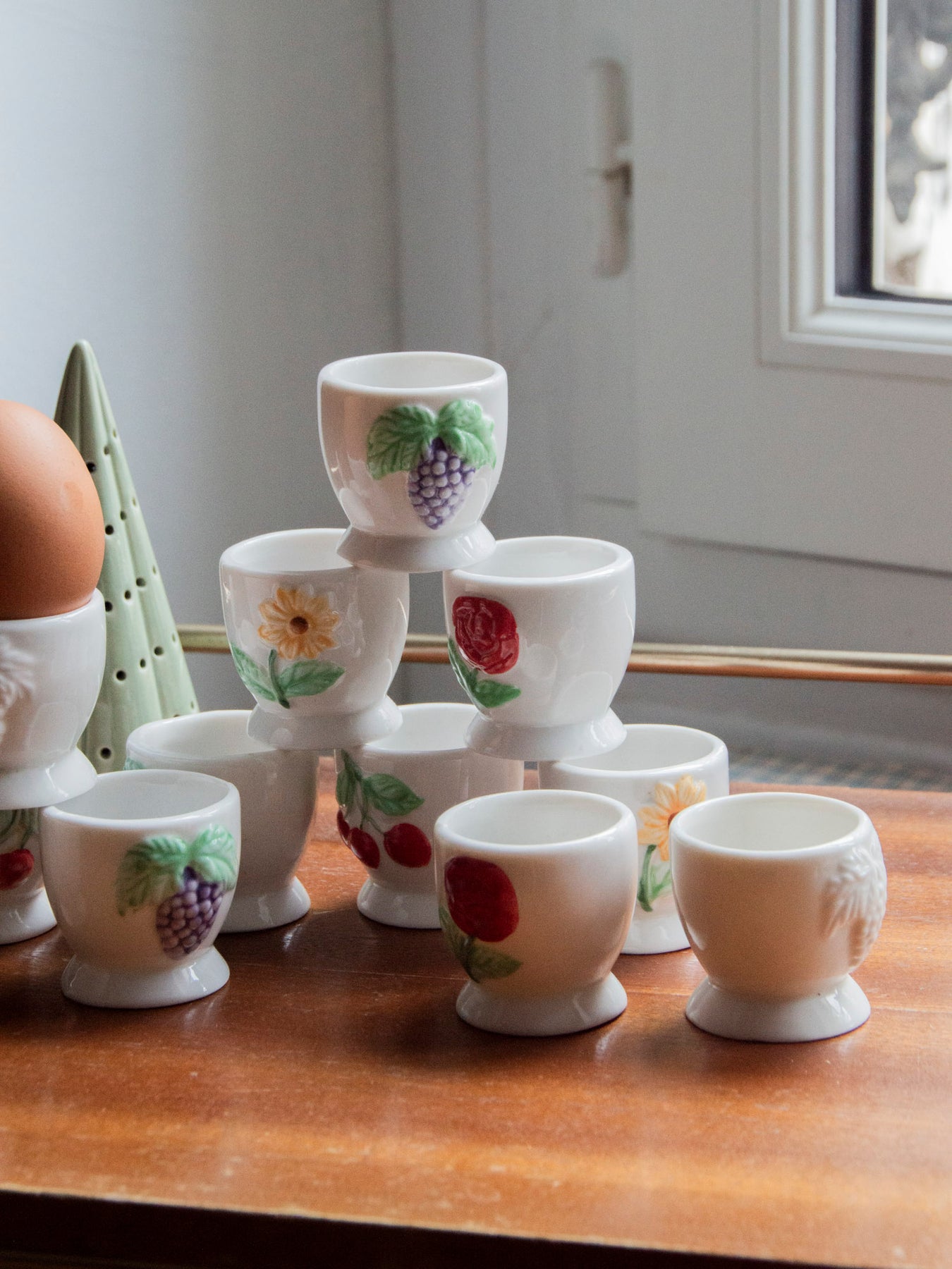 Add these white ceramic egg cups to your table for a delightful breakfast. Their compact size is perfect for a soft-boiled egg, while the simple rim showcases colorful designs—sunflowers, grapes, cherries, and roses—that lend a rustic and inviting touch. Easy to coordinate with neutral tableware, they create a warm and elegant atmosphere. A charming detail to brighten your mornings.