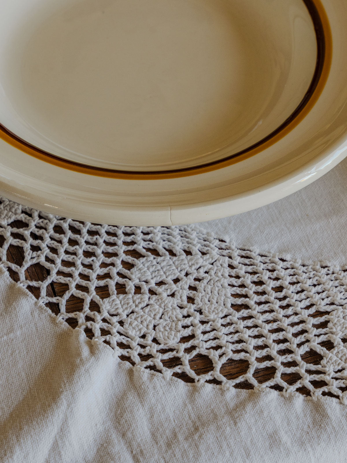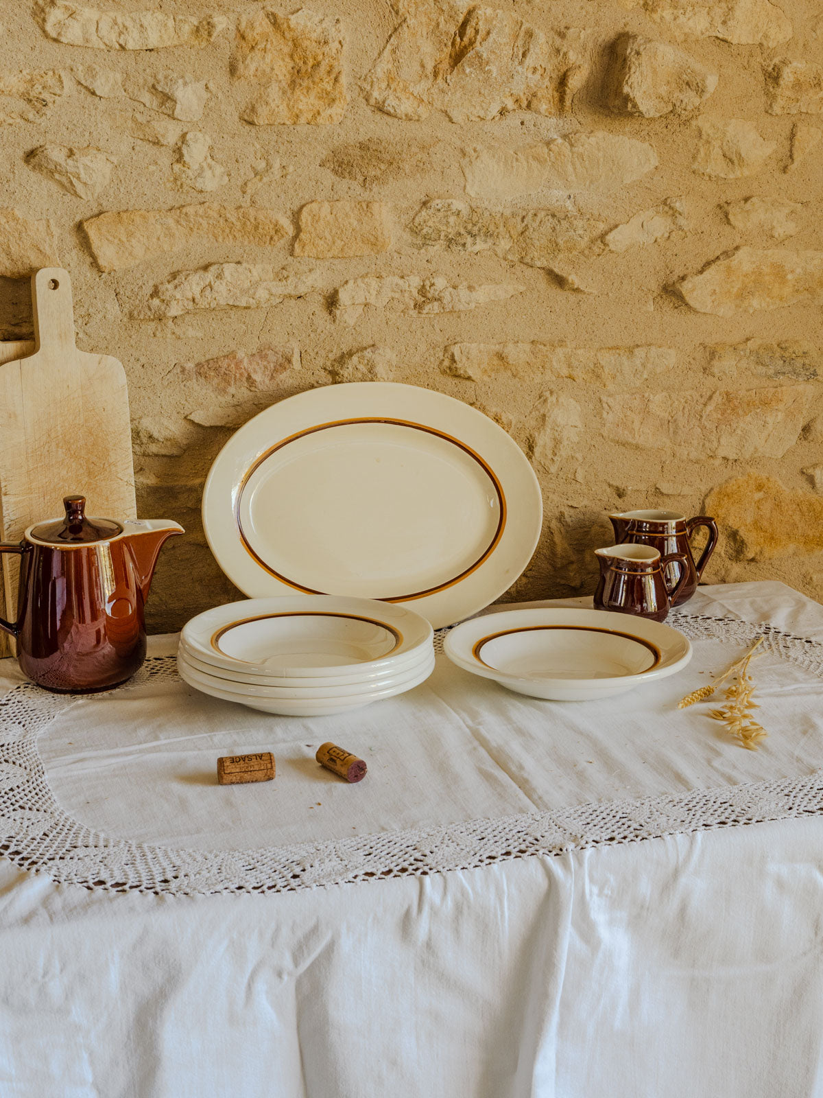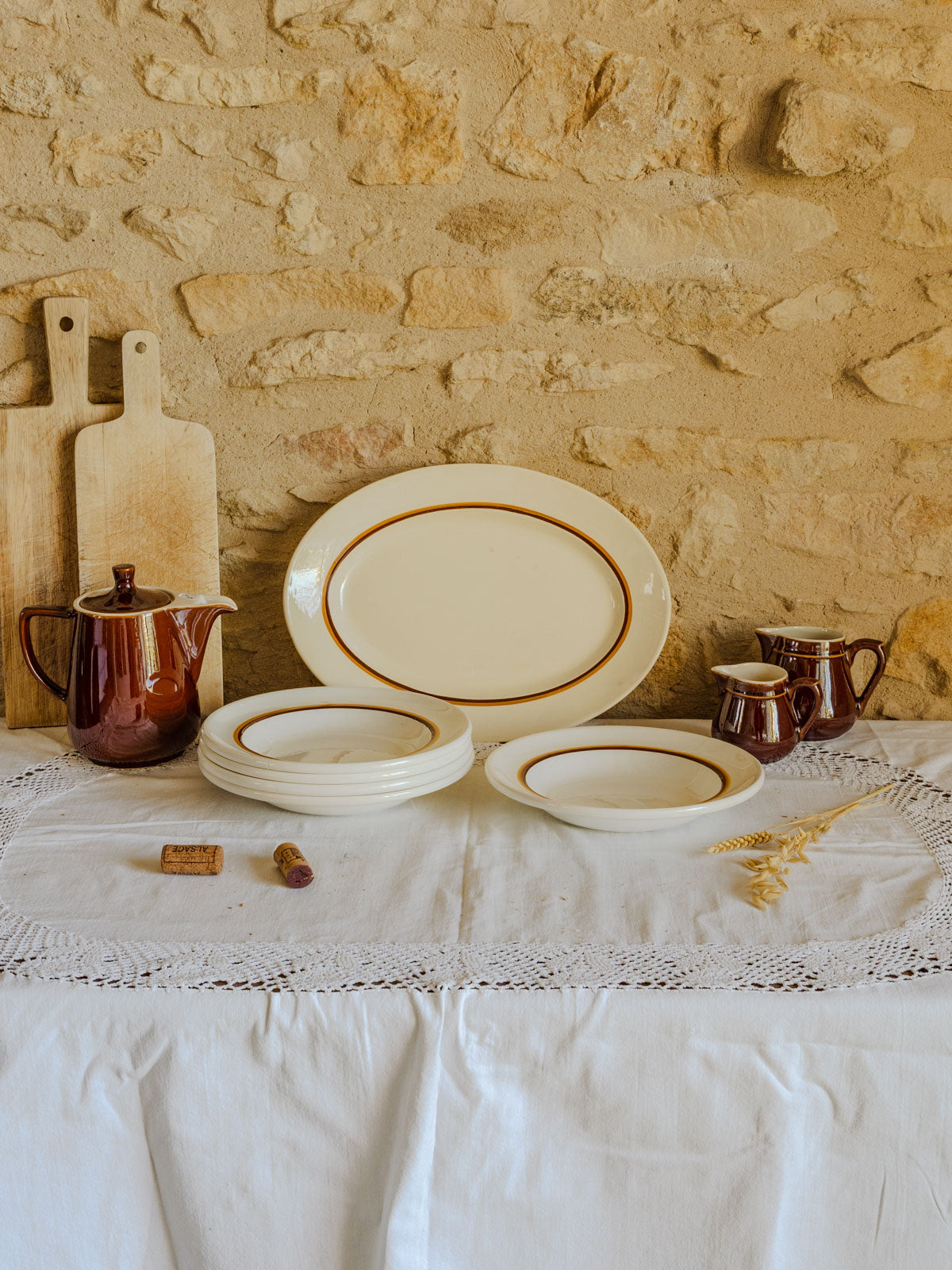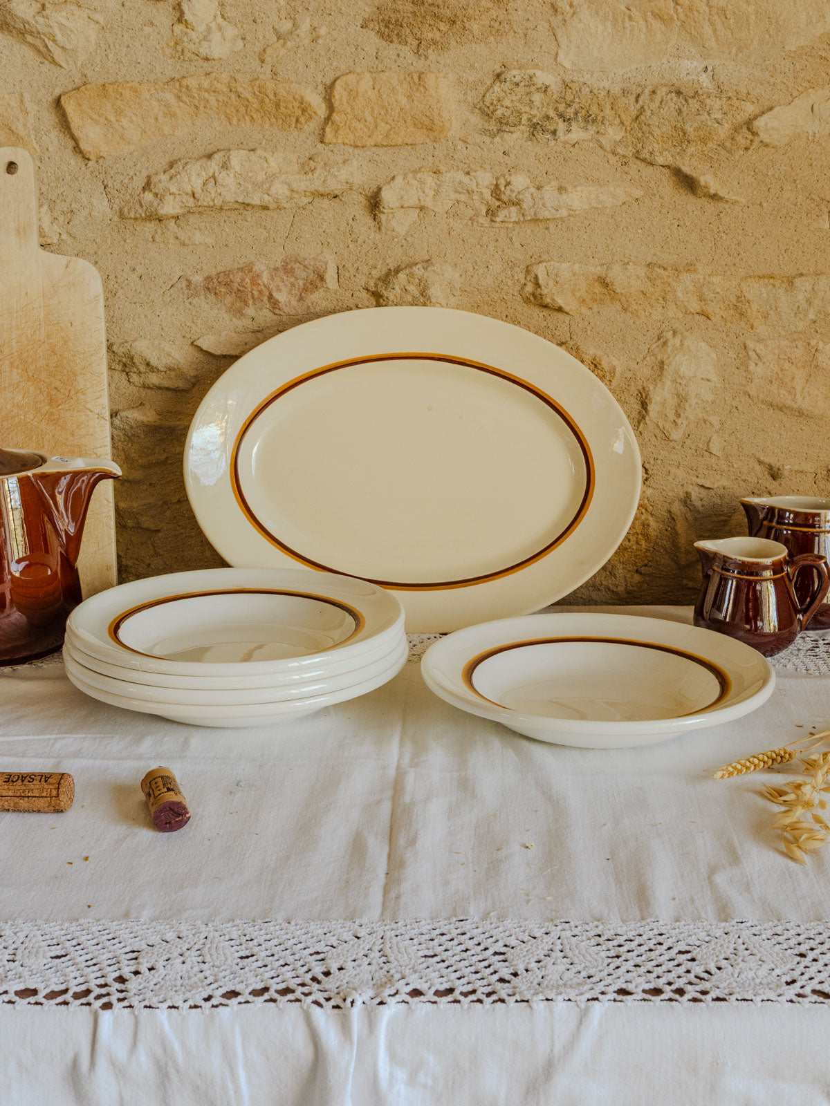 Discover this 1970s Oigoin & Sarreguemines earthenware dinner service, its off-white color delicately highlighted by a brown and orange rim. The oval platter is perfect for roasts and sharing platters, while the five soup plates are ideal for soups, pasta, and casual meals, creating a table setting with understated retro charm. Some manufacturing marks are visible.