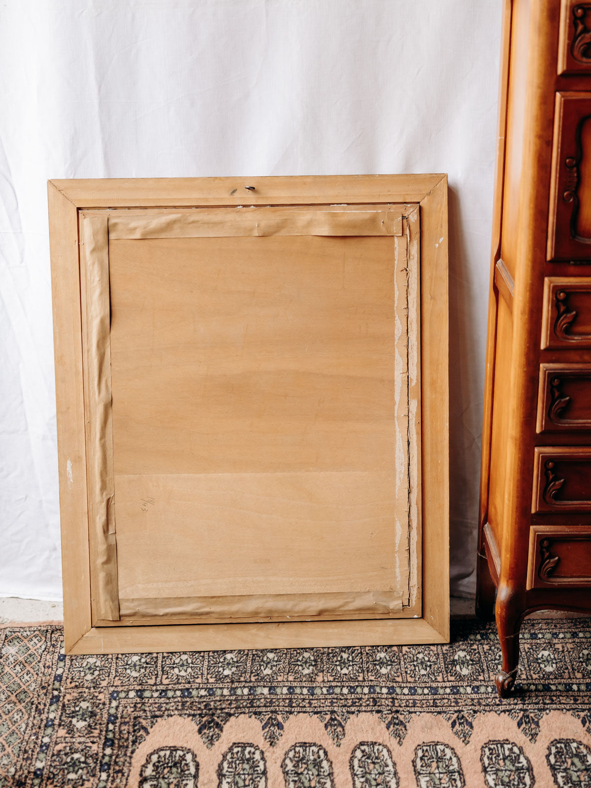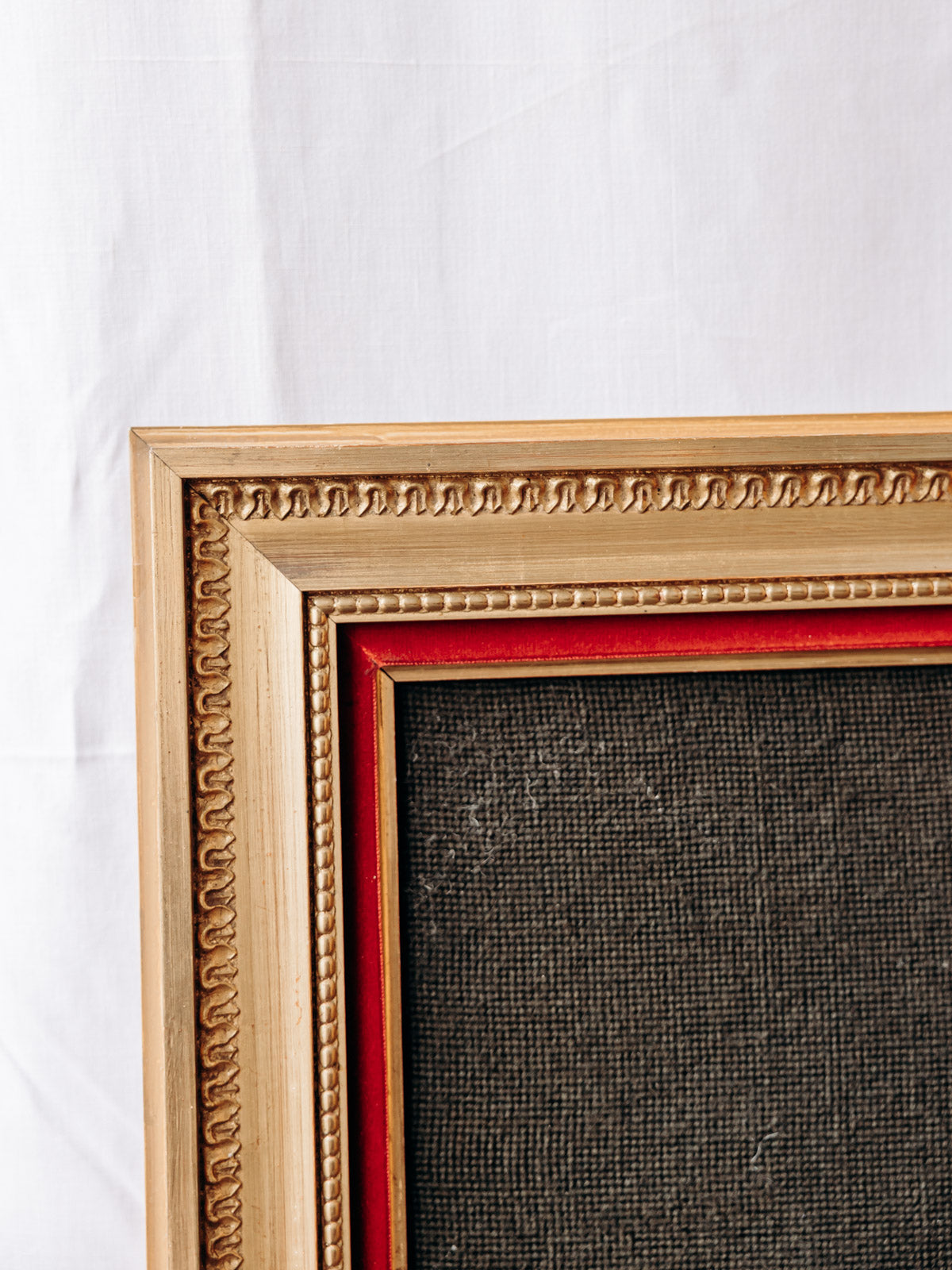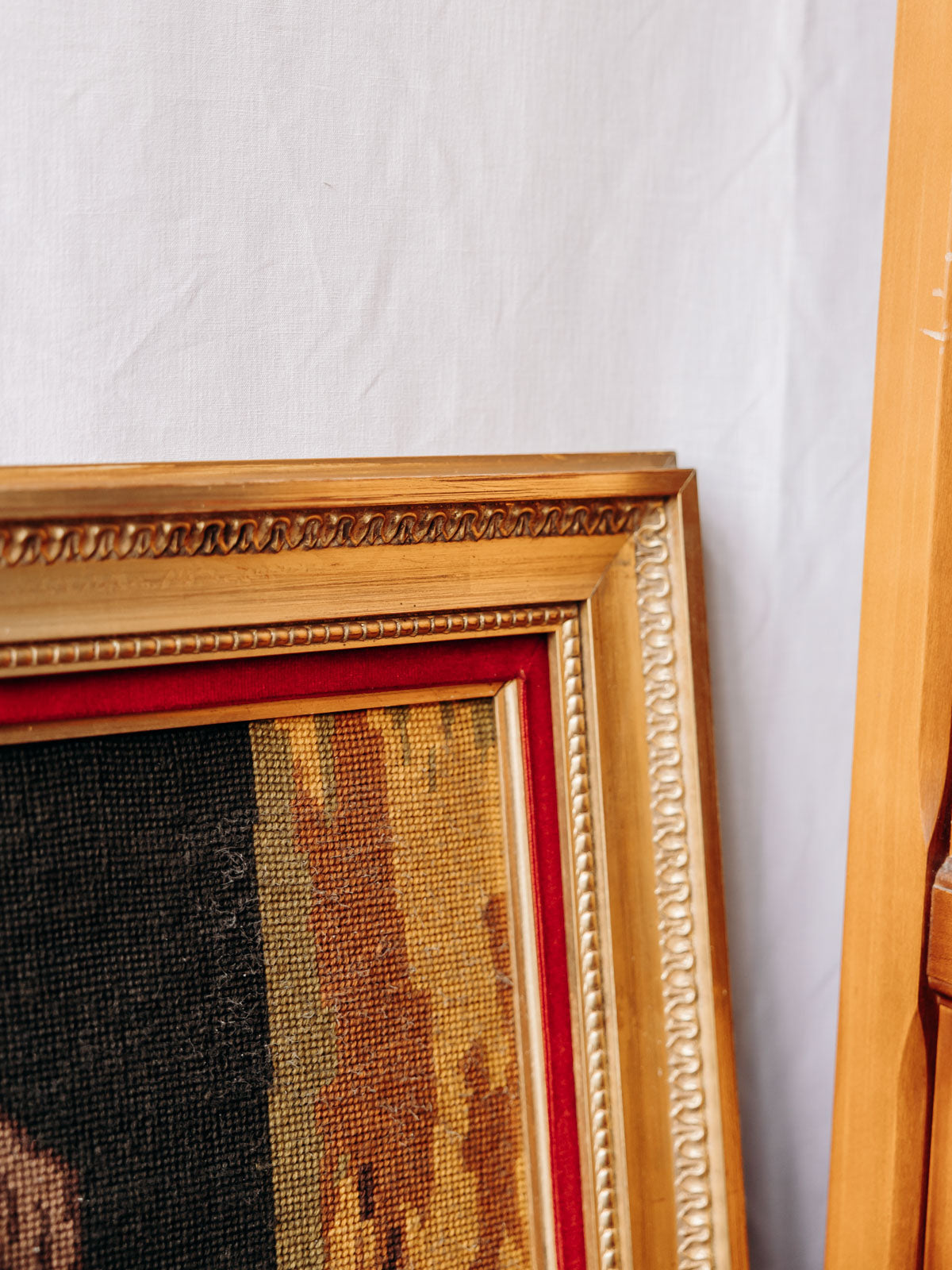 Invite this canvas depicting a woman, set in a gilded wooden frame with a red border, into your home to create an intimate and refined atmosphere. The needlework reveals a pictorial delicacy that captivates the eye, while the gilded frame adds a classic and warm touch. Its vertical and slender format makes it ideal above a sideboard, in an entryway, or along a hallway, complementing both contemporary and more traditional interiors.