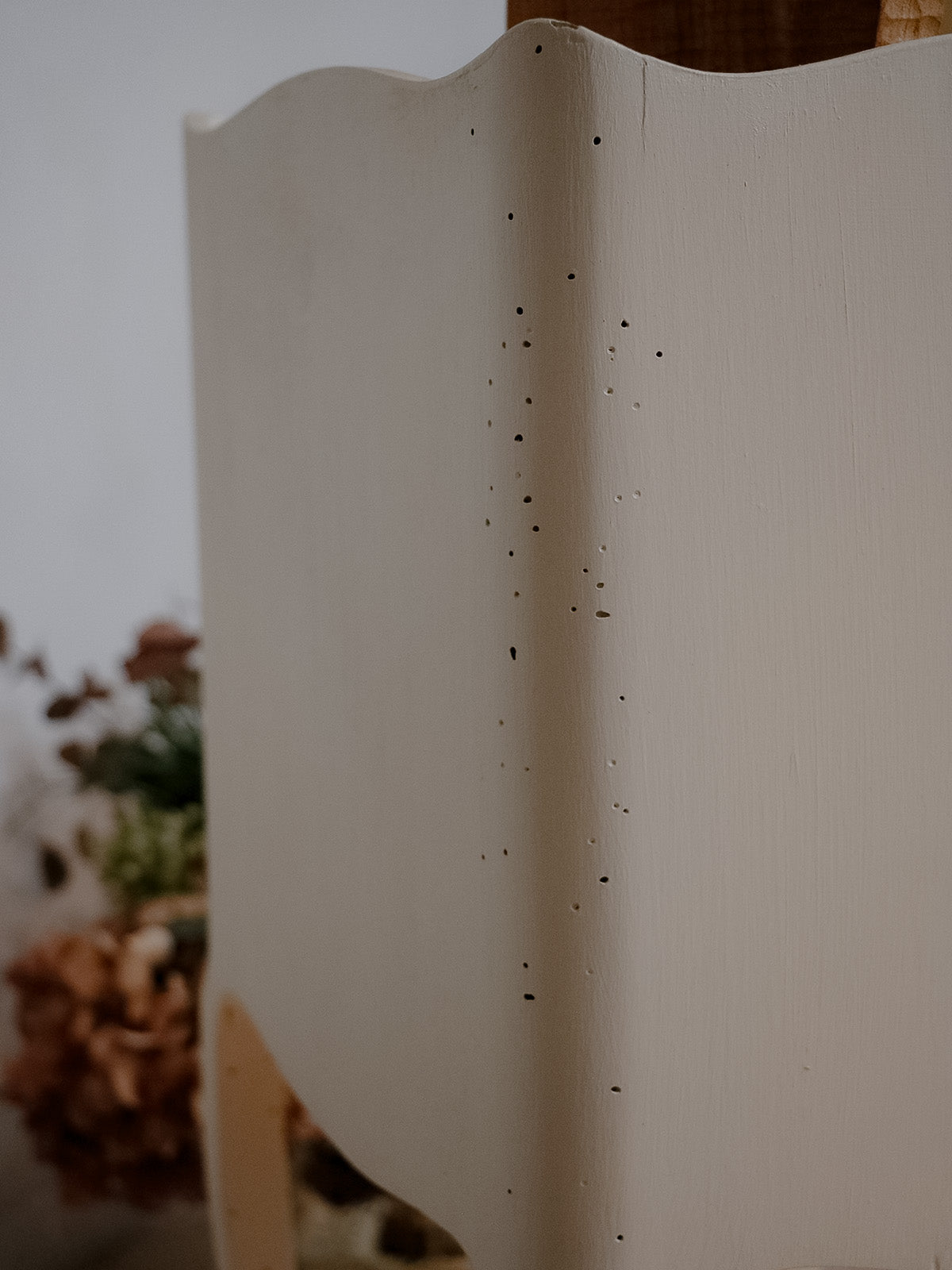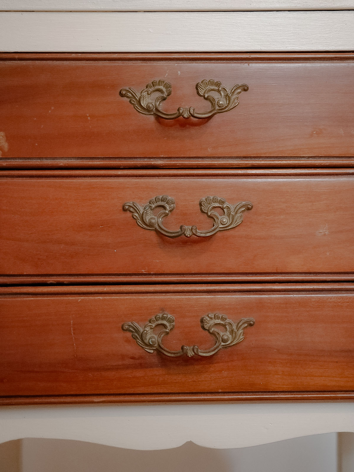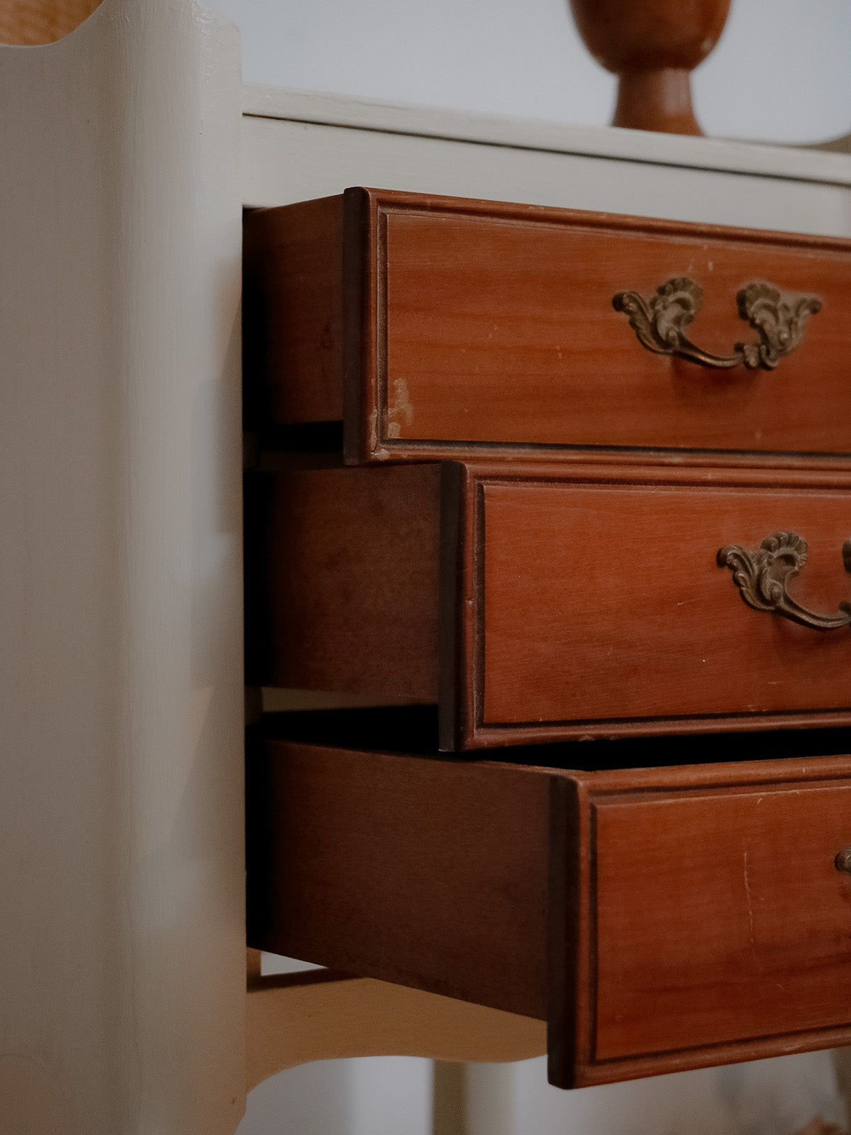 Elevate your bedroom with this off-white solid wood bedside table featuring three dark wood drawers with original brass handles. Its compact proportions offer organized storage for books, a lamp, and personal belongings, while the curved legs and natural patina lend it an elegant and inviting look. Minor signs of wear have been treated.