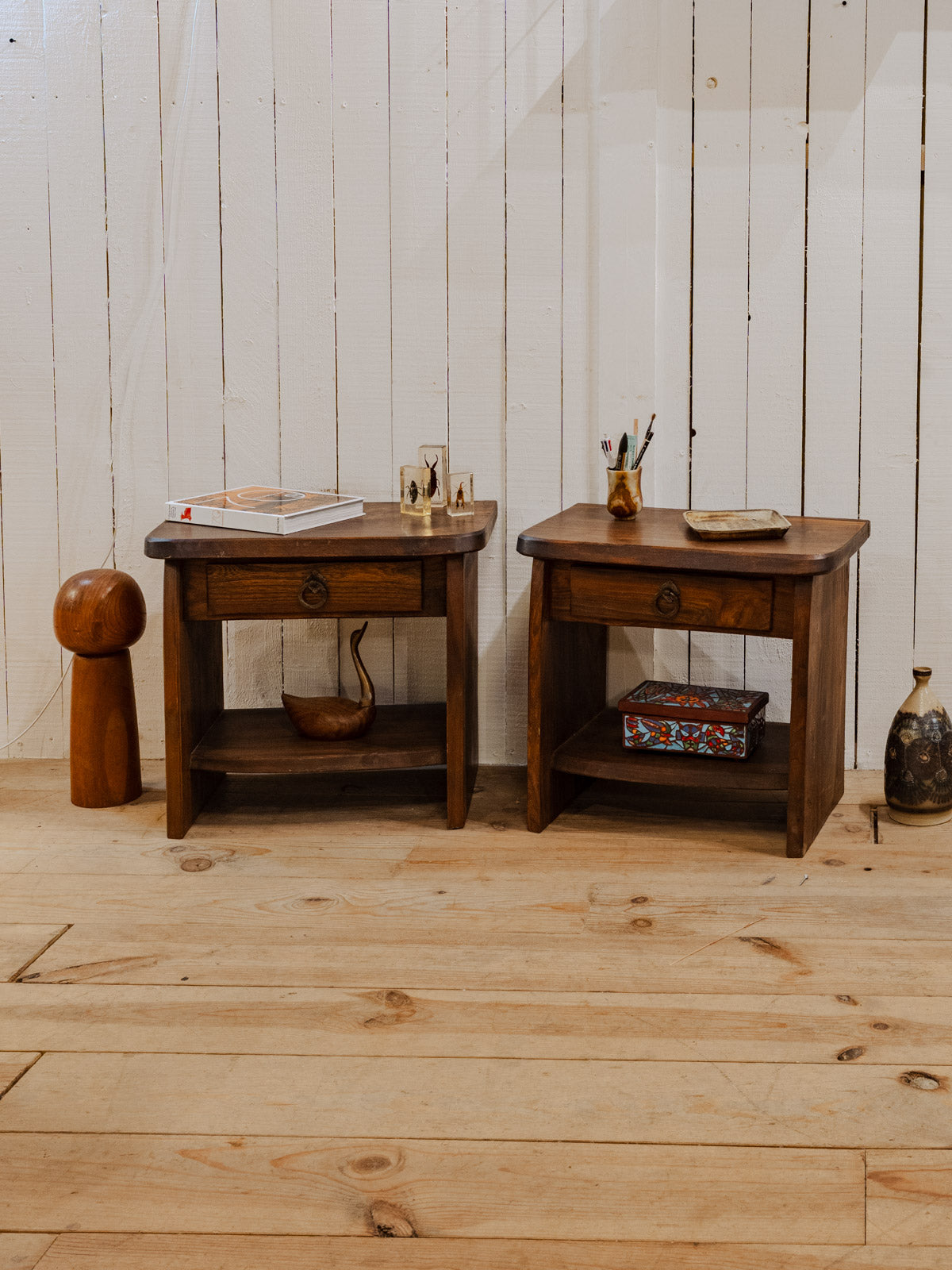 Choose this pair of wooden bedside tables, with their simple yet warm design enhanced by metal handles. Their size and proportions include a drawer and a shelf below, perfect for keeping your books and other items within easy reach, making them ideal for a bedroom with contemporary or classic lines. The finish creates an intimate and elegant atmosphere, easily paired with natural textiles. Some signs of age are present.
