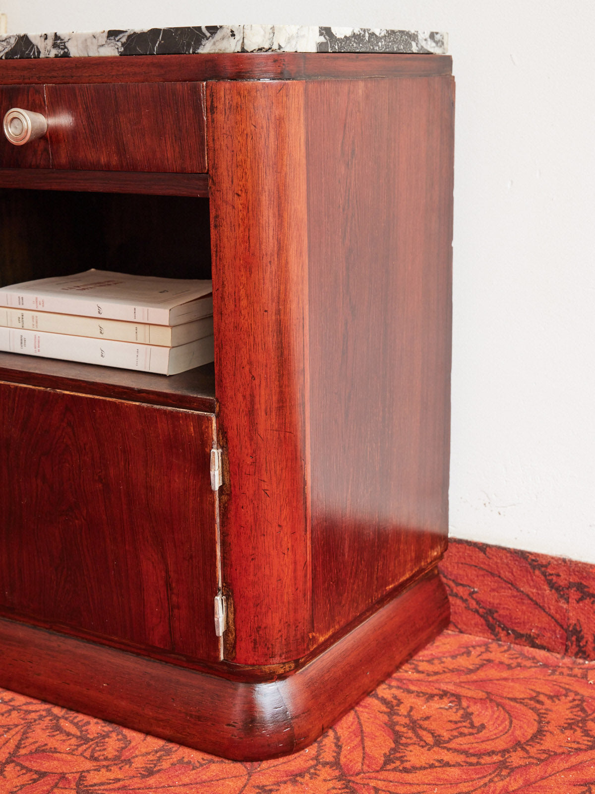 Bring this varnished wood bedside table to your bedroom, enhanced by a black and white marble top that creates a refined and understated contrast. Its compact proportions offer practical storage with a discreet drawer and an open niche for your books or everyday items, perfect for an elegant yet functional bedside table. The combination of varnished wood and marble creates a warm and sophisticated atmosphere, blending tradition and modernity.