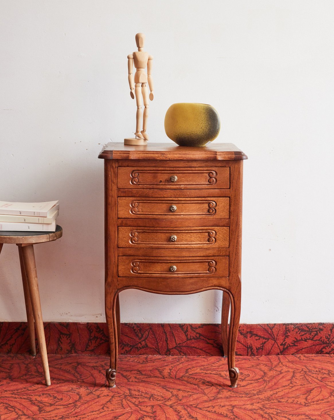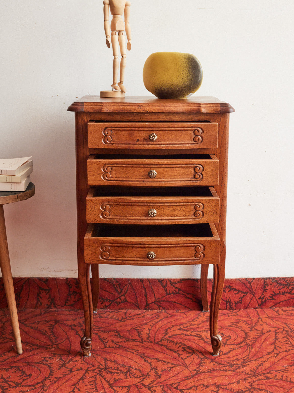Choose this four-drawer wooden bedside table, with its clean lines and warm essence that invites a sense of tranquility to the bedroom. Its well-proportioned drawers offer neat storage for books, chargers, and small items, while the natural finish highlights the wood grain and texture. Its understated silhouette also makes it suitable as a side table in an entryway or living room, creating a calming and organized atmosphere.