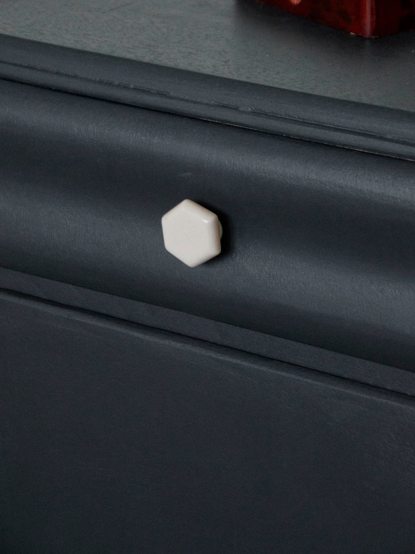 Discover this pair of wooden bedside tables with a clean design. Each unit combines a drawer and a cupboard for neat and tidy storage. The hexagonal handles add a geometric and contemporary touch, while the small feet lighten the silhouette and promote visual flow in the bedroom. Designed to hold your nighttime essentials, they blend seamlessly into both contemporary décor and a warmer, more intimate atmosphere.
