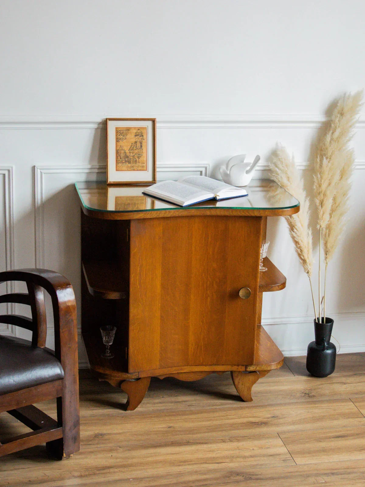 Choose this large oak bedside table, enhanced by a rounded glass top, where the warmth of the wood and the curved legs create an elegant and organic silhouette. Its side shelves offer modular storage, and its generous proportions allow you to place a lamp, books, and everyday objects on it while maintaining an airy feel. Minor chips on the glass tops.